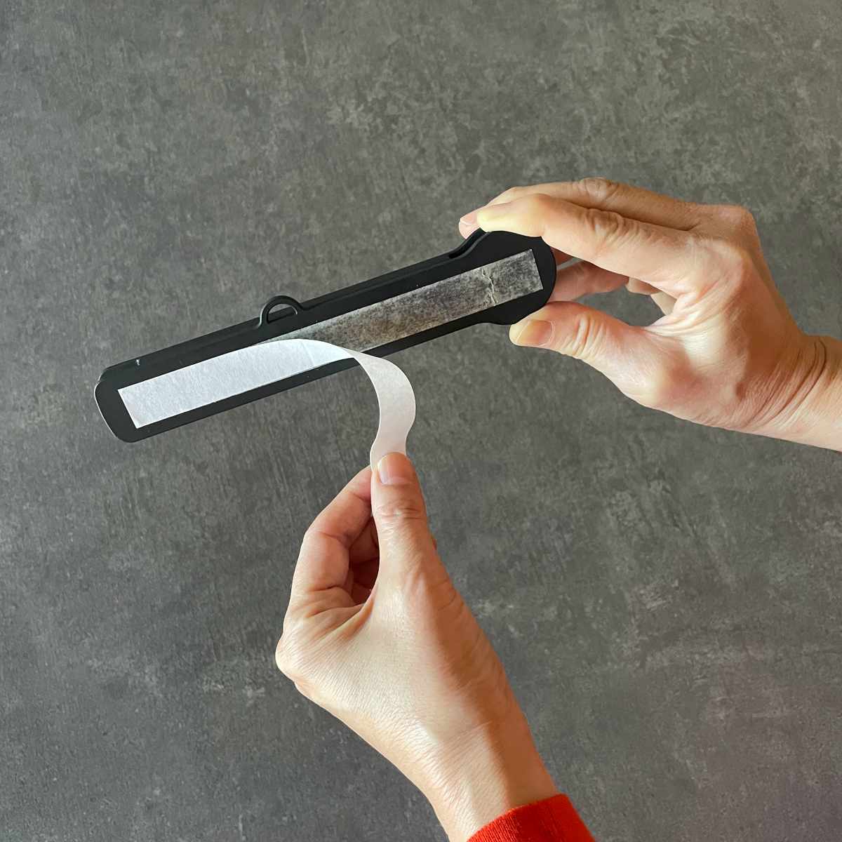 濡れた手でくっついて取りにくい、複数枚が一度に出てしまうなど、使い捨て手袋の煩わしさを解消する専用クリップ付きです。フック穴と両面テープが付属しているので、設置場所を選びません。