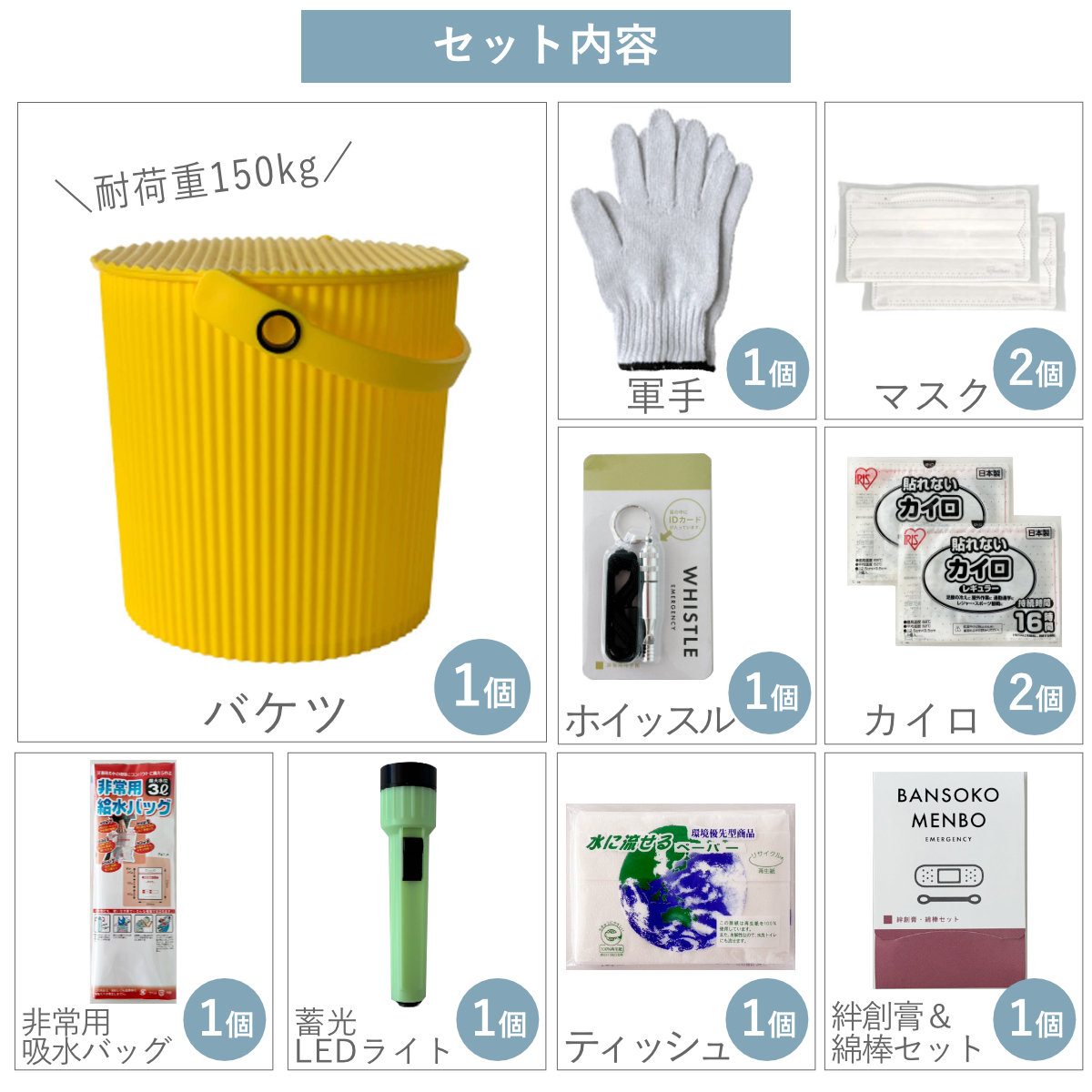 | 内容量 | バケツ、軍手、防災ホイッスル、ティッシュ、LEDライト、アルミブランケット、絆創膏&綿棒セット、非常用給水バッグ:各1個 マスク2枚 カイロ2個 携帯トイレ3個 |