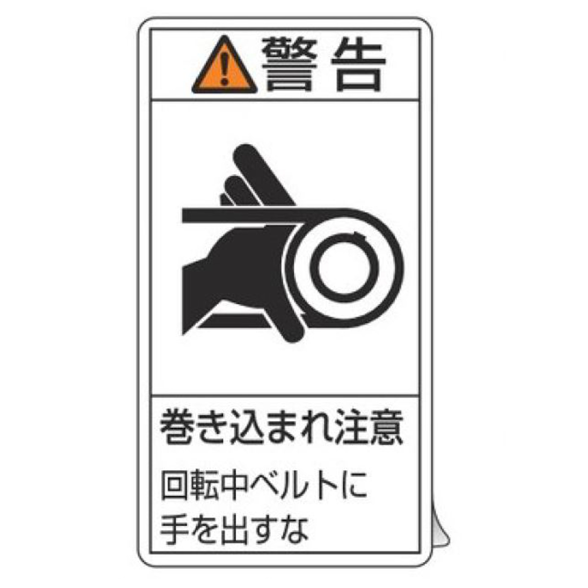 PL警告表示ラベル 「 警告 巻き込まれ注意 回転中ベルトに手を出すな 」 小 7×3.8cm タテ型 10枚組 ( ステッカー 10枚 表示シール 表示 表示シート 縦 7×3.8センチ PL法対策 指示 注意喚起 標示 看板 安全用品 )