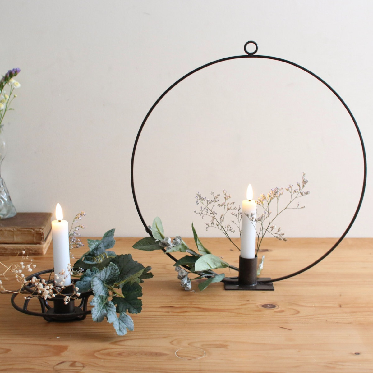 周囲にアレンジメントを施せるような余白がございます。キャンドルだけでなく、ドライフラワーやオブジェとの組み合わせなどアイディアが広がります。
