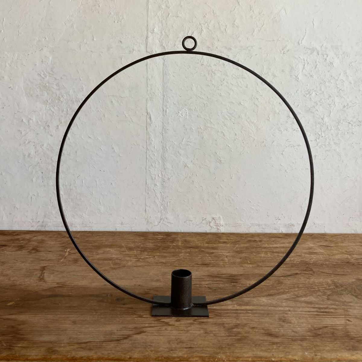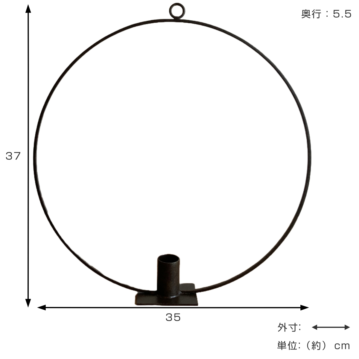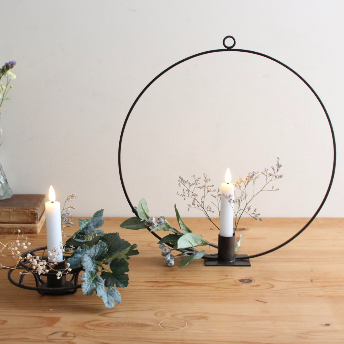 リースを作れるようなリング形で、壁に掛けられる吊り環付きです。キャンドルだけでなく、ドライフラワーなどの組み合わせで華やかになります。