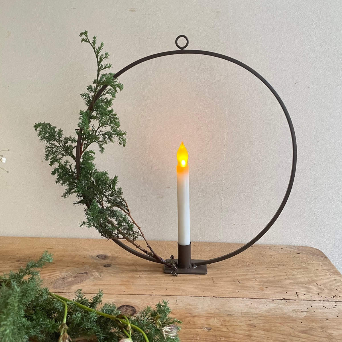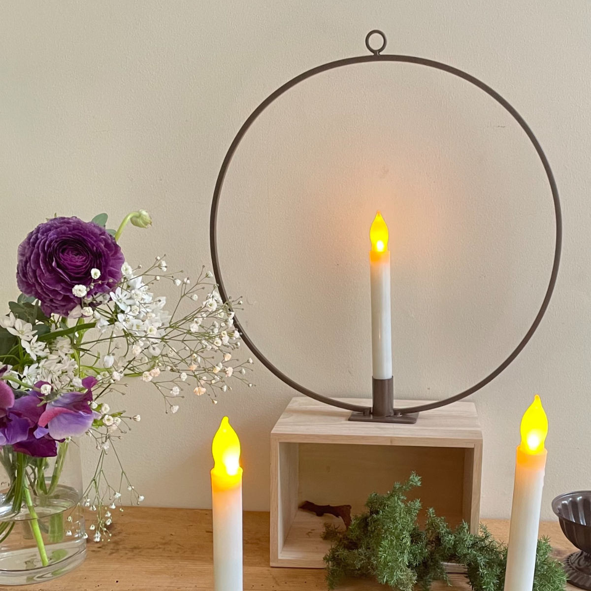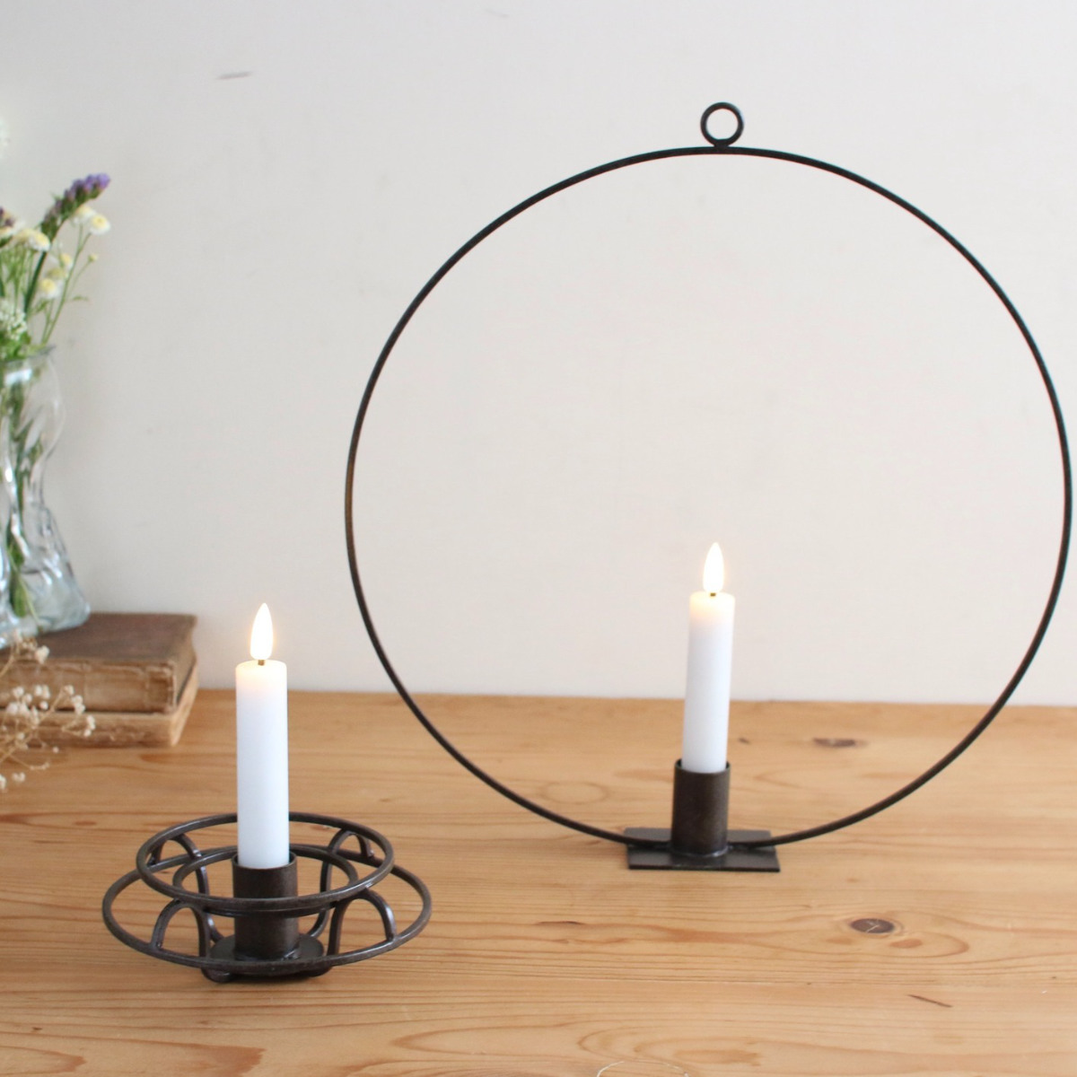 リースを作れるようなリング形で、壁に掛けられる吊り環付きです。キャンドルだけでなく、ドライフラワーなどの組み合わせで華やかになります。