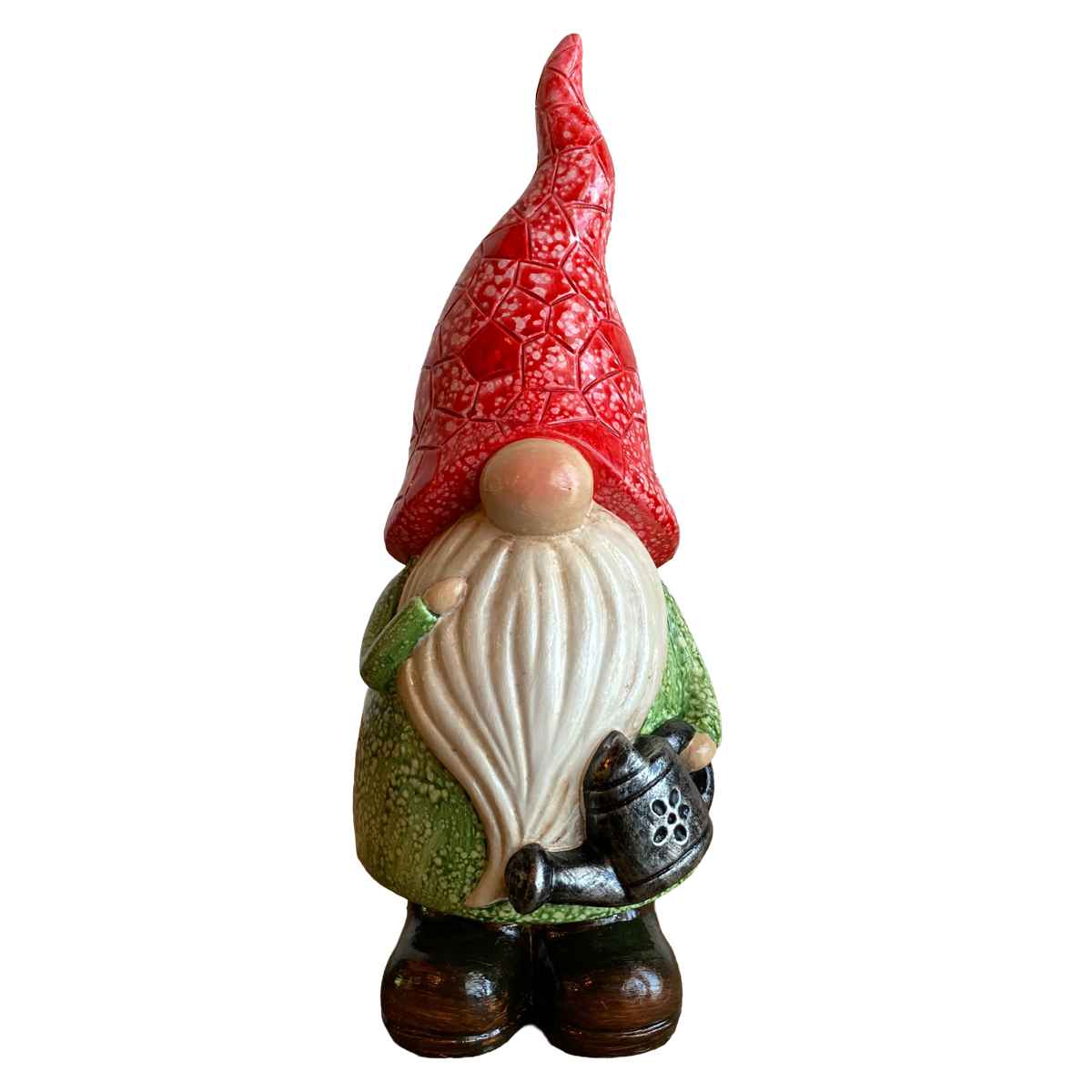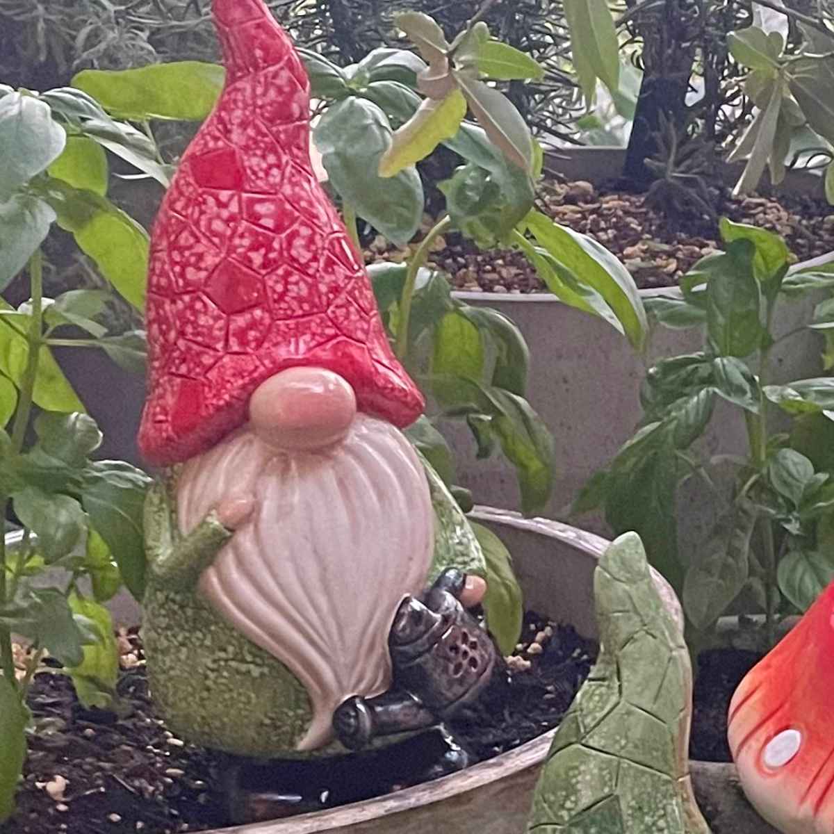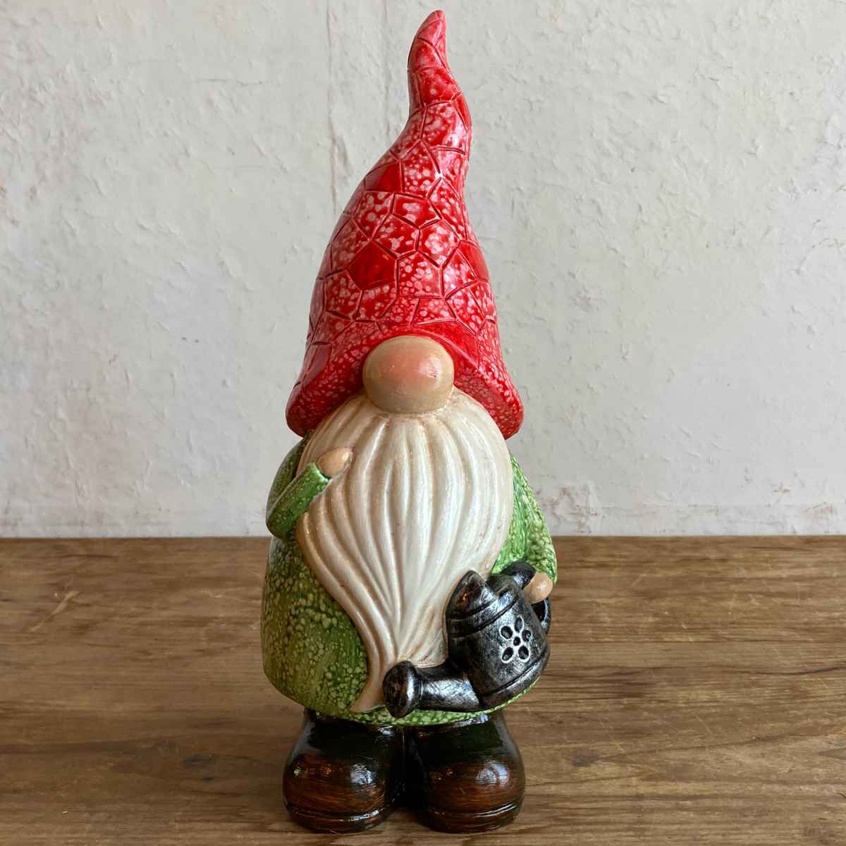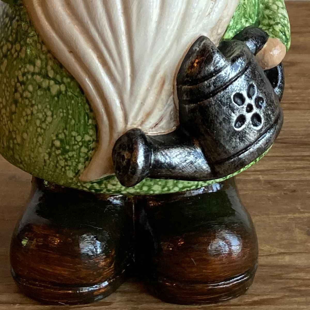 手にジョウロを持ったキュートな姿のガーデンノームです。今にも動き出して、水やりをお手伝いしてくれそうです。