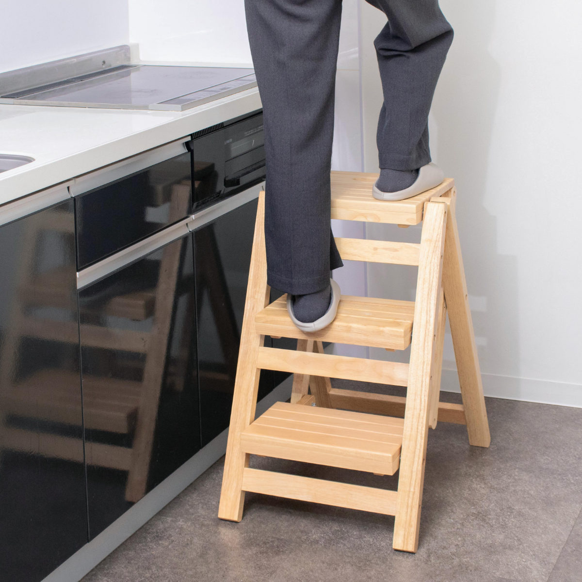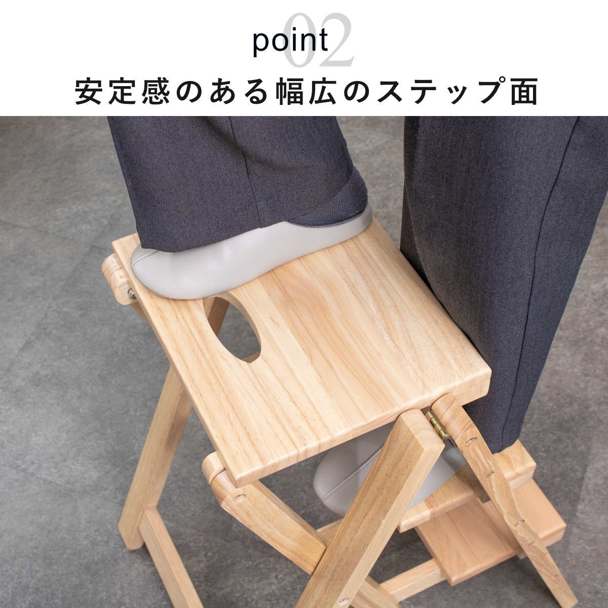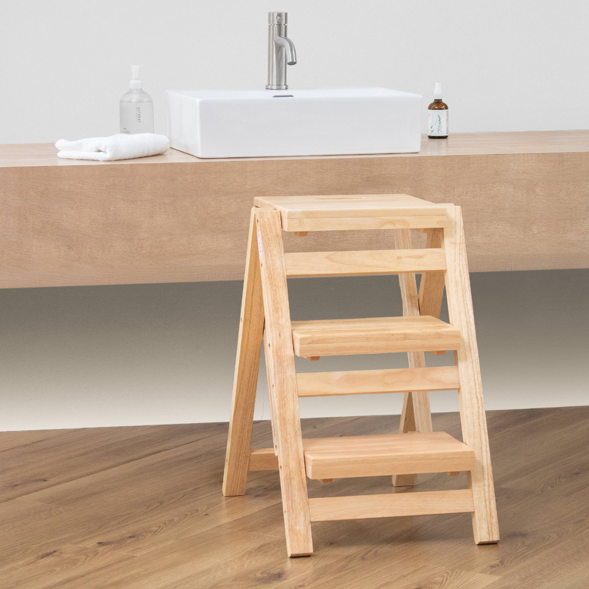 幅広設計のステップ面で、足をしっかり乗せて安定した上り下りが可能です。天板に乗ってもぐらつきにくく、お子さまの洗面所での使用にも安心です。