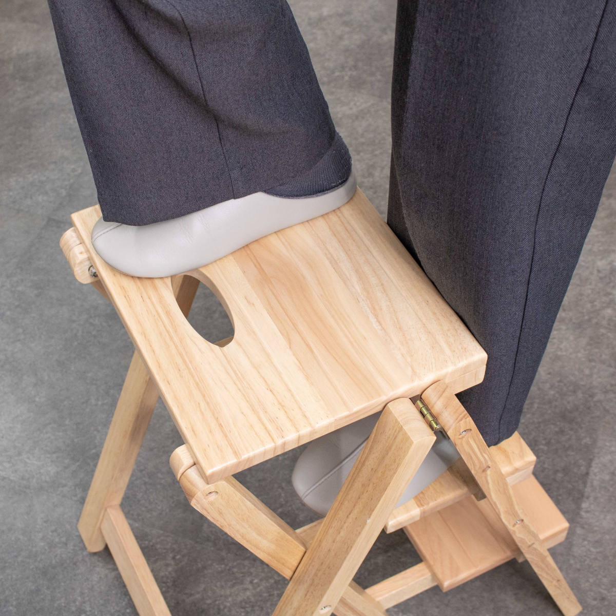 座面の取っ手を持ち上げるだけで簡単に折りたためます。また、使いたい時はサッと広げて、すぐに使えます。