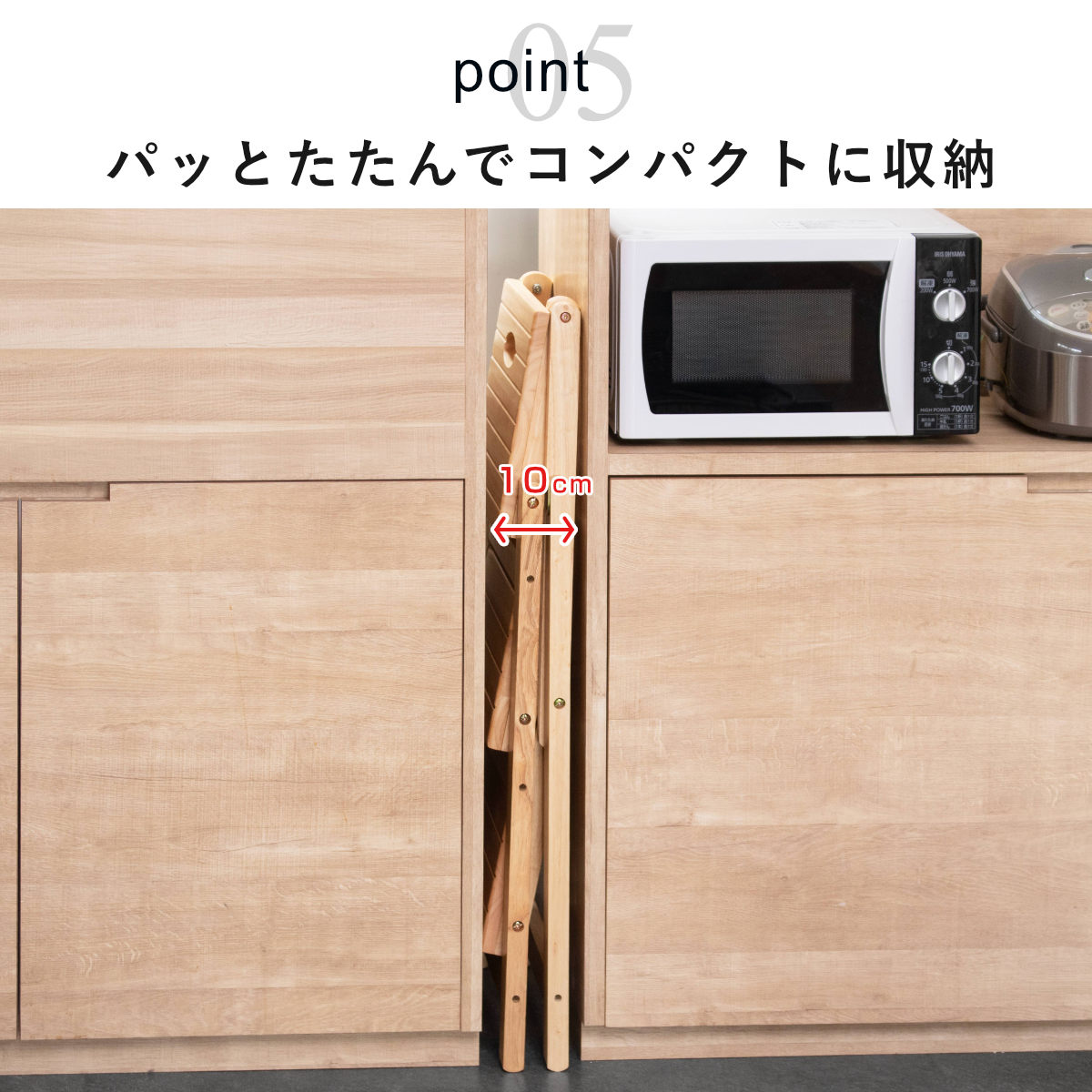 折りたたむと厚さ約10cmのスリム設計。ちょっとしたすき間にもすっきり収まります。