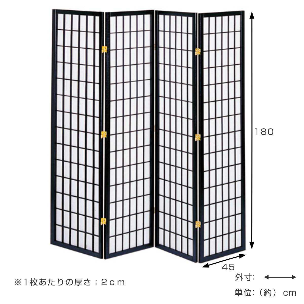 | サイズ | 約 幅45×厚み2×高さ180(cm)×4連 折りたたみ時のサイズ:約 幅45×厚み8.5×高さ150(cm) |