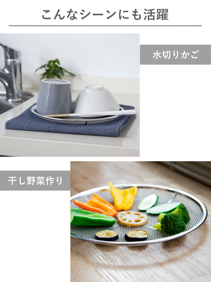 平らな形状で食材を平たく並べることができるので、効率的に水切りできます。蒸気もこもりにくく粗熱取りにも最適です。