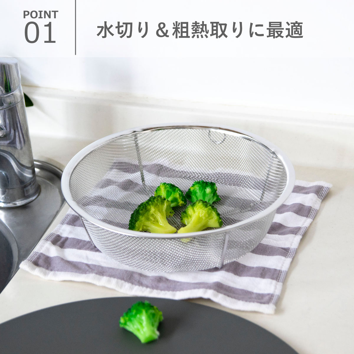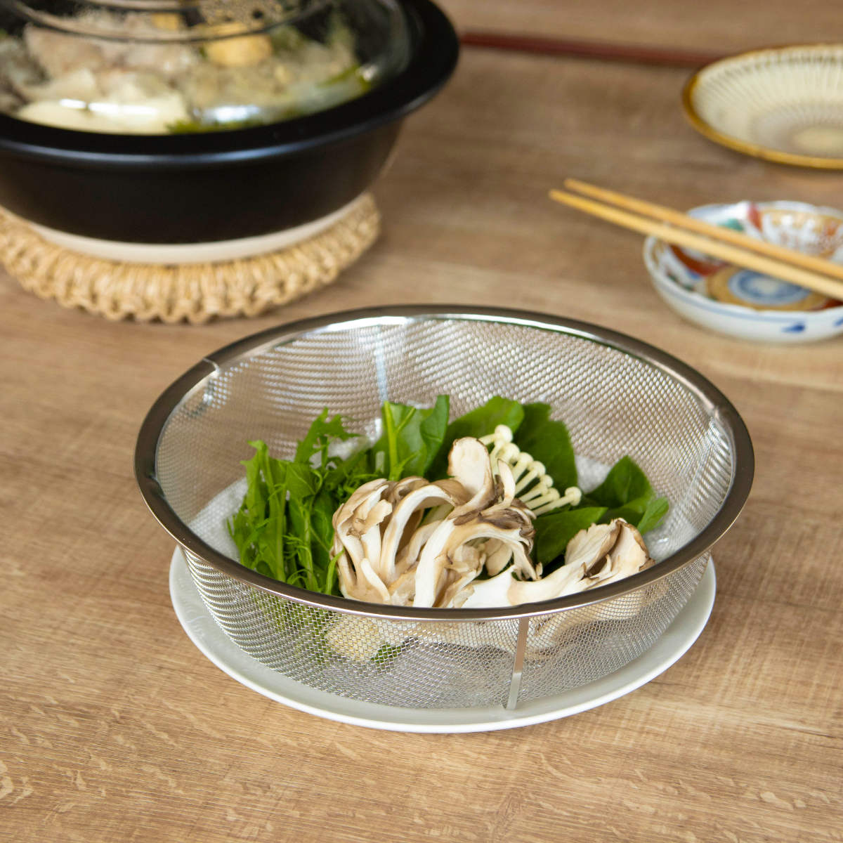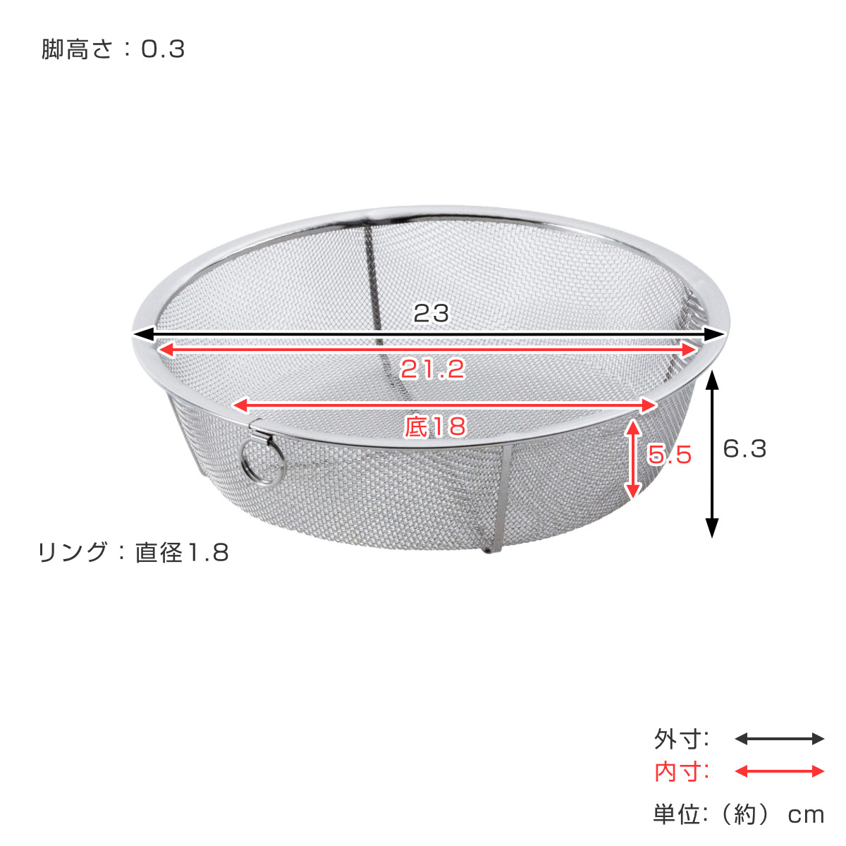 関連キーワード:天ぷら網 フライ網 油切り網 トレイ ステンレス製 18-8ステンレス キッチン用品 キッチン雑貨 調理小道具 調理用品 調理小物 調理ざる 調理用ざる 脚付き 保存 容器 台所 コランダー 丸 素麺 うどん そば 下準備 盛り付け スタッキング シルバー シンプル おすすめ オススメ 便利 役立つ サビにくい 錆びにくい 高級感 食洗機OK 引掛け 収納 コンパクト 直径23cm 高さ6.3cm