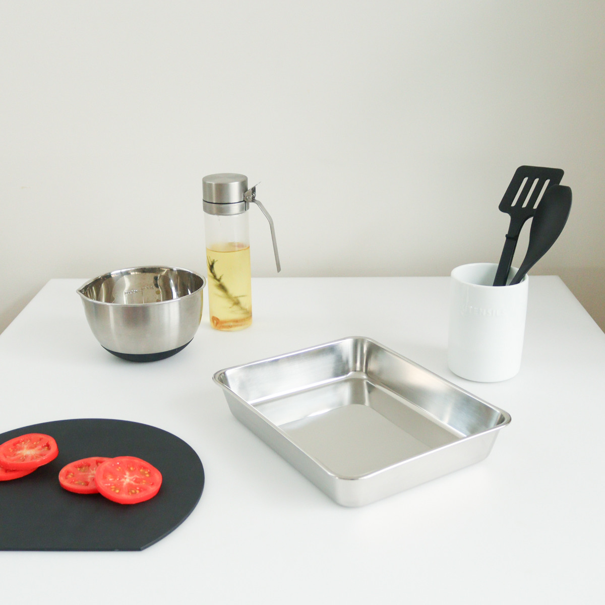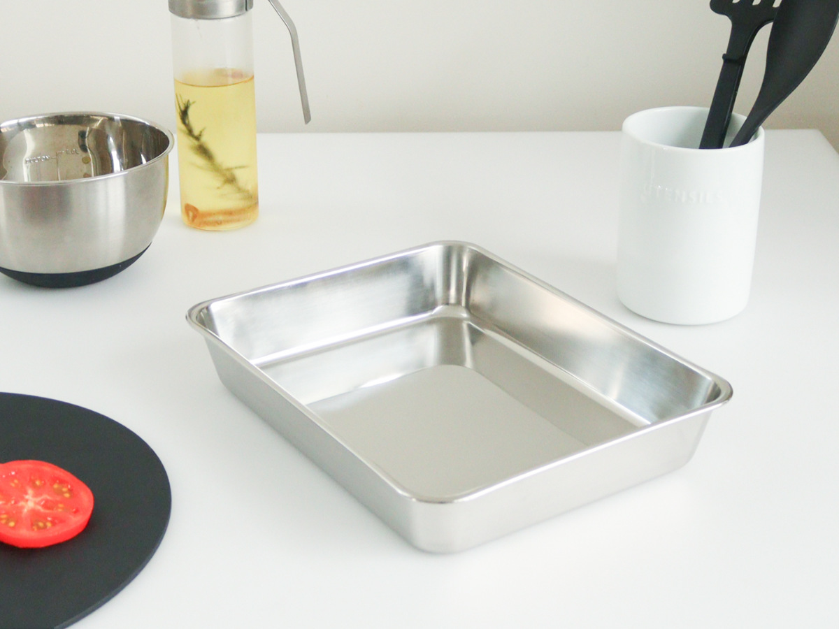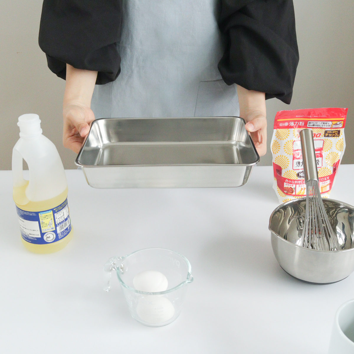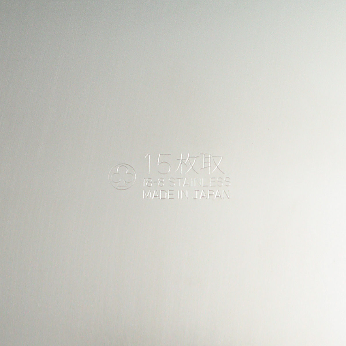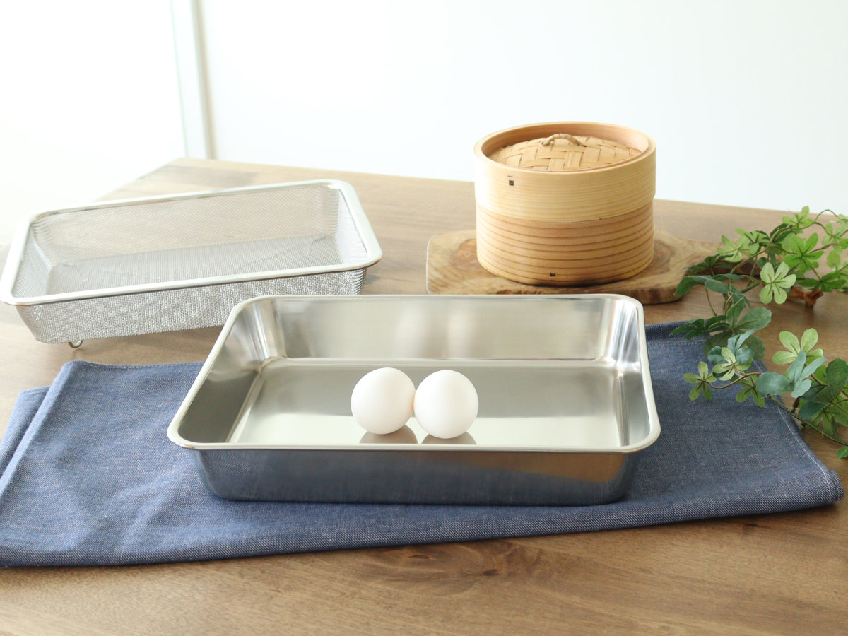 丈夫で美しいステンレス製調理器具を手がける、工房アイザワの【角バット 15枚取(幅29.7cm)】です。ステンレスは耐久性に優れており、衝撃や変形に強い素材です。長く使っても錆びにくく、美しさを保ちます。