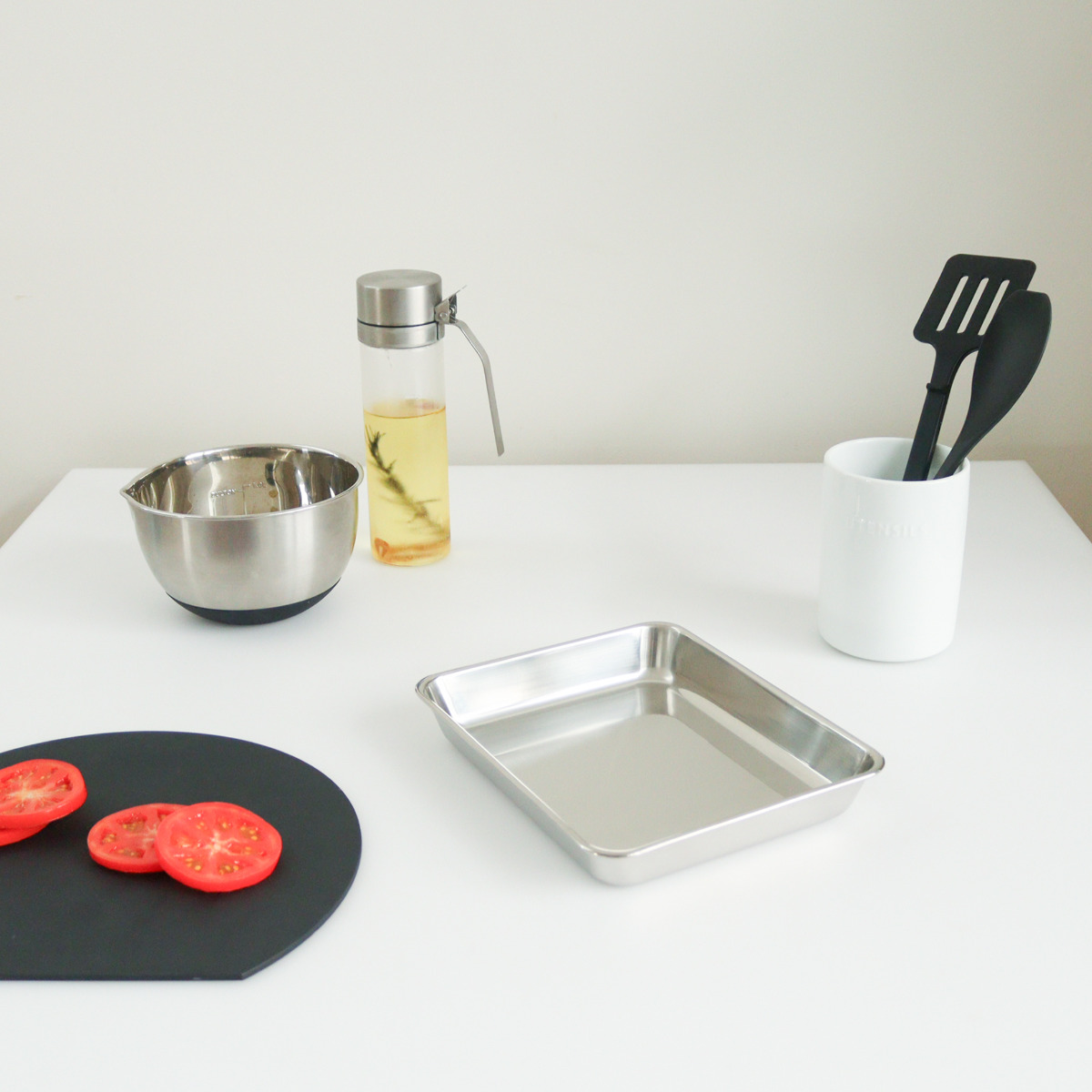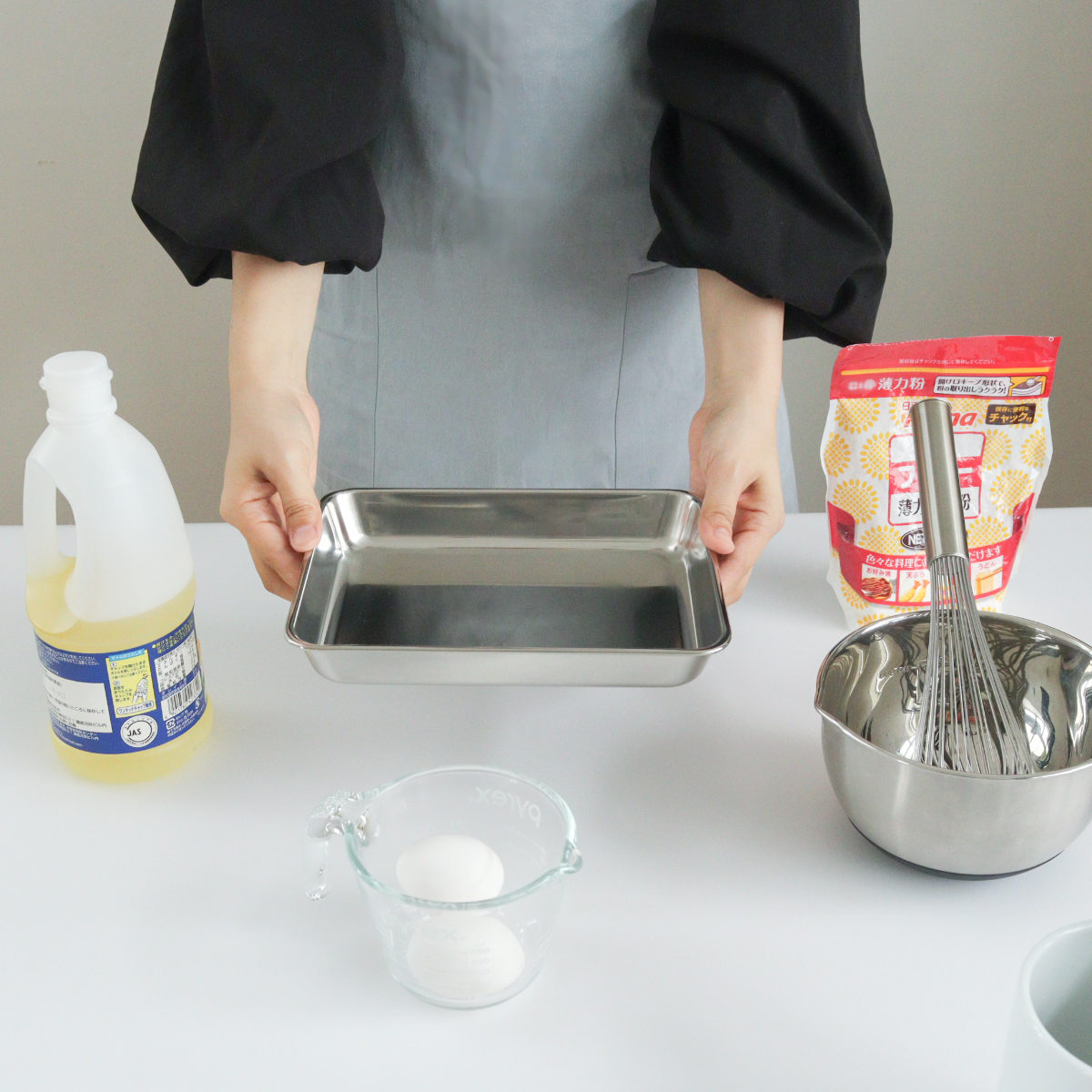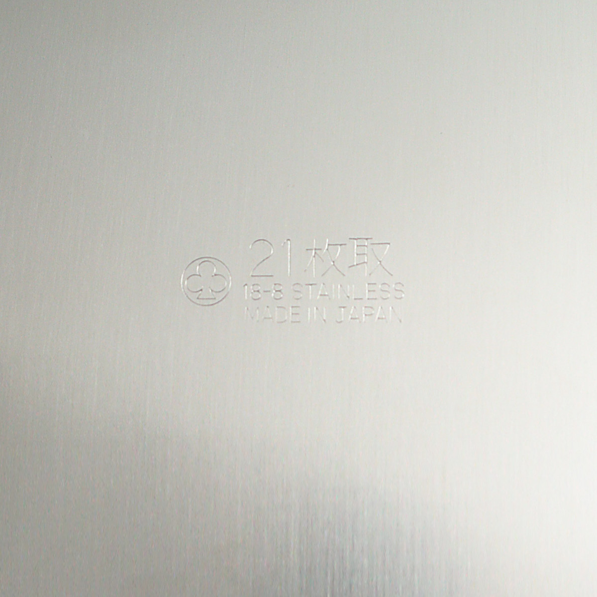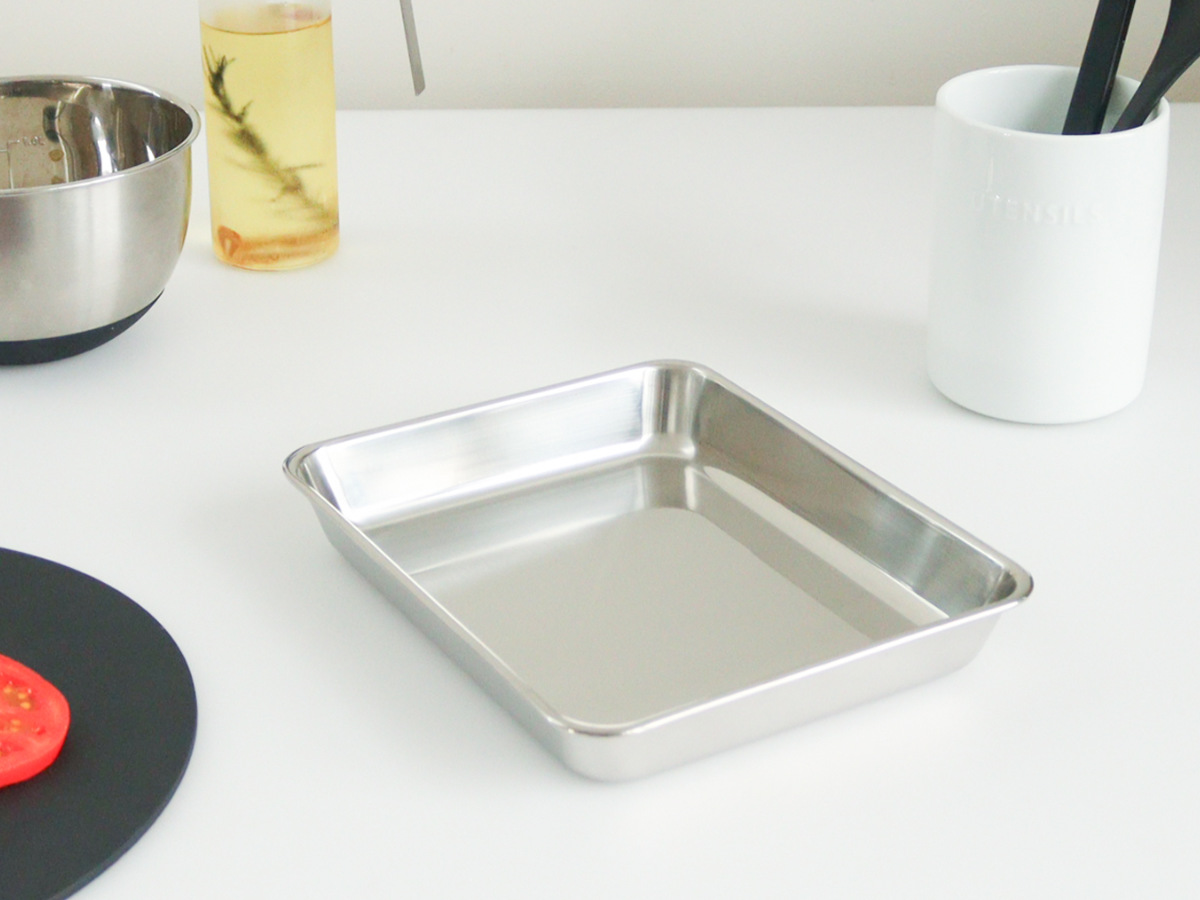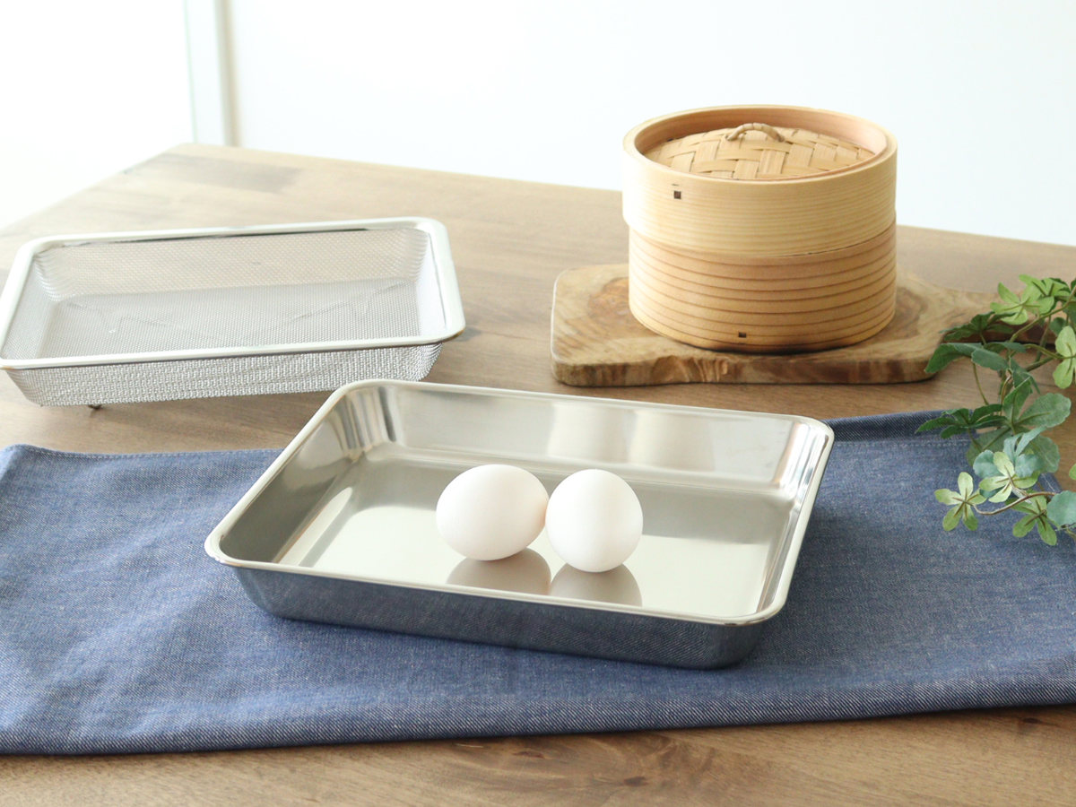 丈夫で美しいステンレス製調理器具を手がける、工房アイザワの【角バット 21枚取(幅24.8cm)】です。ステンレスは耐久性に優れており、衝撃や変形に強い素材です。長く使っても錆びにくく、美しさを保ちます。