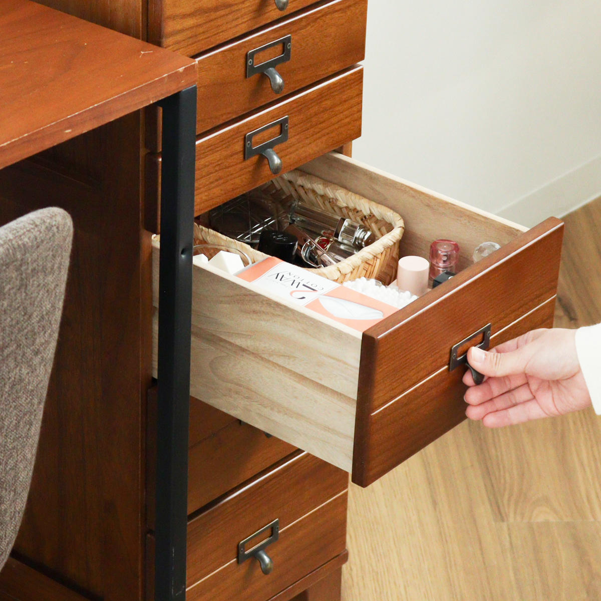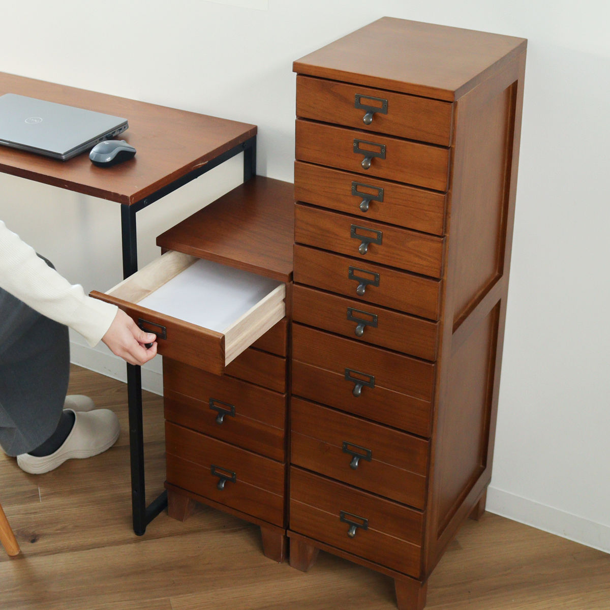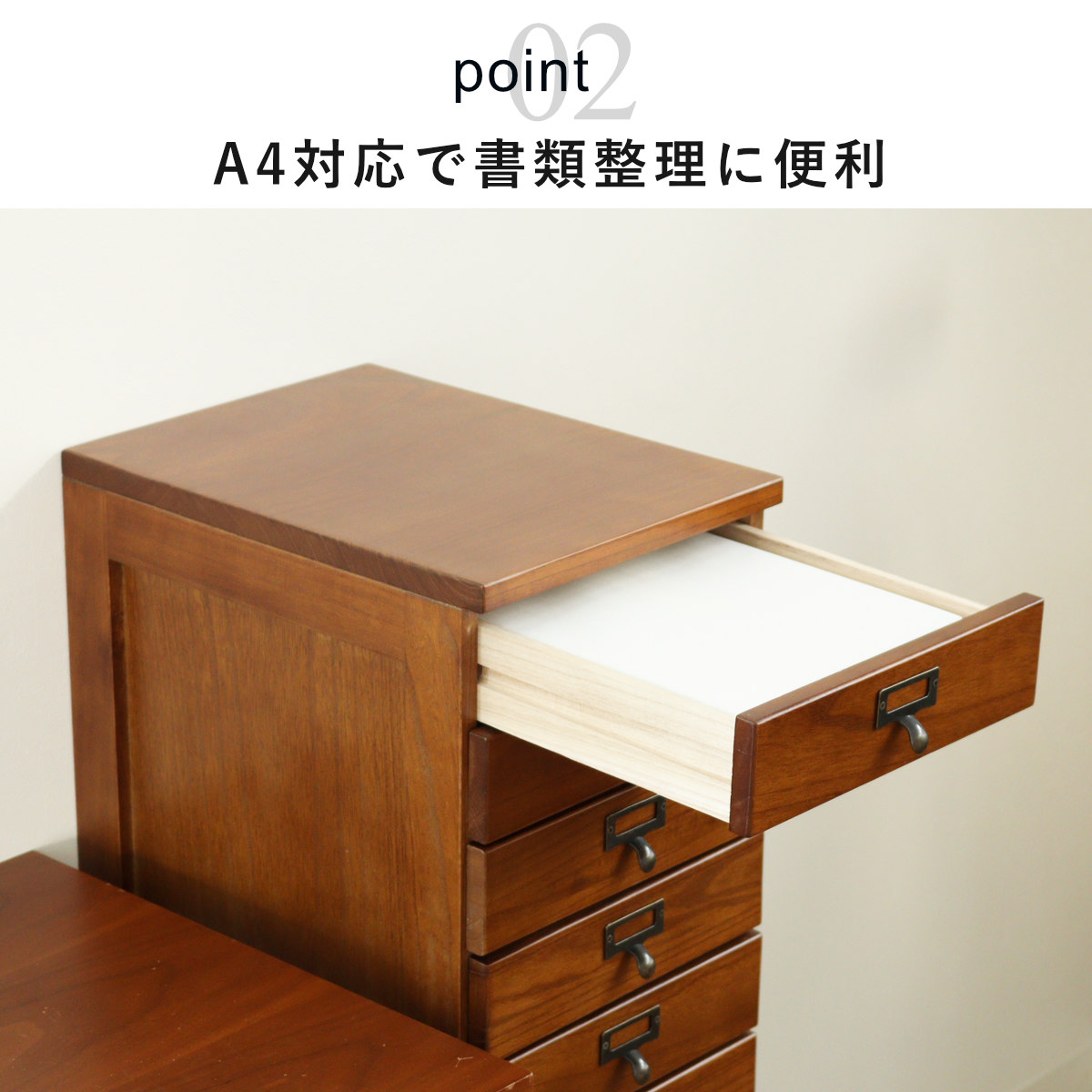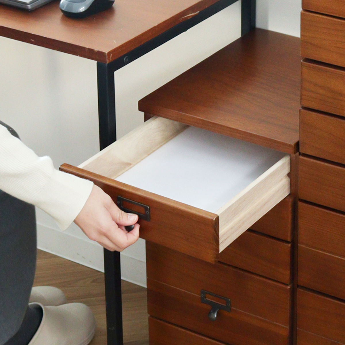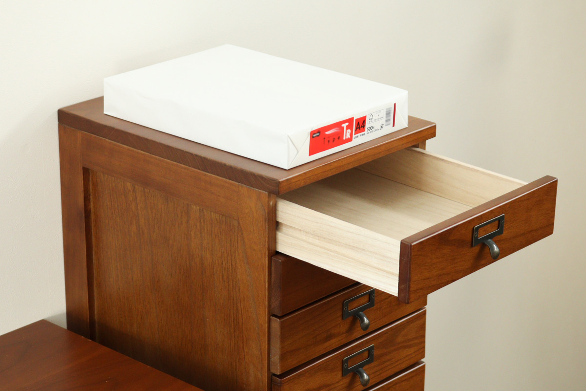引出しはA4サイズのクリアファイルが収まるサイズです。書類や郵便物、プリント類を段ごとに分けて収納でき、必要なものをすぐに取り出せます。