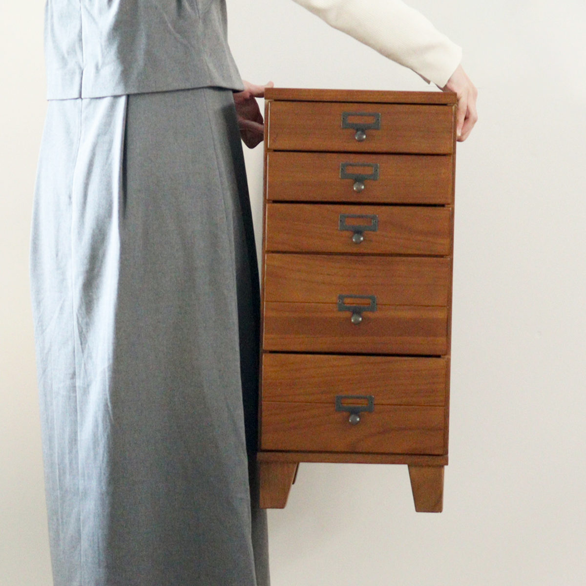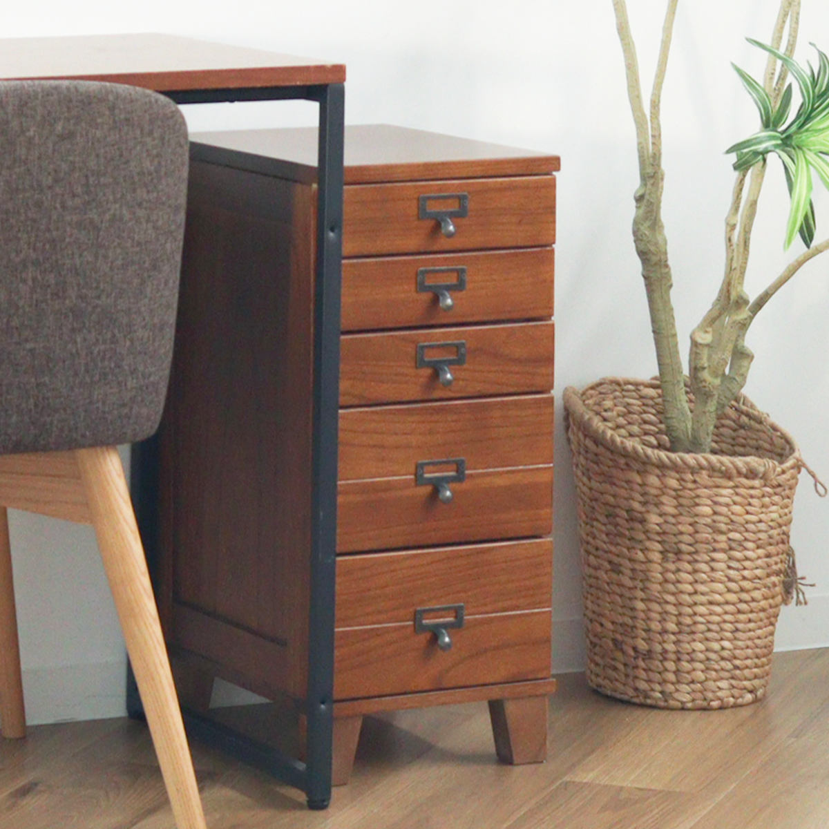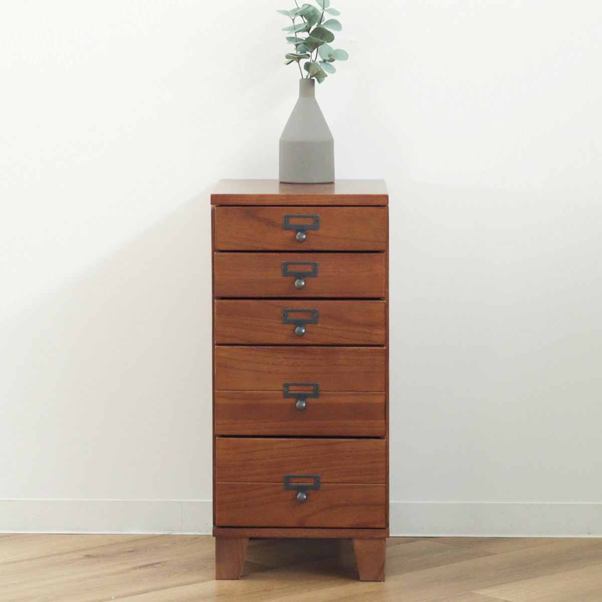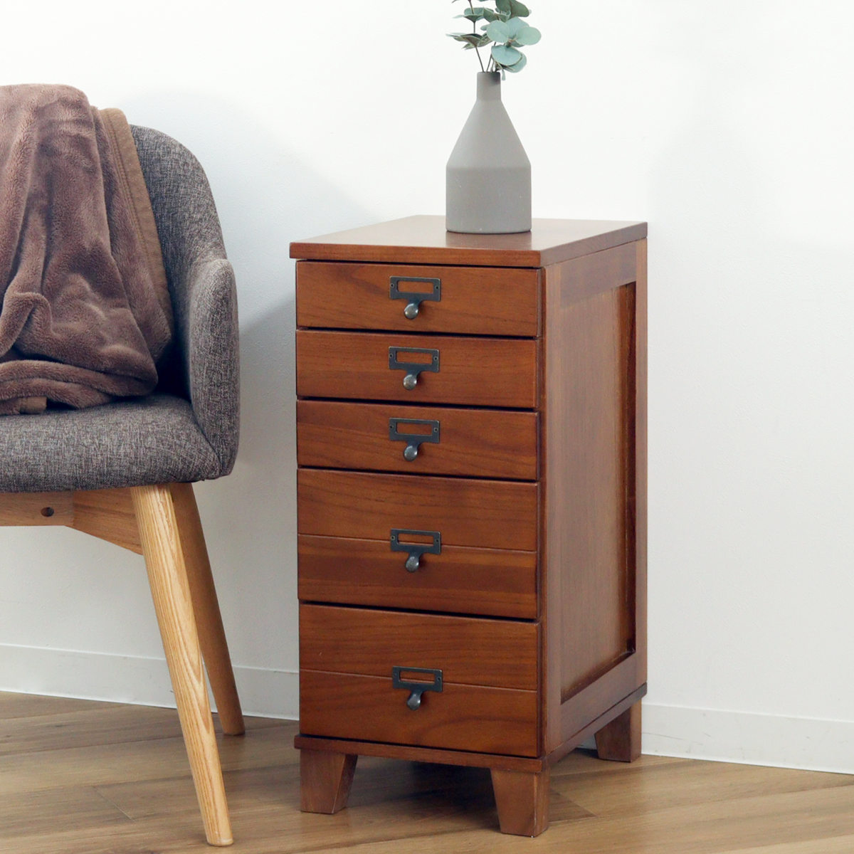 幅28cmのスリム設計で、リビングや書斎、廊下などの限られたスペースにも設置しやすいチェストです。すらりとした縦型デザインで圧迫感を抑えつつ、5段構造でしっかり収納力も確保。完成品でお届けするため、届いたその日からすぐにお使いいただけます。