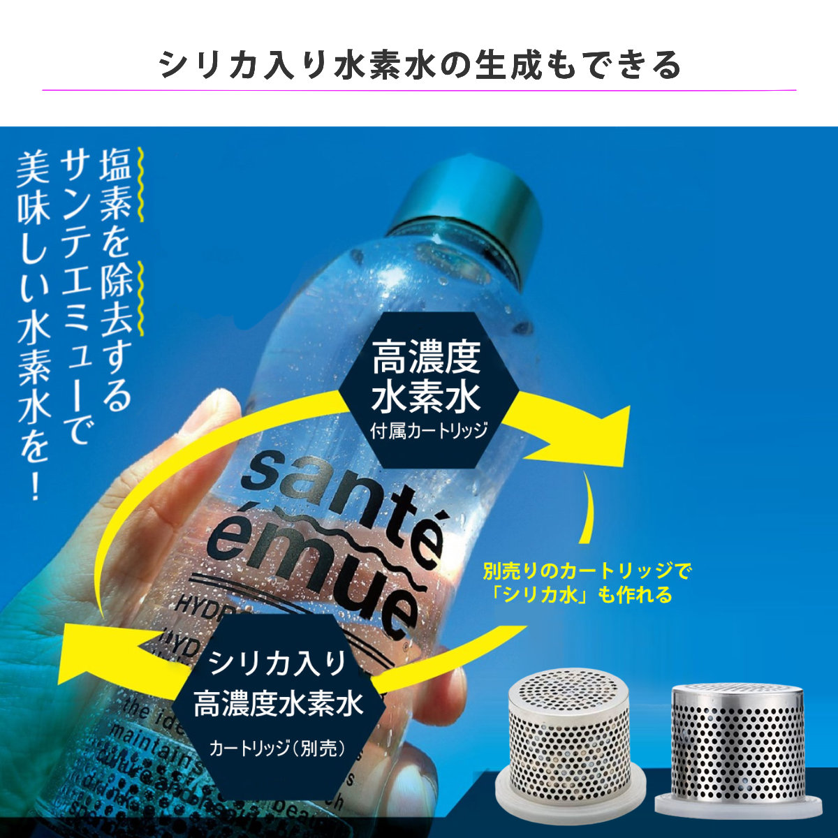 ●サンテエミューで水素水ができるのは、お水(ミネラルウォーター・水道水・お湯)に限られます。
