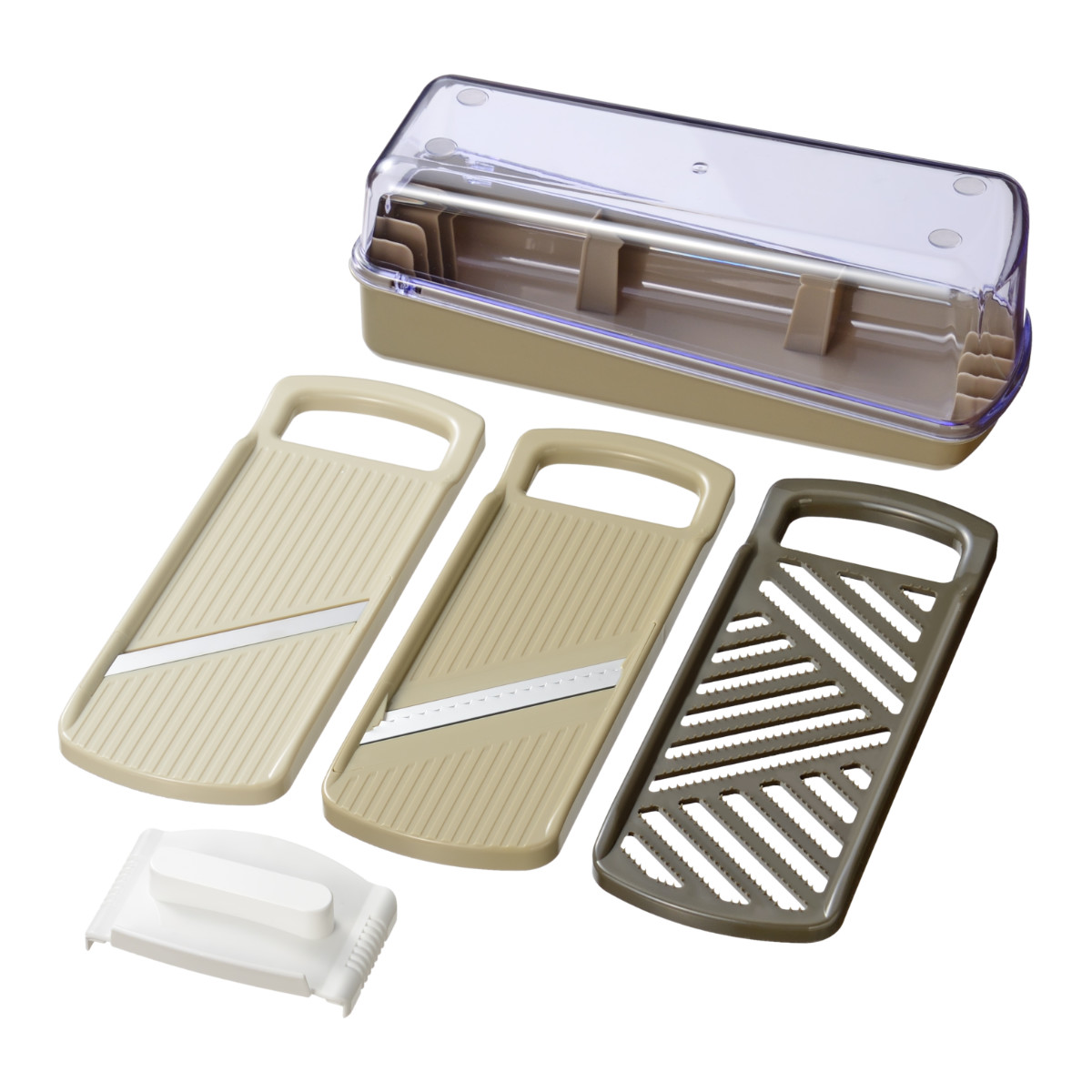 スライサー、千切り、おろし、安全ホルダー、収納ケース、容器の6点セットです。