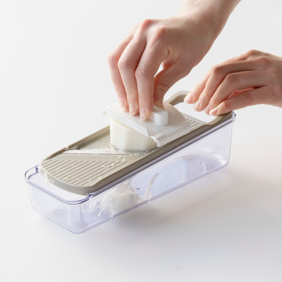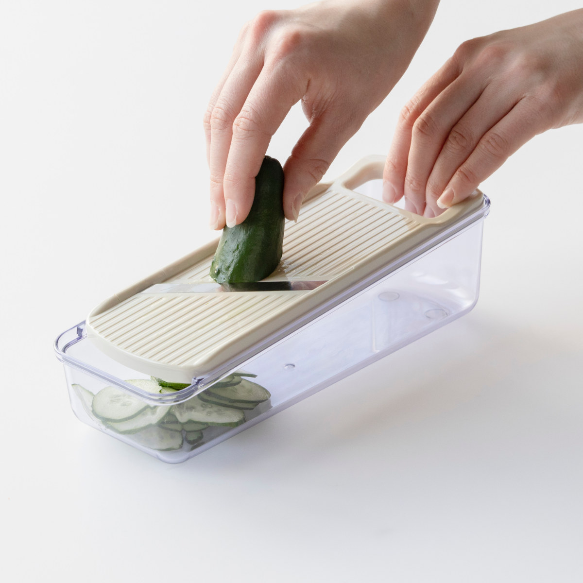 スライスした食材は、付属の受け容器にそのままキャッチできます。すべり止めが付いているので安定感があり、安心して作業できます。