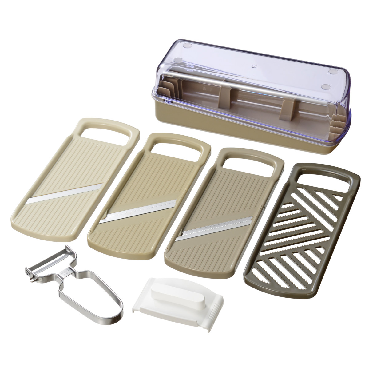 | 材質 | プレート類・収納ケース:ABS樹脂 刃:ステンレス鋼 安全ホルダー:ポリプロピレン 受け容器:AS樹脂 ピーラー:ステンレス鋼 |