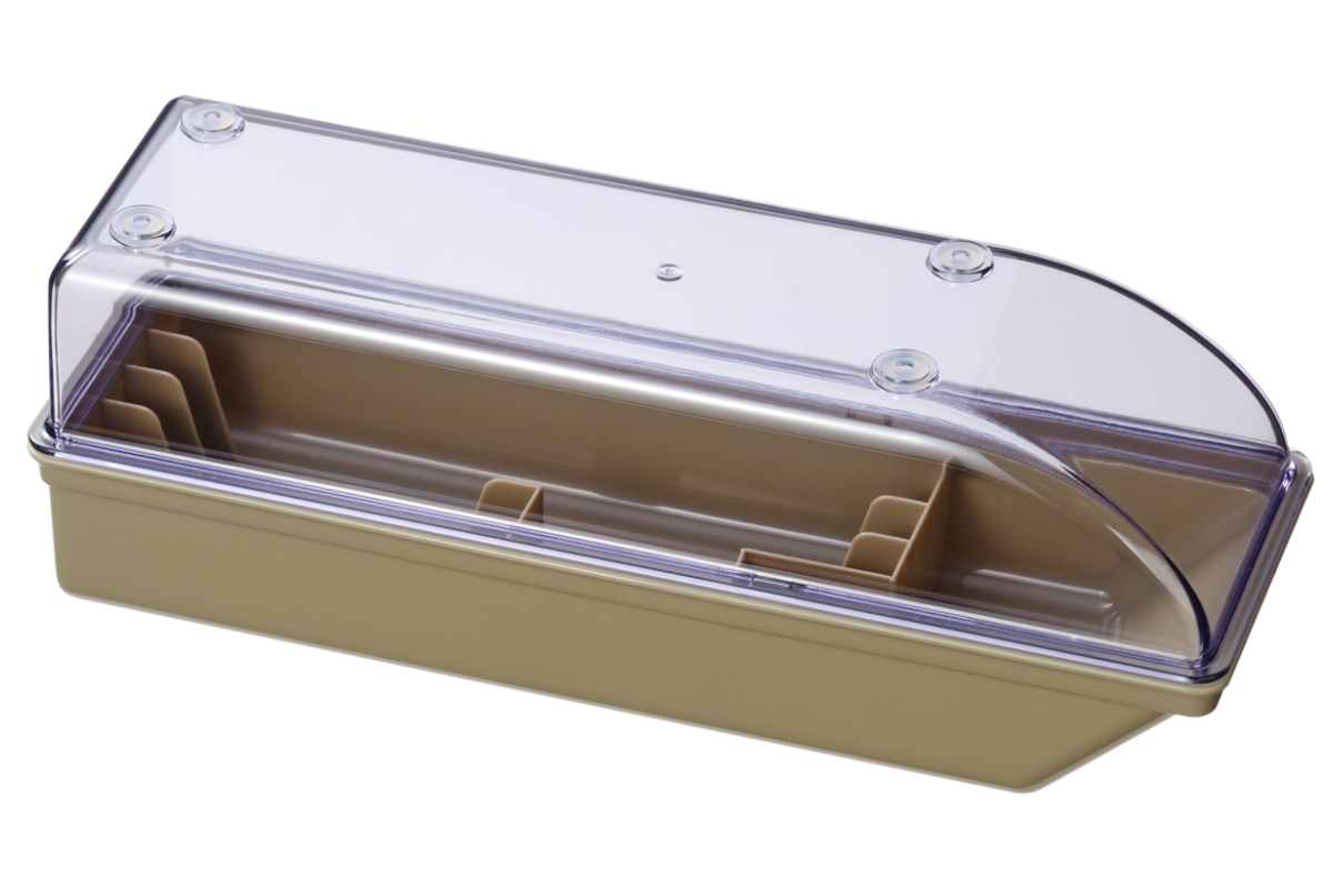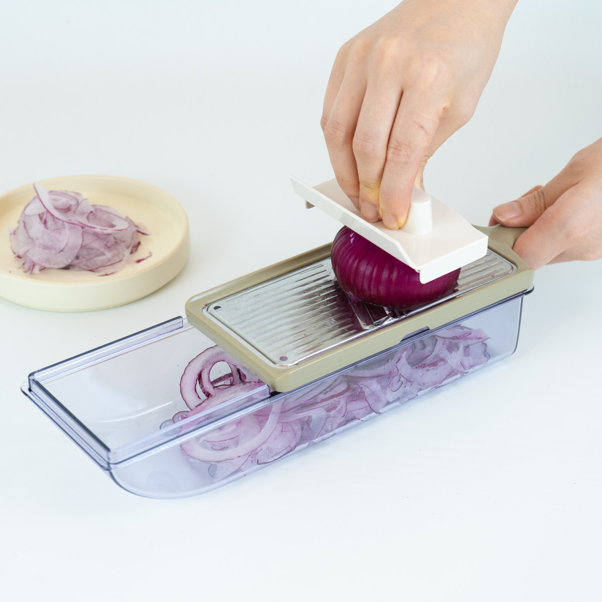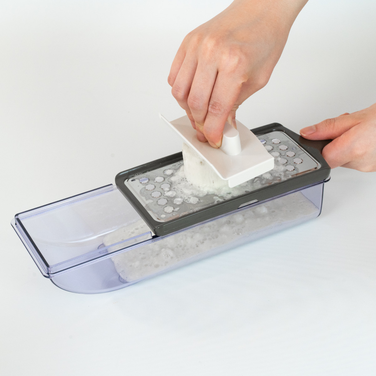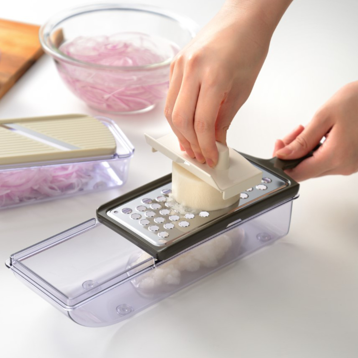 スライスした食材は、付属の受け容器にそのままキャッチできます。すべてのパーツを収納ケースにまとめて保管できるので、使わないときもすっきり片づきます。