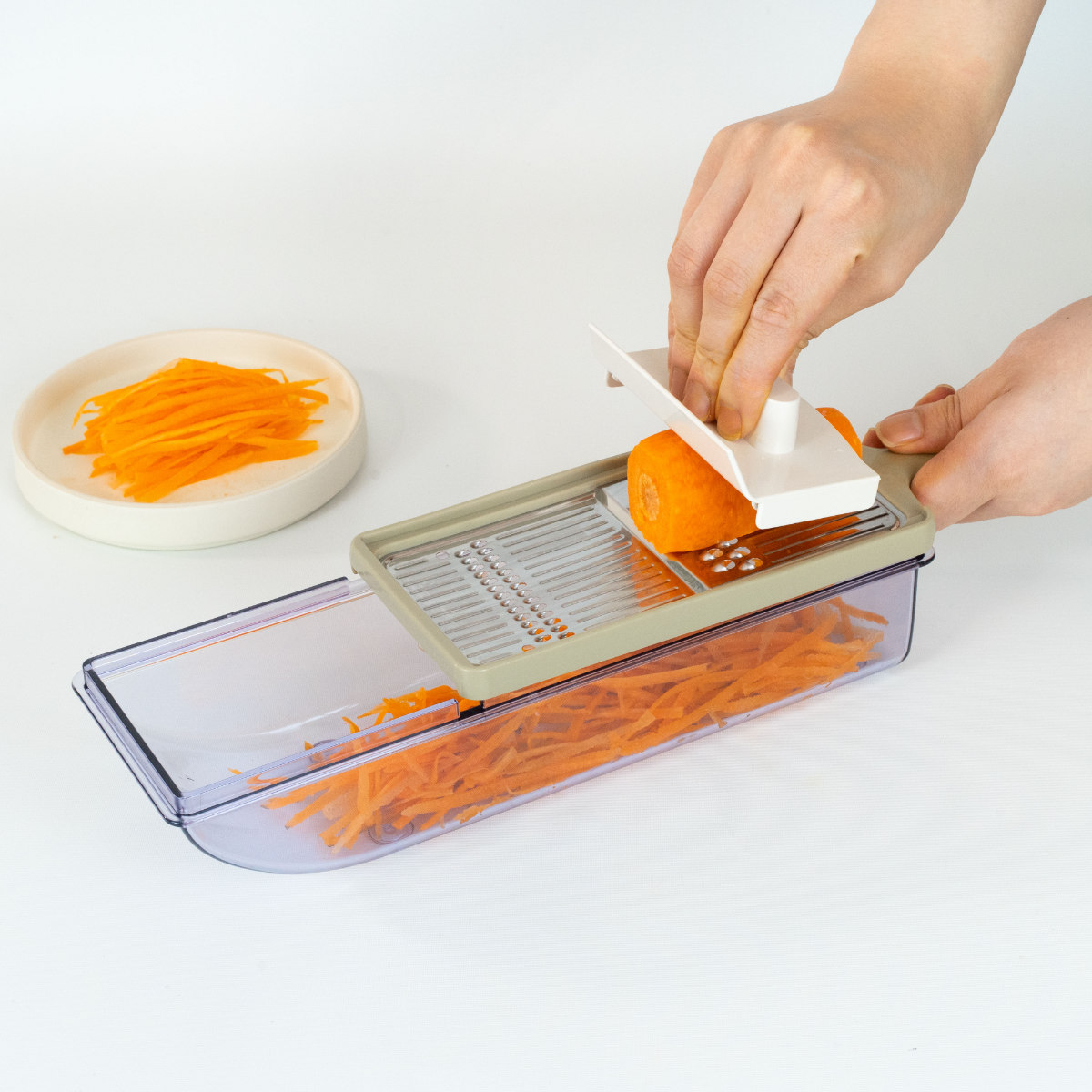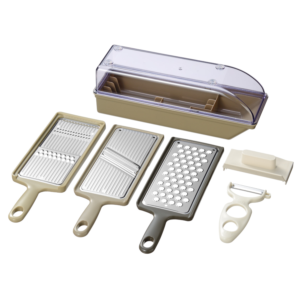 スライサー、千切り・つま切り、おろし、三徳ピーラー、安全ホルダー、収納ケース、容器の7点セットです。
