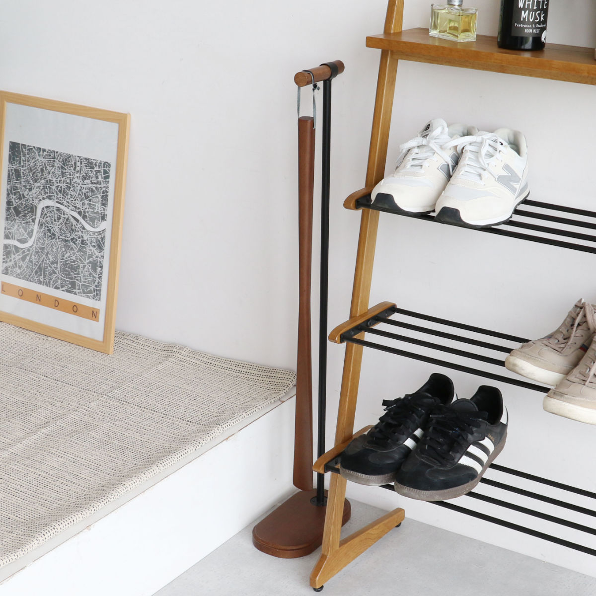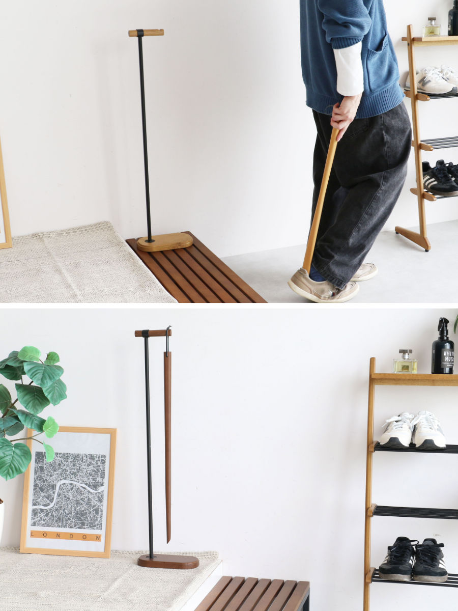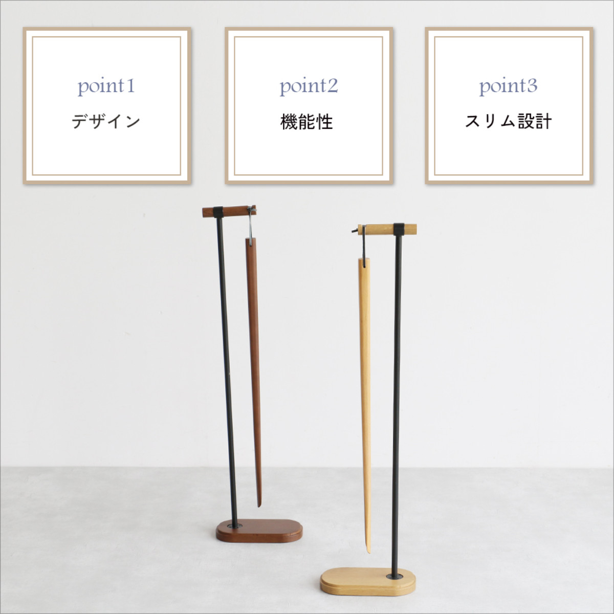 スリムな靴ベラを専用のスタンドに吊り下げて収納でき、使わない時も玄関をスタイリッシュに演出します。浮かせて収納することで靴ベラの先端が床に触れず、清潔に保てるのも嬉しいポイントです。