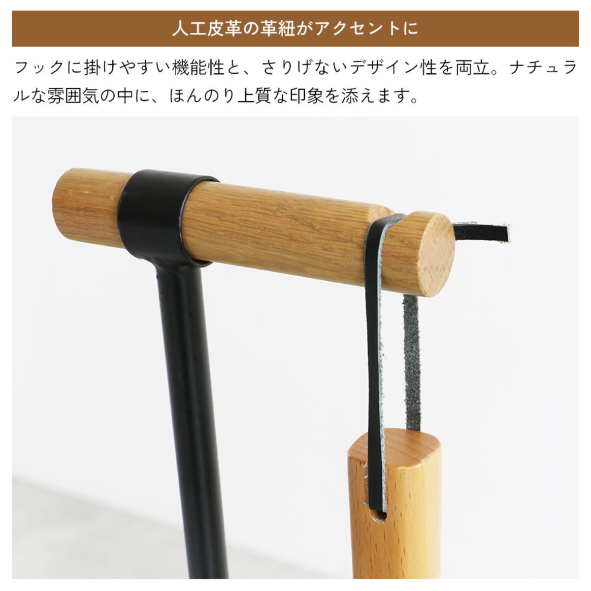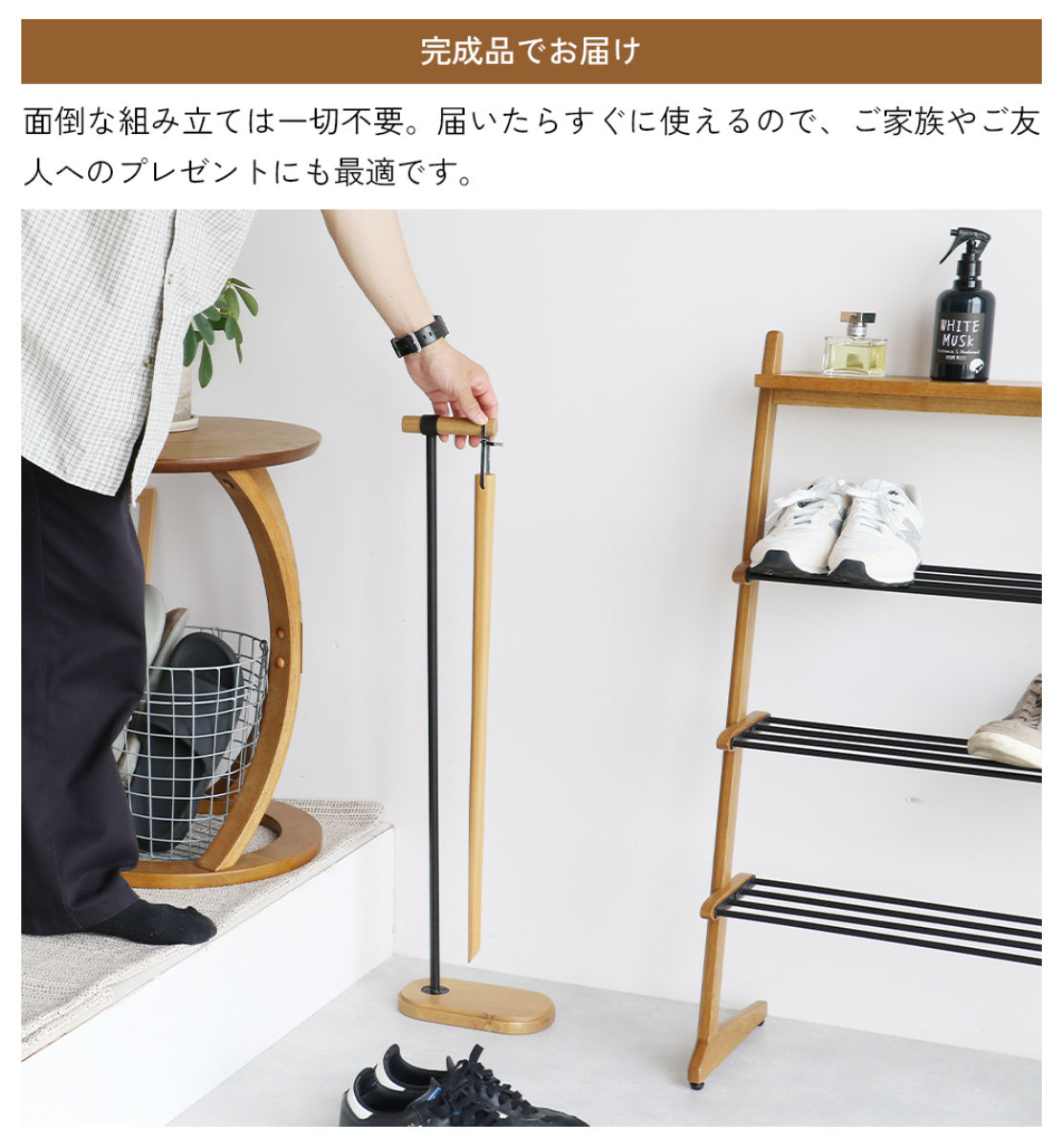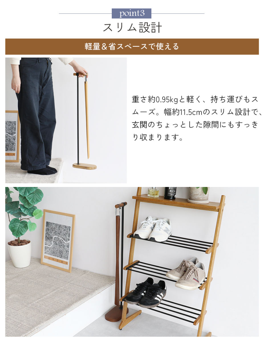 スリムな靴ベラを専用のスタンドに吊り下げて収納でき、使わない時も玄関をスタイリッシュに演出します。浮かせて収納することで靴ベラの先端が床に触れず、清潔に保てるのも嬉しいポイントです。