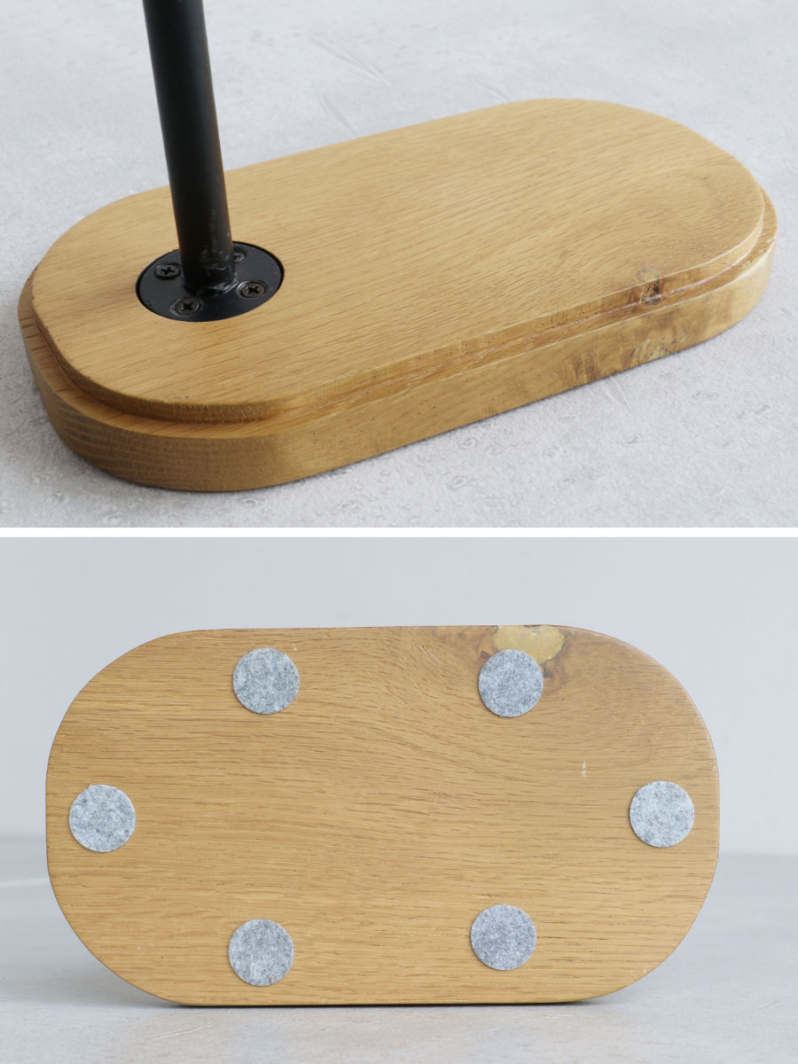 ベースには美しい木目が魅力のアッシュ材を使用。ほどよい重みがあり、ぐらつきにくく安定感があります。底面にはフェルトが施されており、フローリングを傷つけにくい仕様になっています。