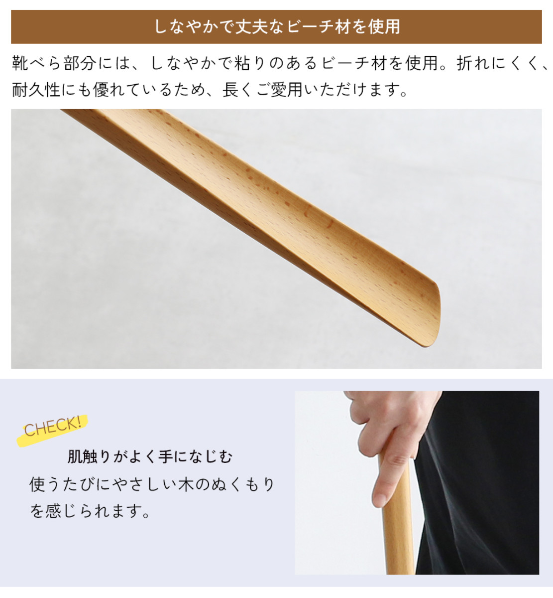 靴ベラ部分にはしなやかで粘りのあるビーチ材を使用しており、折れにくく耐久性にも優れているので長くご愛用いただけます。