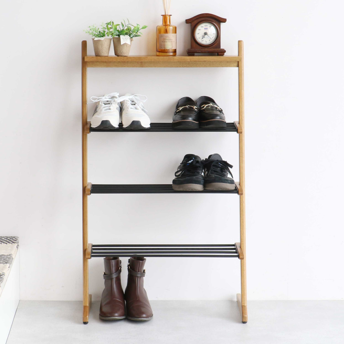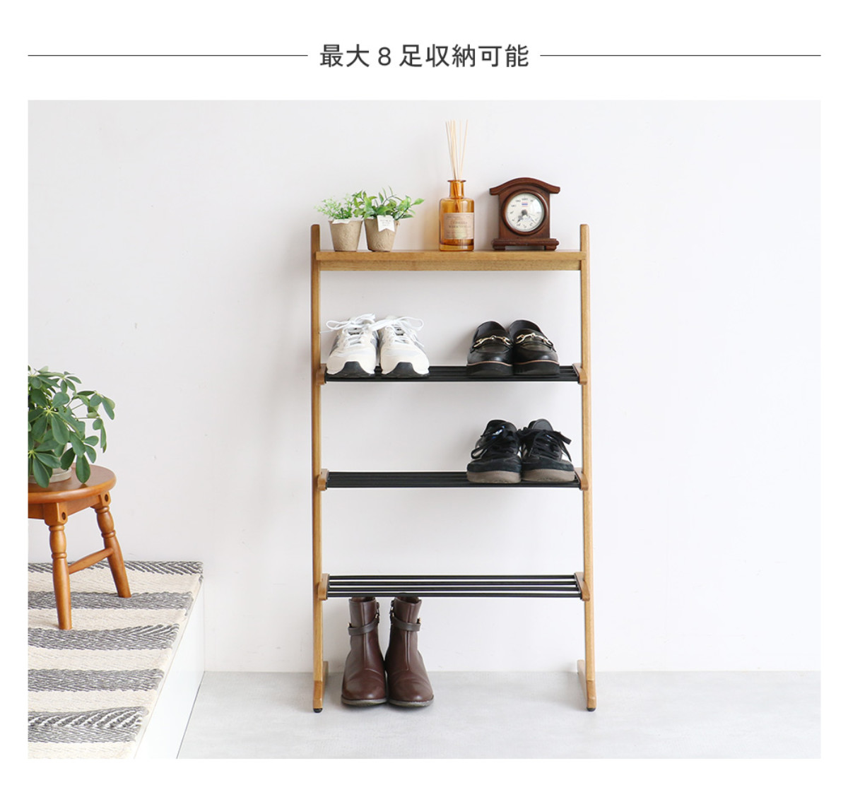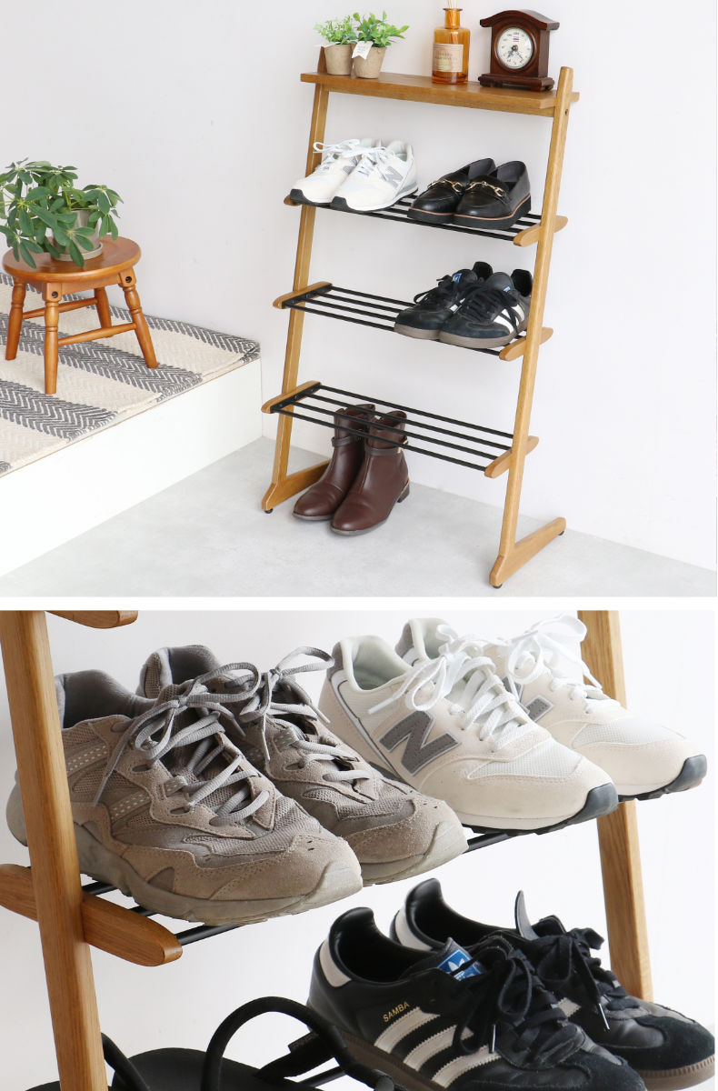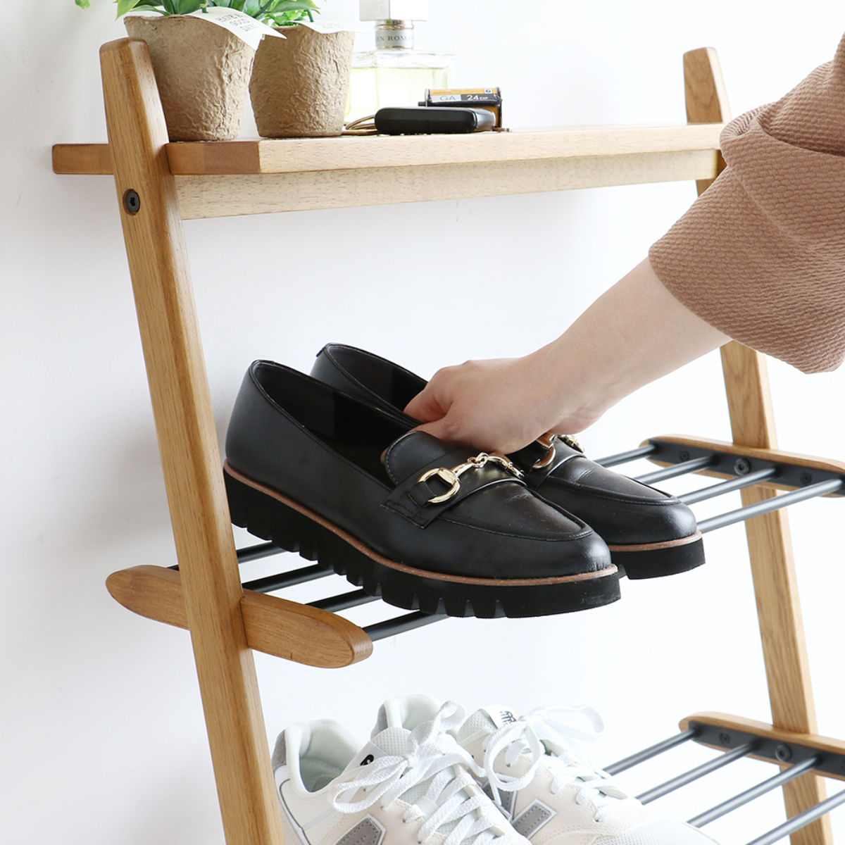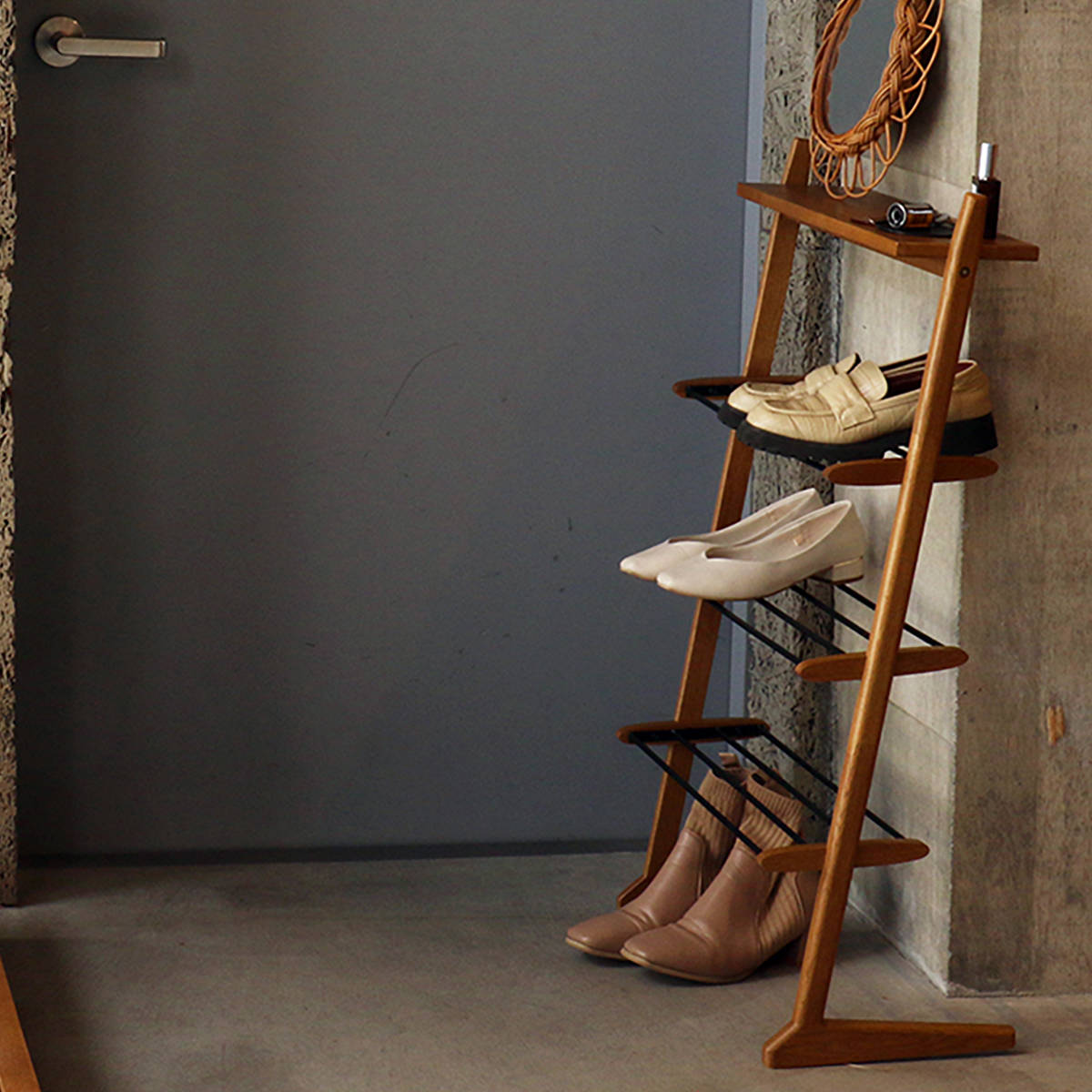 シューズラック Shoes Rack 木製 省スペース ( 靴 収納 ラック 下駄箱 靴箱 4段 オープンラック 玄関 コンパクト おしゃれ オーク 天然木 一人暮らし 後付け ラダーラック シューズ アイアン インテリア ディスプレイ 8足 家具 )
