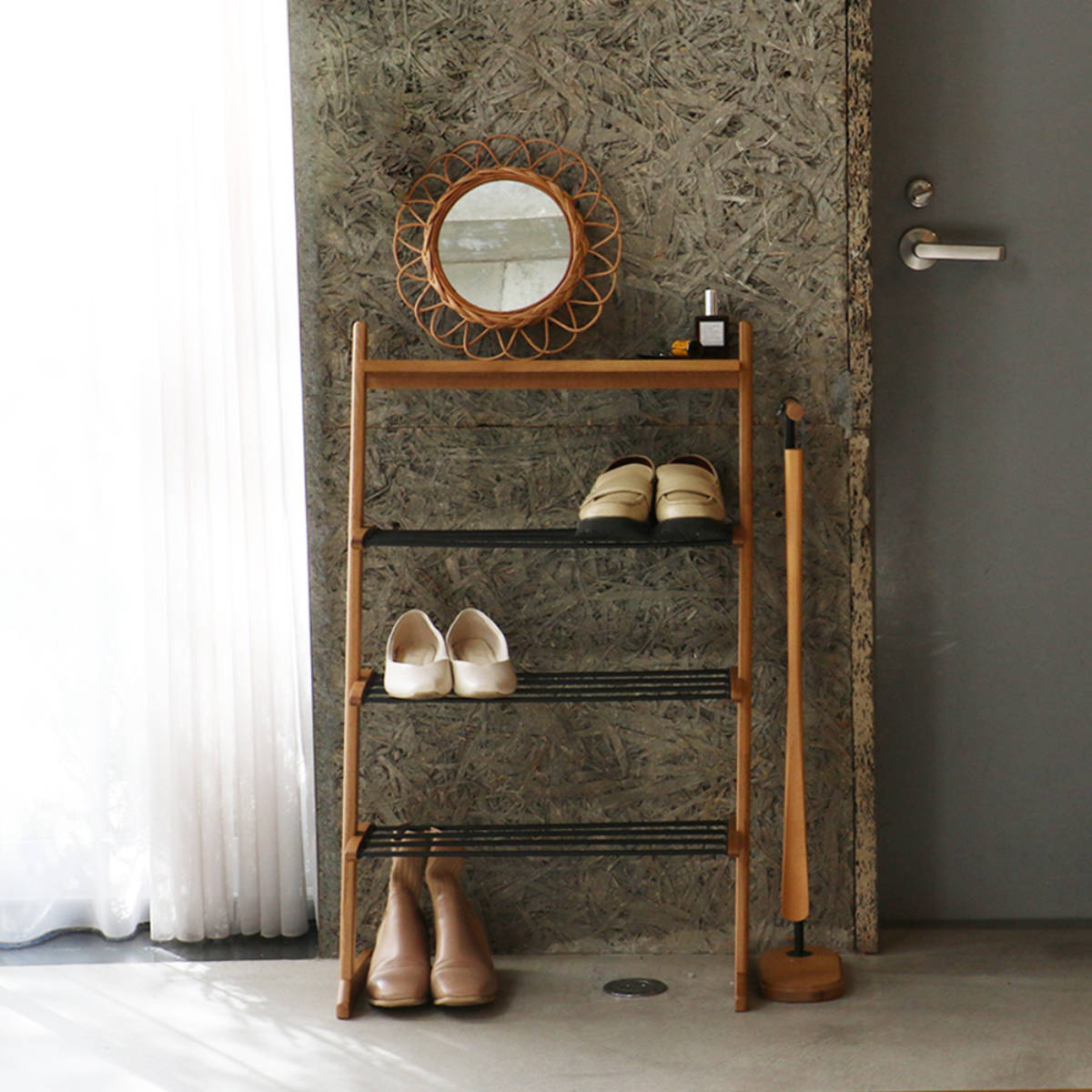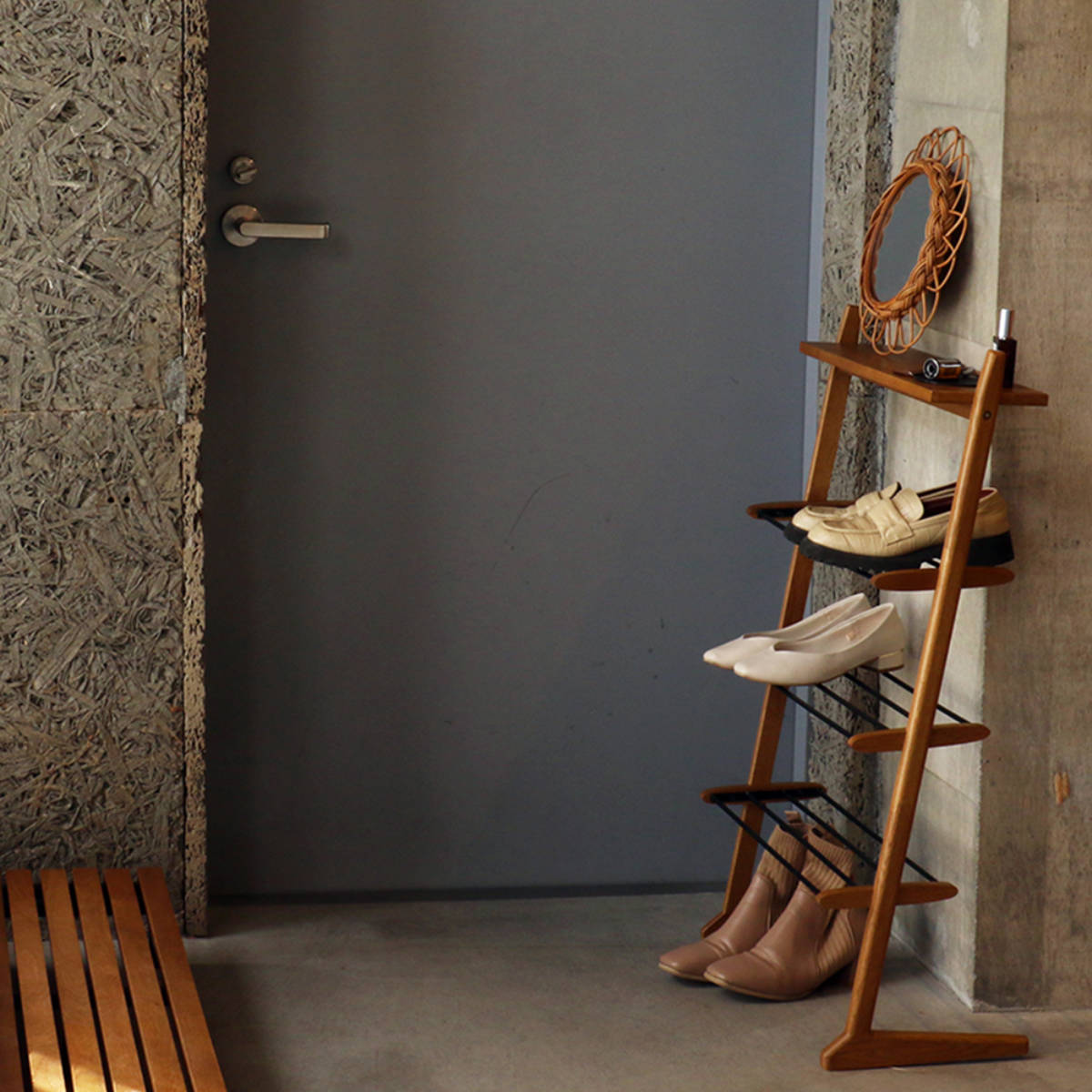 天然木のぬくもりとスチールの質感が絶妙に調和した、どんなテイストのインテリアにも自然と溶け込むデザインです。靴を省スペースに収納でき、ディスプレイも楽しむこともできます。