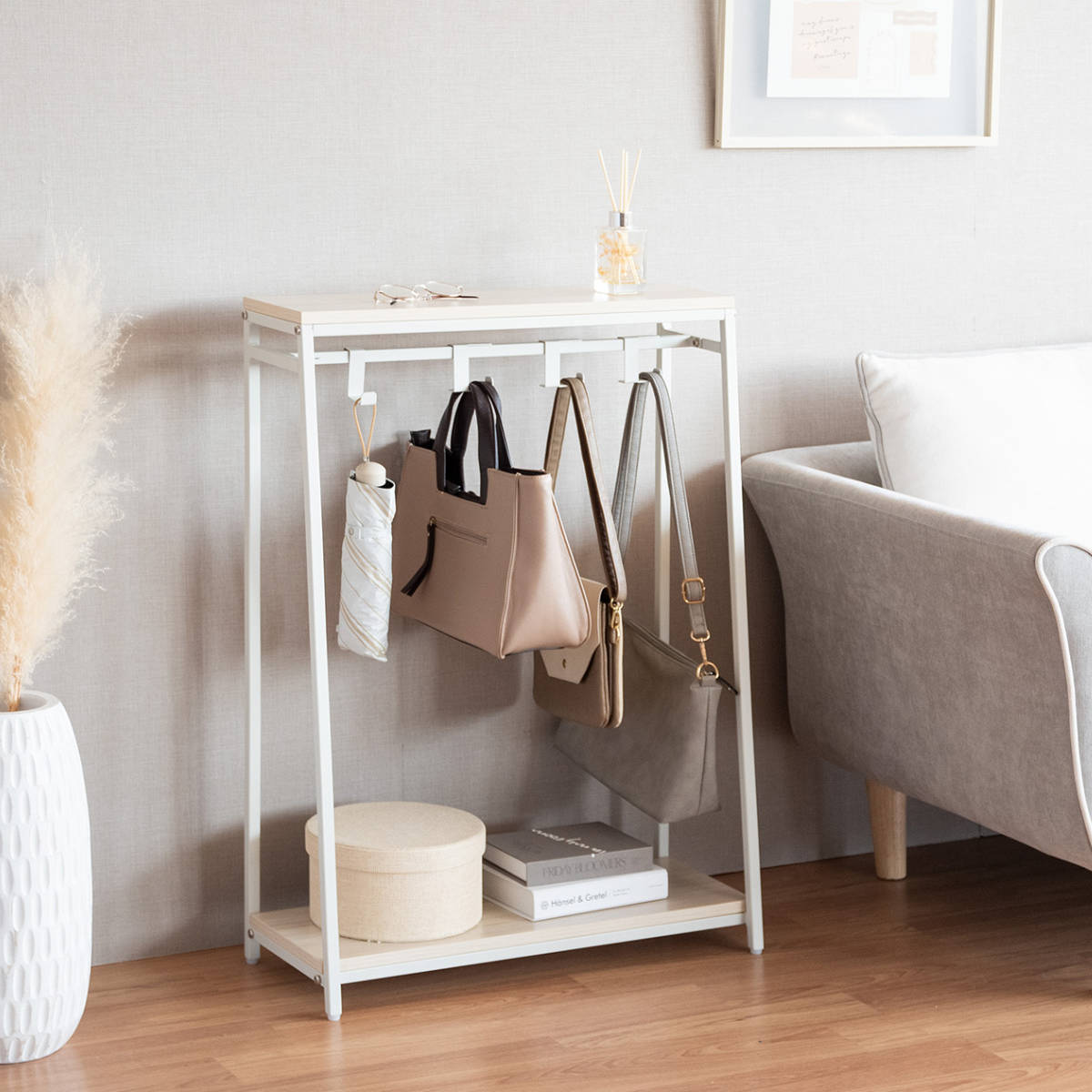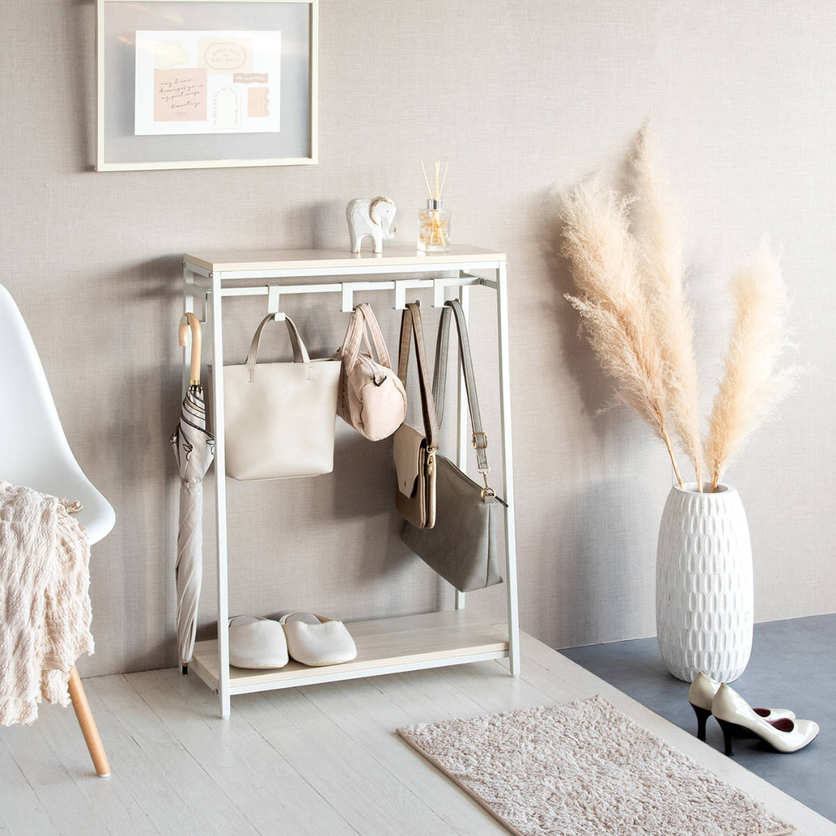 玄関や廊下の空いたスペースにカバンをまとめて置けるバッグラックです。帰宅後、適当な場所に置かれがちなカバンをまとめて収納でき、定位置を決めることでお出かけ時もスムーズに取り出せます。