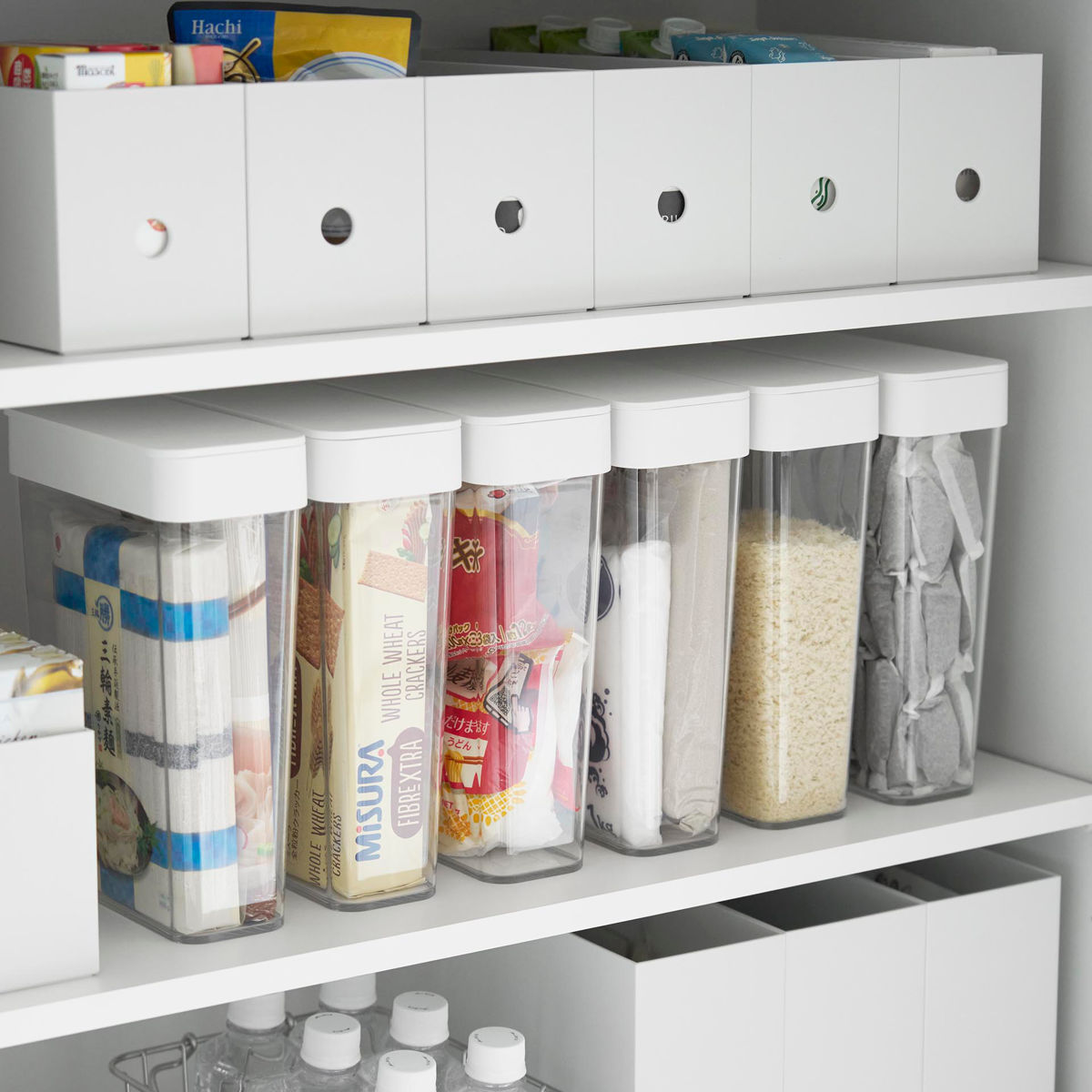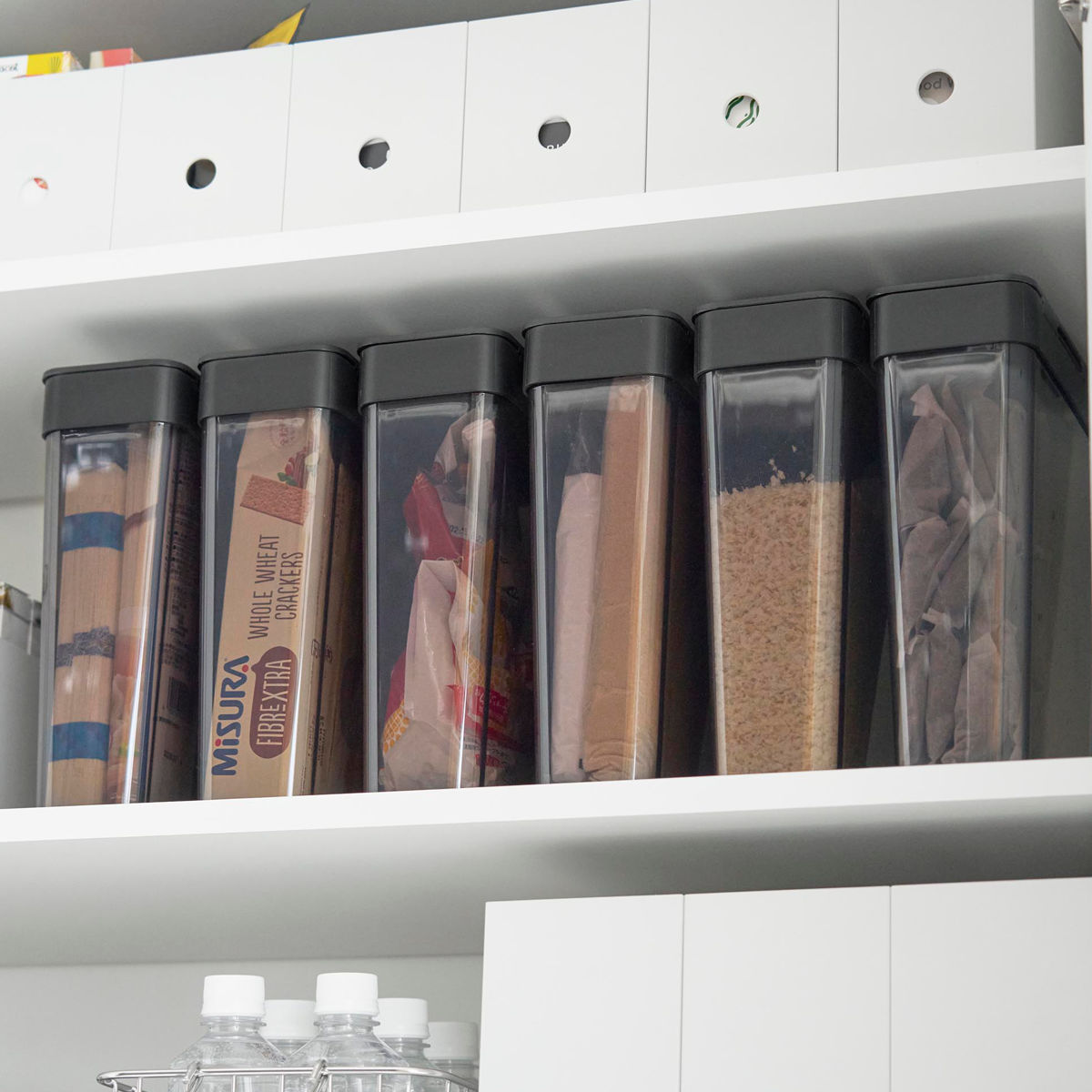 スリムな形状で食器棚やキッチンカウンターの限られた場所にもすっきり収納できます。複数揃えても透明だから中に何が入っているか一目で確認できて、迷わずサッと取り出すことができます。