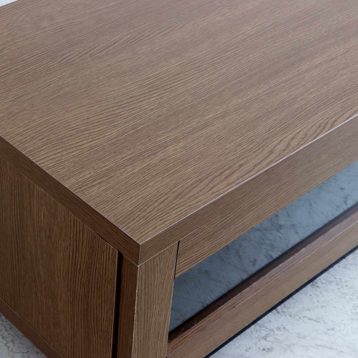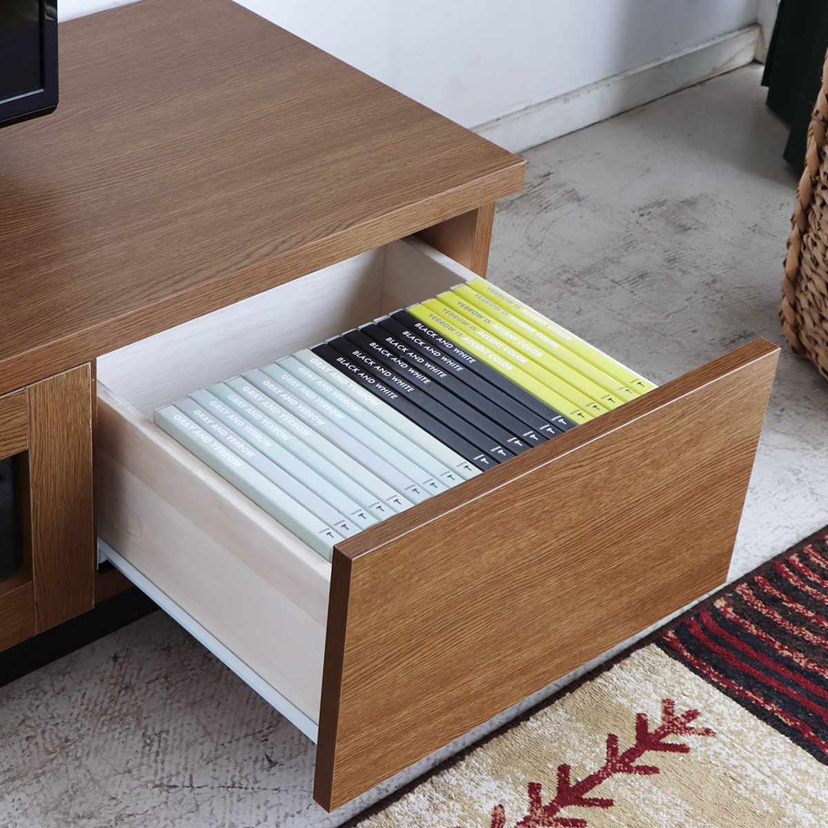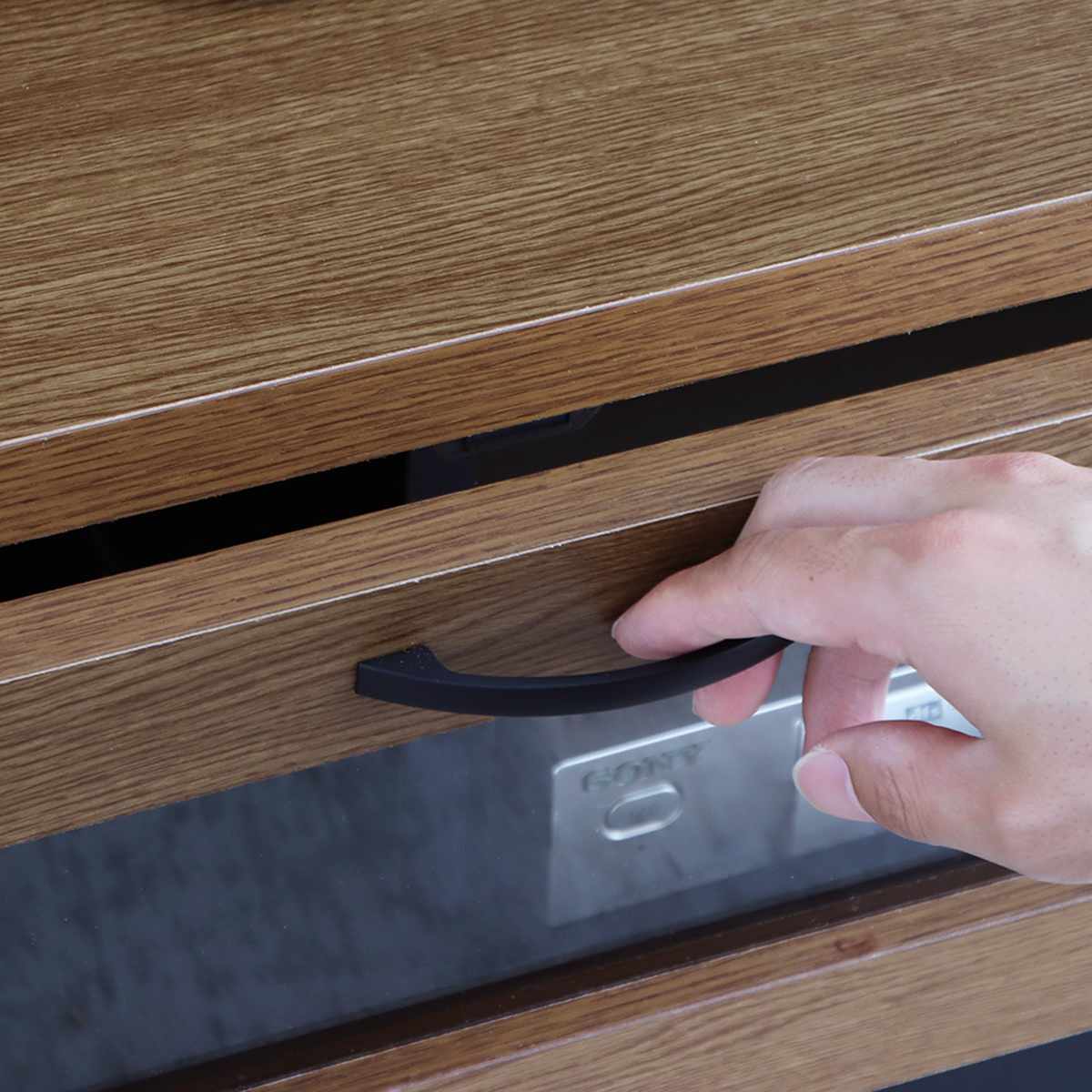 リビング周りの小物をすっきり収納できる、適度な深さの引出しはスライドレール仕様でスムーズに開閉できます。隠す収納で生活感を抑え、落ち着いた印象になります。