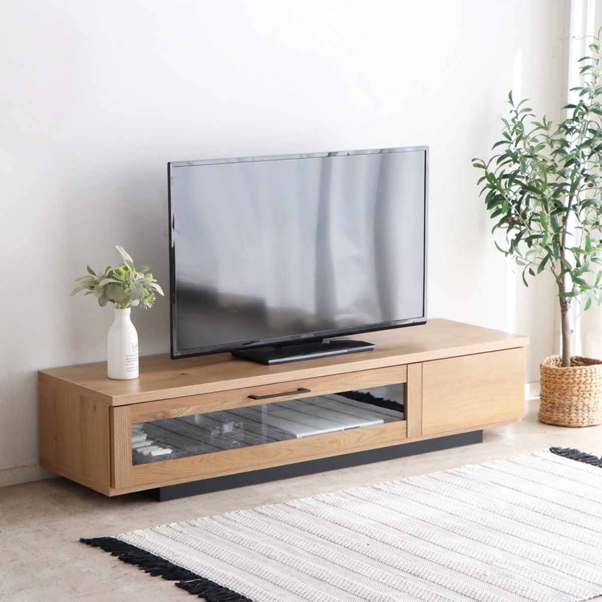 落ち着いた木目調とスッキリとしたフォルムが魅力的なローボードです。高さを抑えたロータイプで、お部屋に開放感を与えながら大型テレビにもバランスよくフィットします。奥に配置した脚部が、まるで浮いているような軽やかさを演出します。