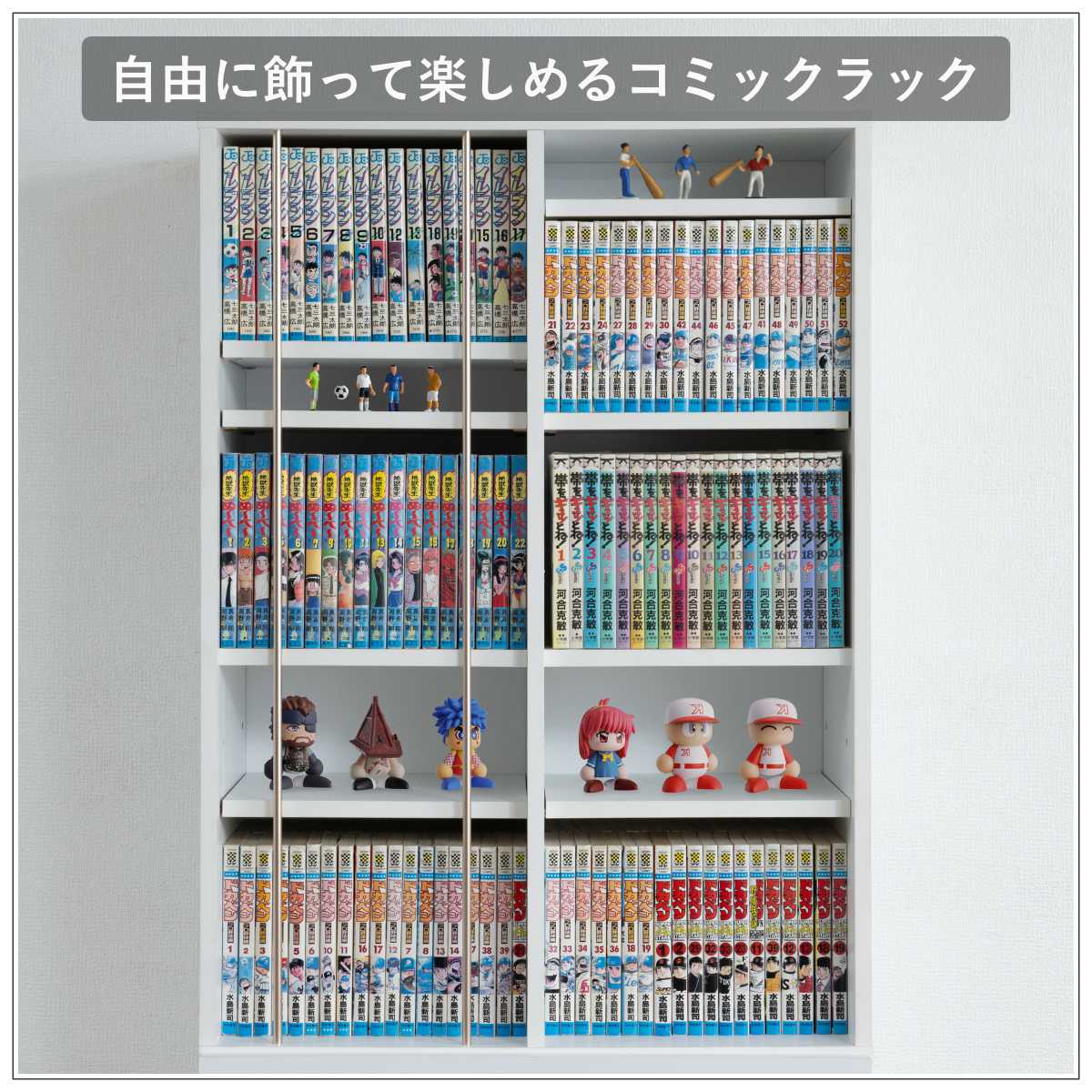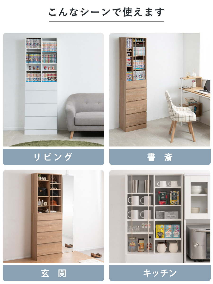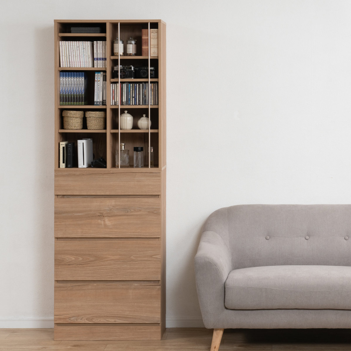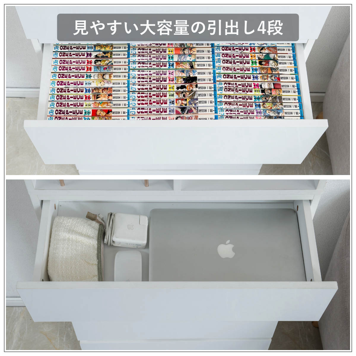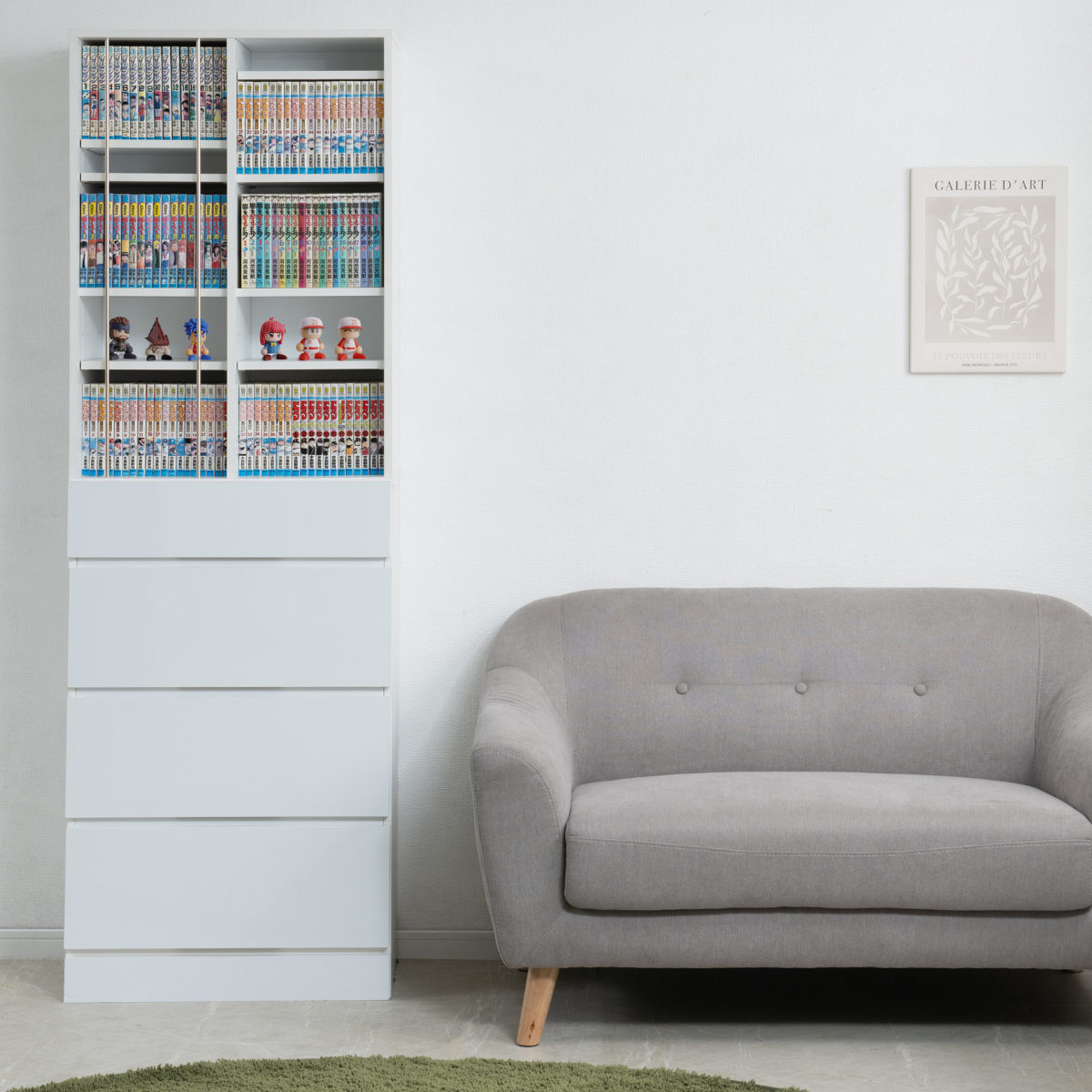 上段のオープン棚にもたっぷりコミック本が収納できますが、引き出しが4段付いているので、さらに収納の幅が広がります。隠して収納したい小物類はもちろん、日焼けやホコリから守りたい大切なコミック本も収納できます。