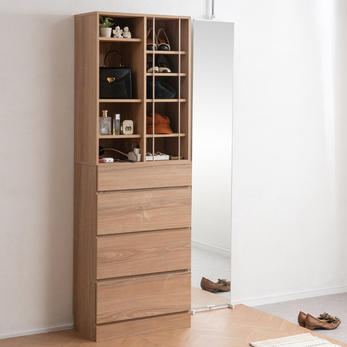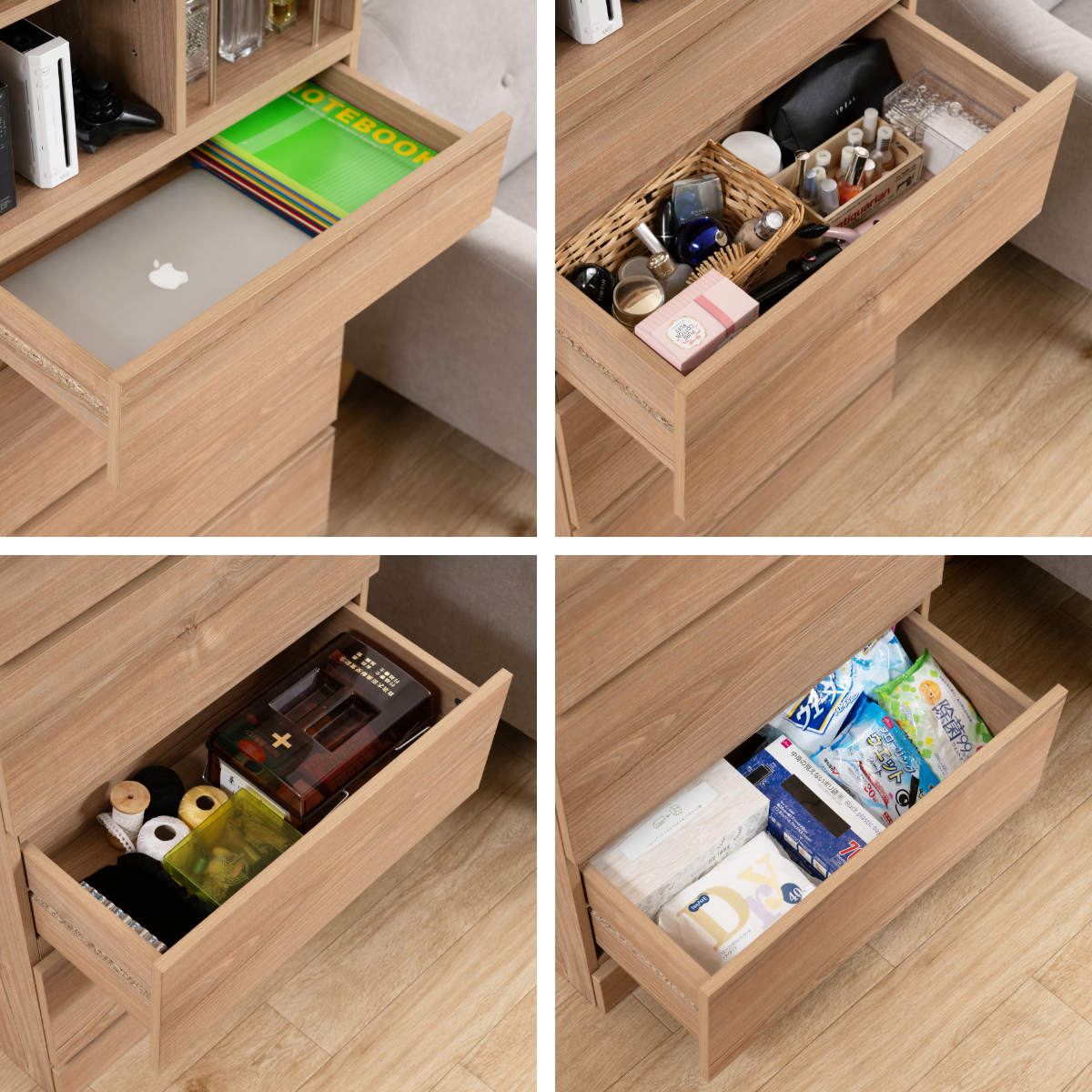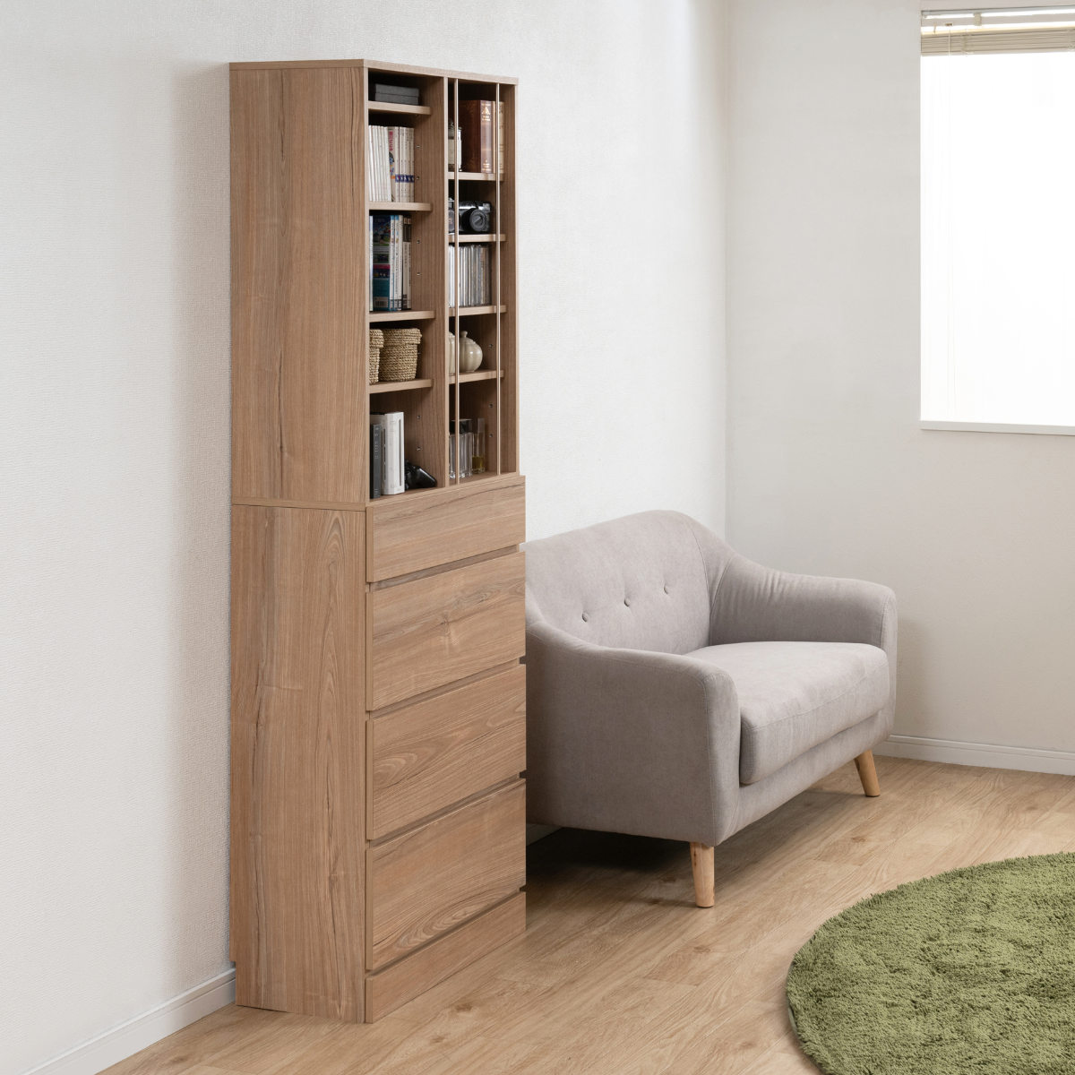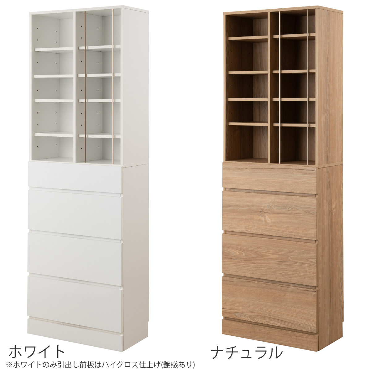 上段のオープン棚にもたっぷりコミック本が収納できますが、引き出しが4段付いているので、さらに収納の幅が広がります。隠して収納したい小物類はもちろん、日焼けやホコリから守りたい大切なコミック本も収納できます。