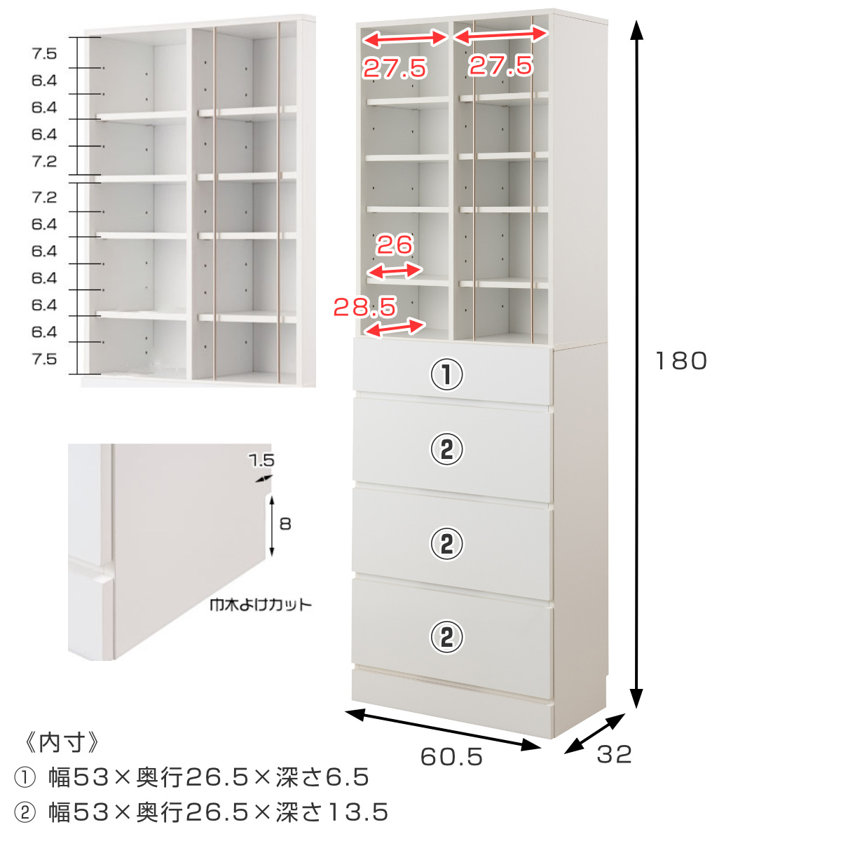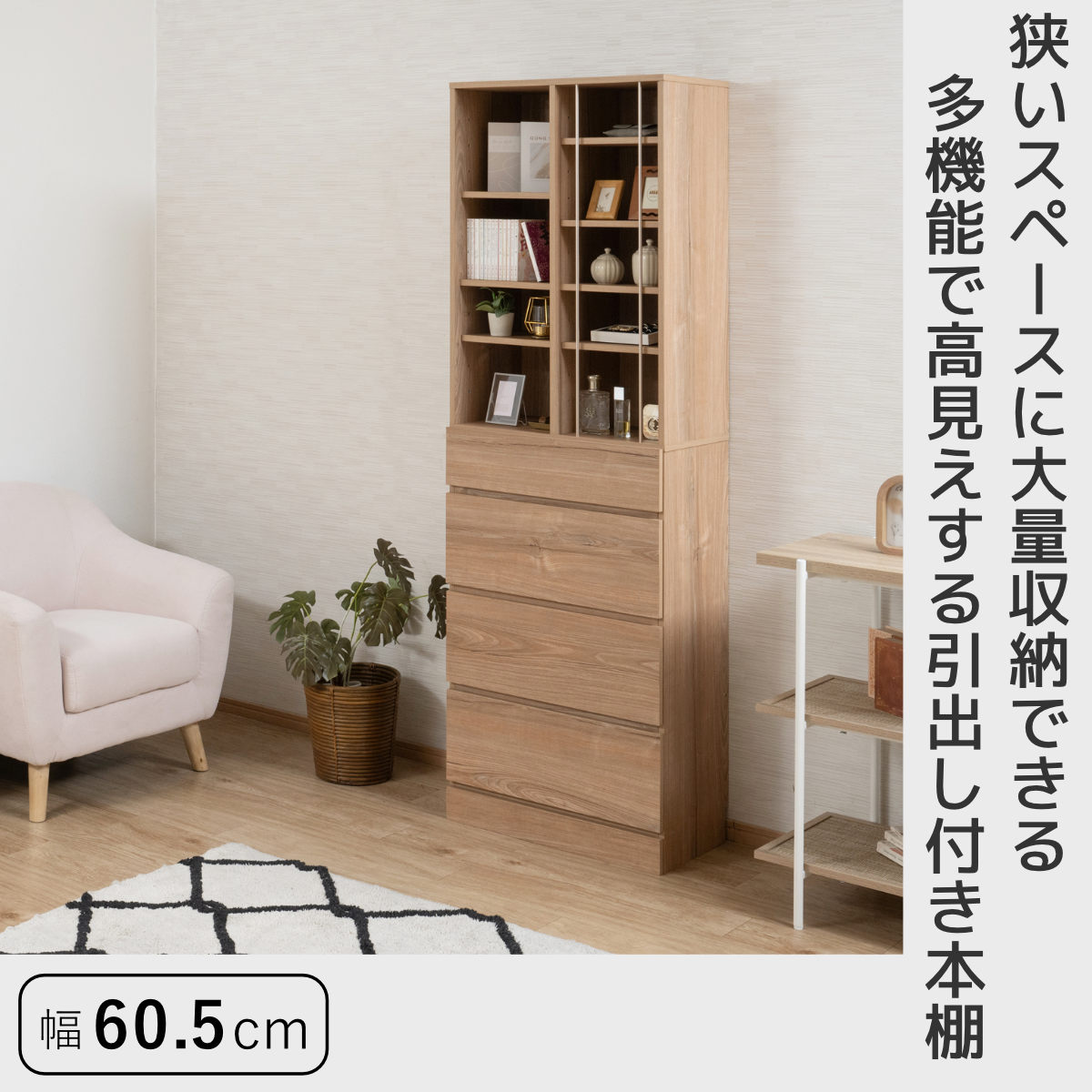 本棚 幅60.5cm 大容量収納 引き出し付き ディスプレイ ( コミックラック 引き出し 4段 コンパクト 可動棚 収納棚 リビング収納 玄関収納 キッチン収納 書斎 収納家具 木目調 ホワイト ) 【ホワイト】