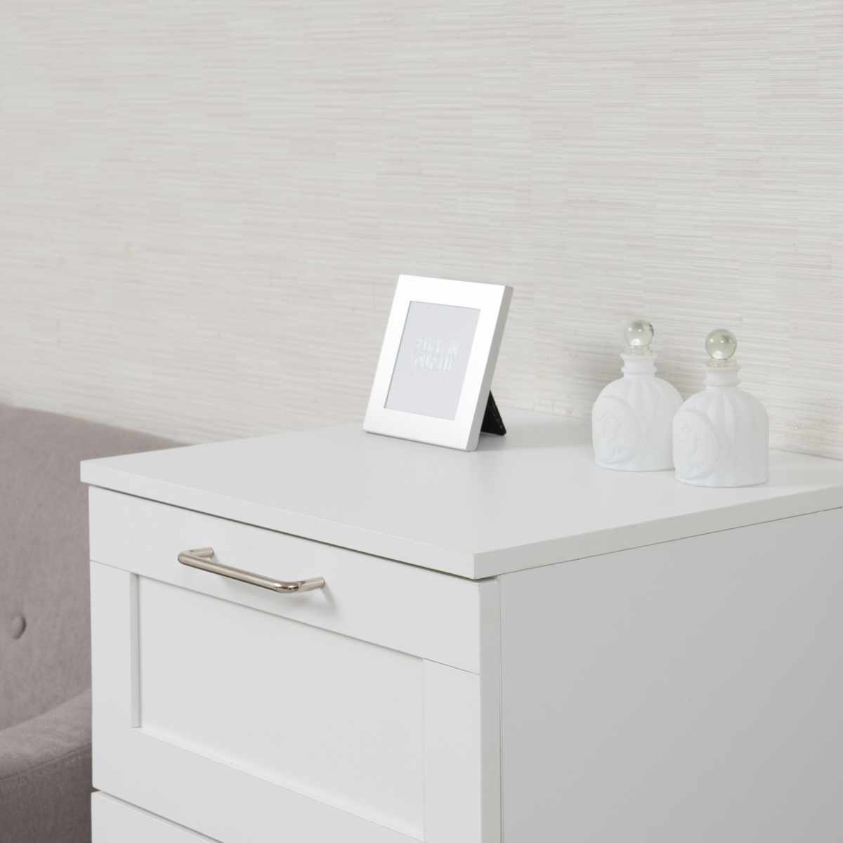 白を基調にしたチェストに、控えめなシルバーの取っ手がアクセントになり、上品な雰囲気を引き立てます。