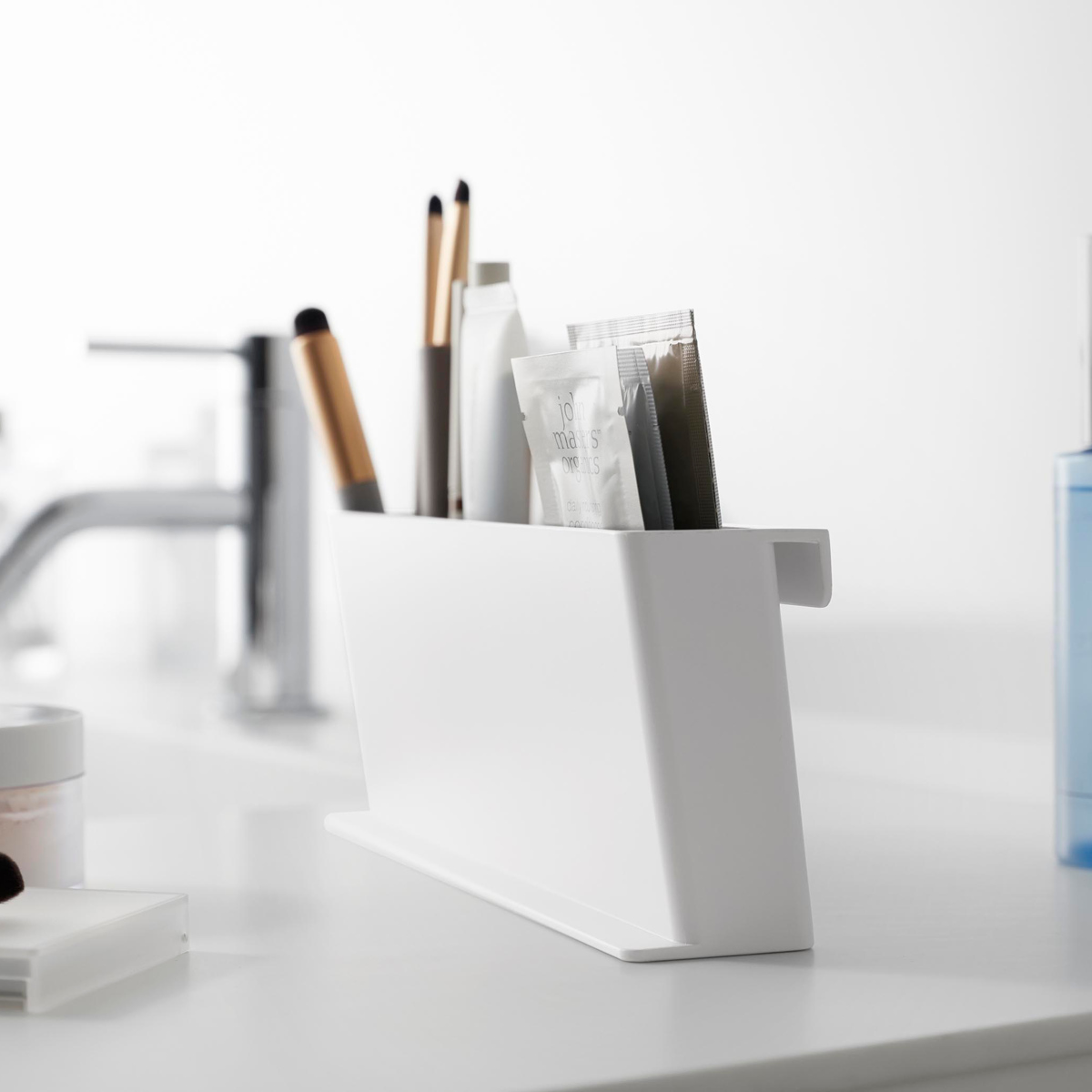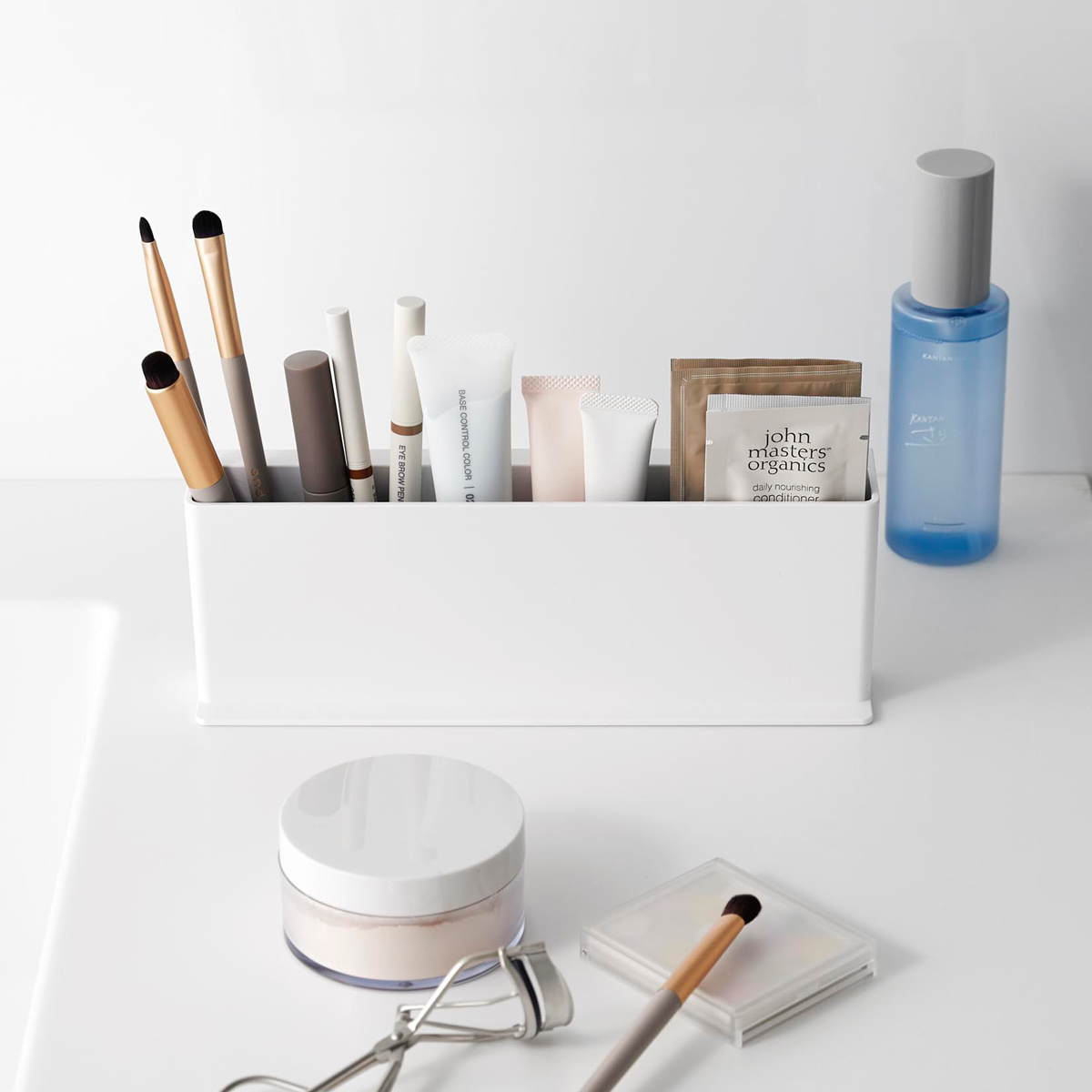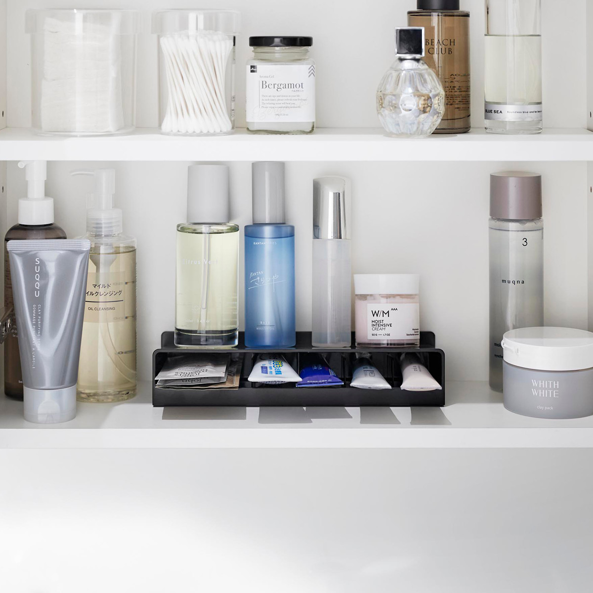 縦置き・横置きどちらでも使えるミニチューブスタンドです。横置きにすれば、仕切り部分にチューブ類を、上面には化粧水やボトルを収納可能です。使う場所や収納スペースに合わせて自由に設置できます。