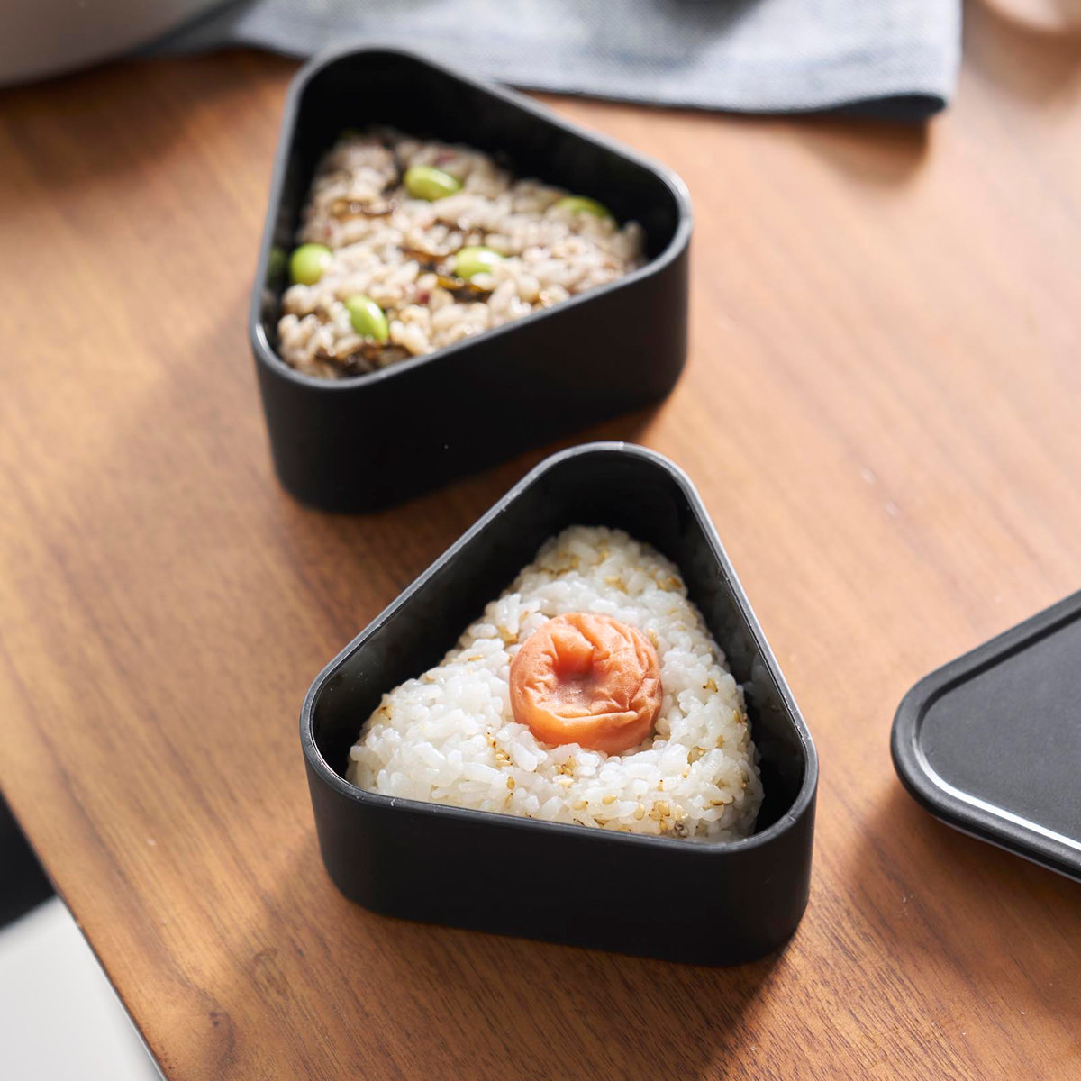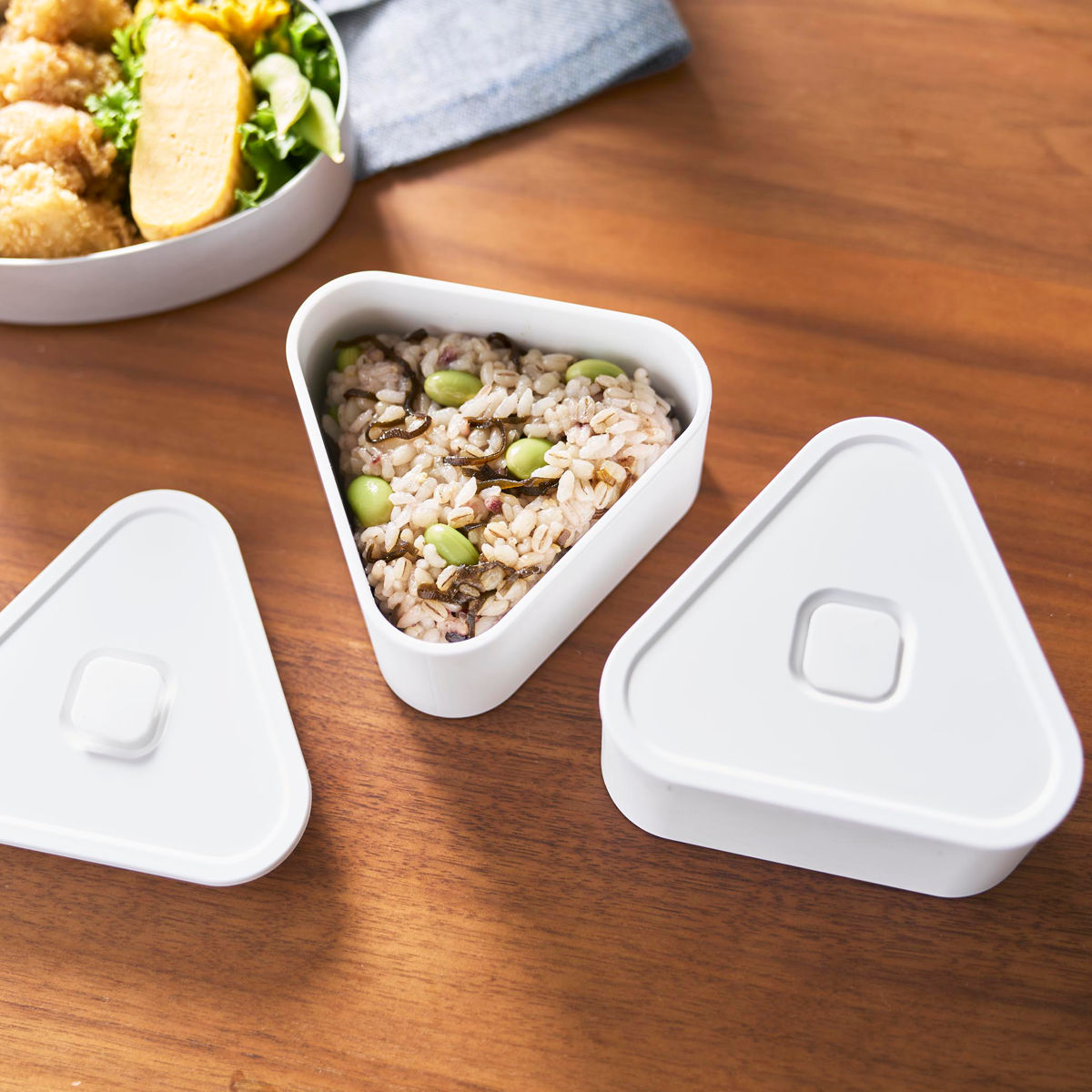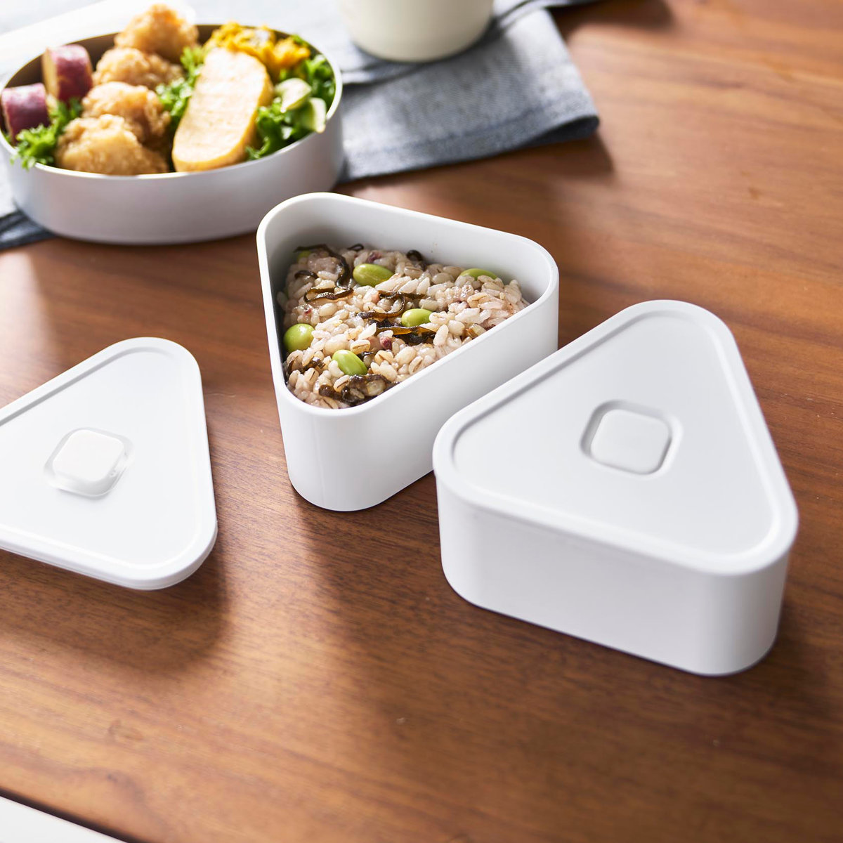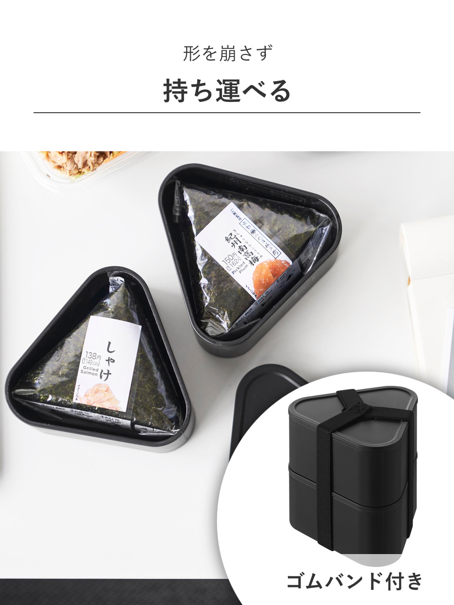 コンビニのおにぎりもきれいな形のまま収納できます。ワンプッシュでしっかり密閉でき、ゴムバンド付きで持ち運びも安心です。