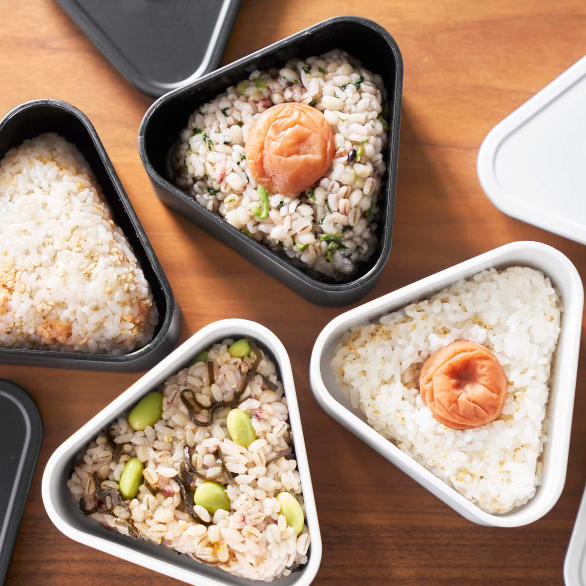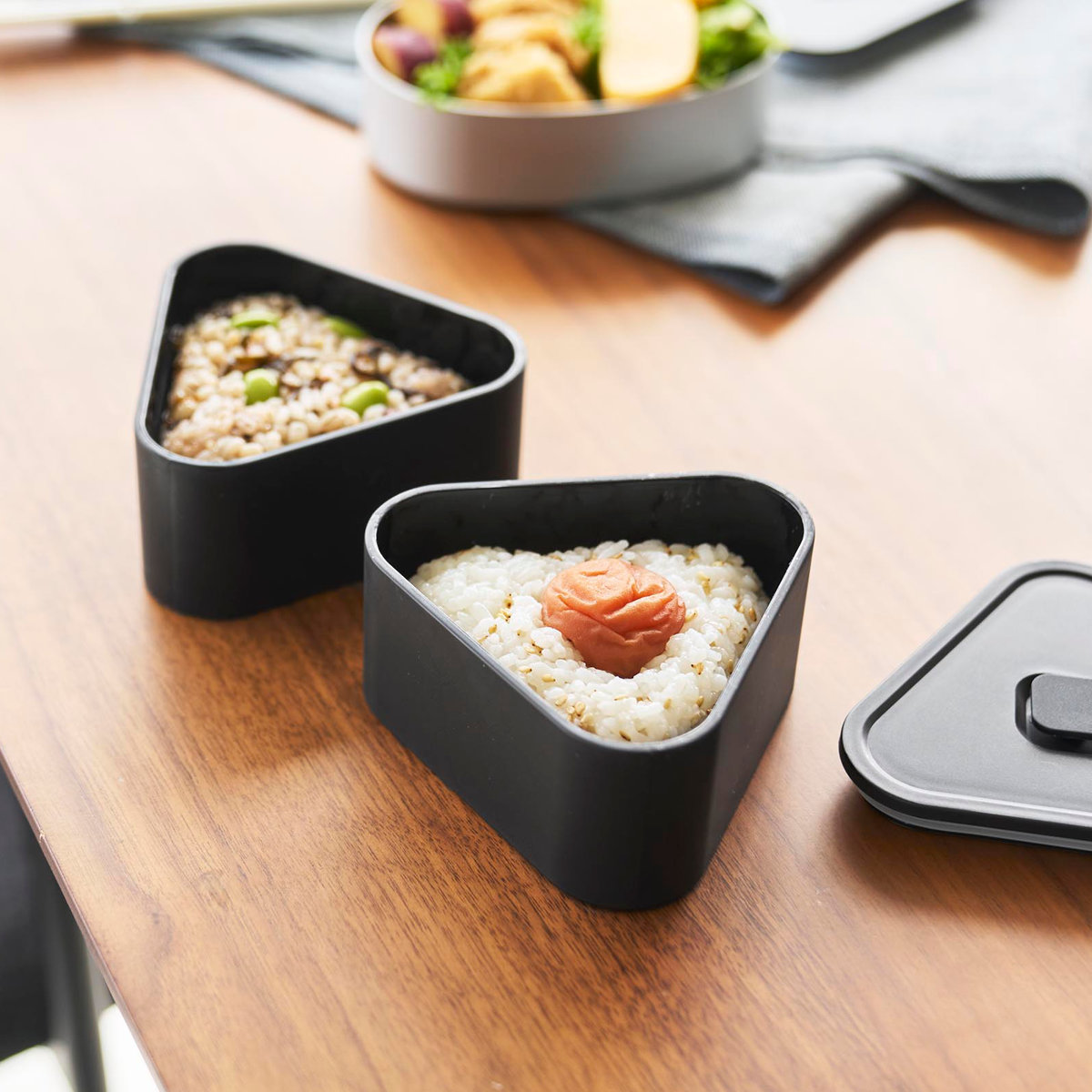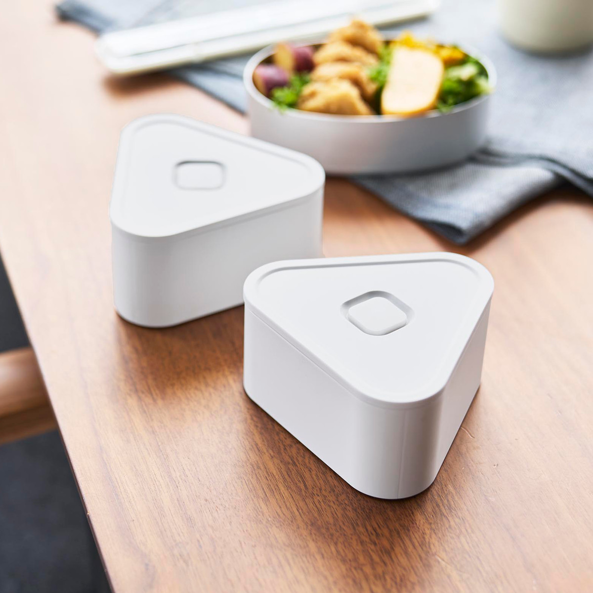 コンビニのおにぎりもきれいな形のまま収納できます。ワンプッシュでしっかり密閉でき、ゴムバンド付きで持ち運びも安心です。