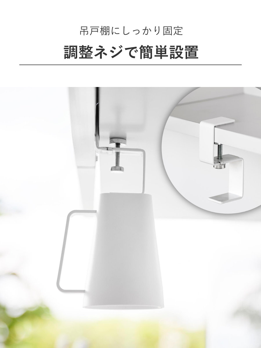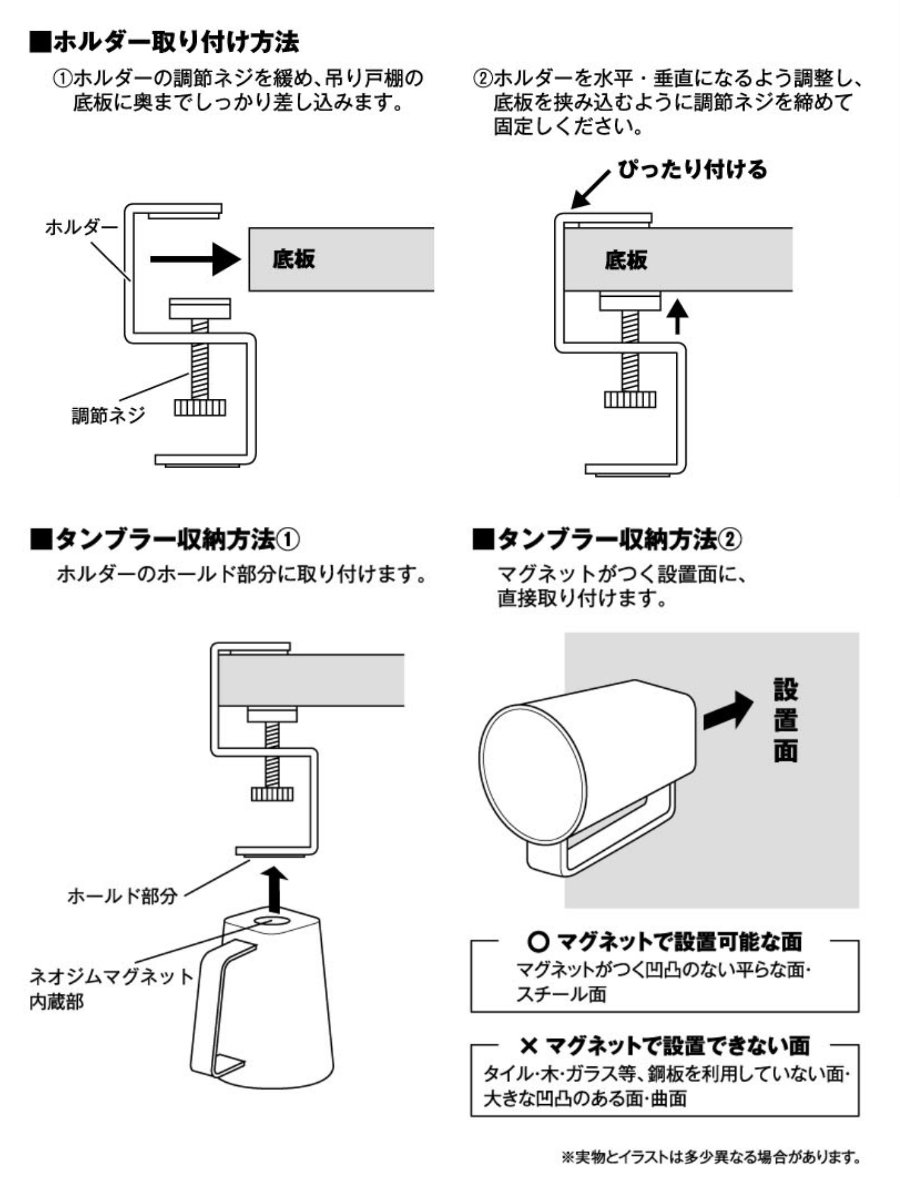 ホルダーは厚さ約1.3~3cmまでの吊戸棚に調節ネジで設置でき、しっかり固定できます。タンブラーはマグネットがつく壁面などに直接取り付けて収納することもできます。