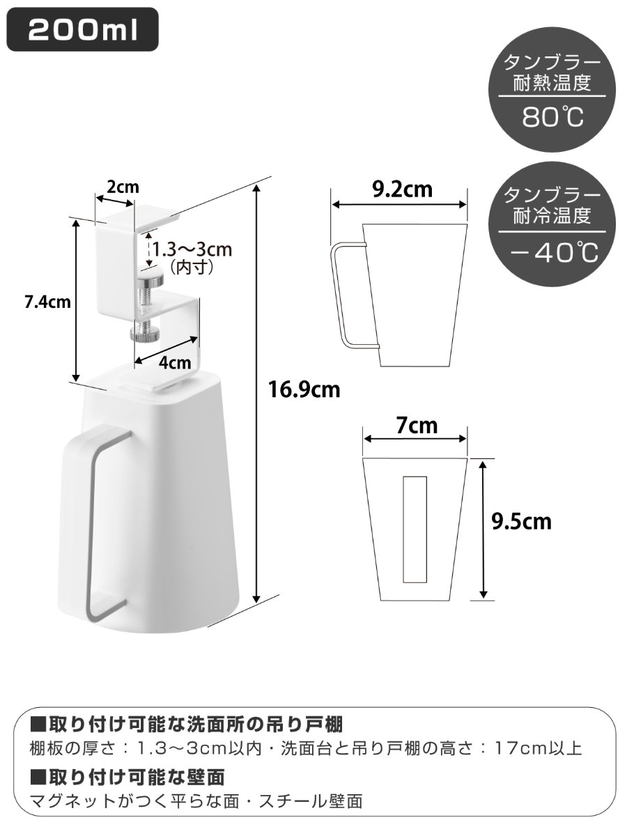 | 材質 | タンブラー:ABS樹脂、ネオジムマグネット ホルダー:スチール(ユニクロメッキ+粉体塗装) 滑り止め:シリコーンゴム |
