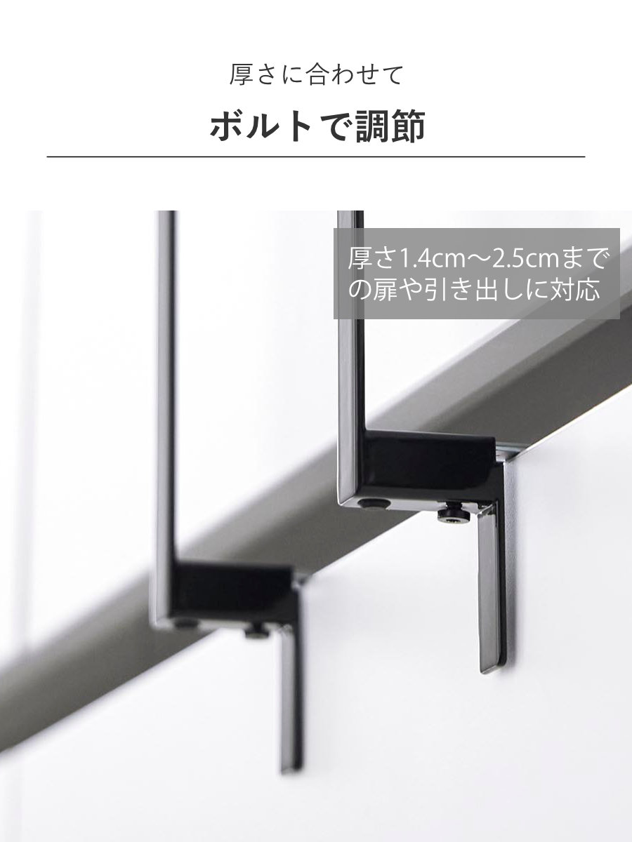 厚さ1.4cm~2.5cmまでの扉や引き出しに合わせて、ボルトで調節し簡単に設置できます。