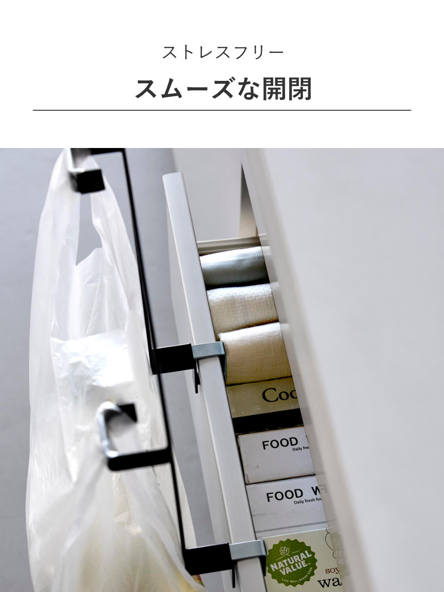 レジ袋を引っ掛けるだけで使え、引き出し開閉時の巻き込みも防止します。