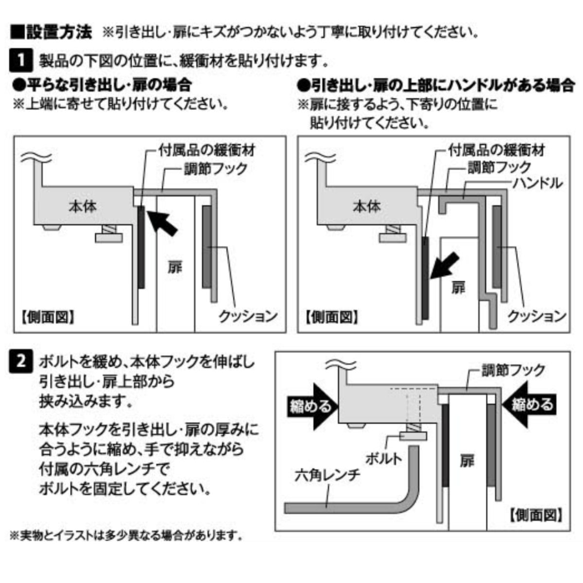 | 注意事項 | ※本製品は屋内の一般的な平面の流し台や洗面台の引き出し・扉を対象にしています。 ※ガラス戸やキズのつきやすい引き出し・扉へのご使用はお避けください。 ※設置する引き出し・扉のサイズや厚さ、形状、材質によっては取り付けできない場合があります。 ※プッシュオープン扉は取り付けできません。 |