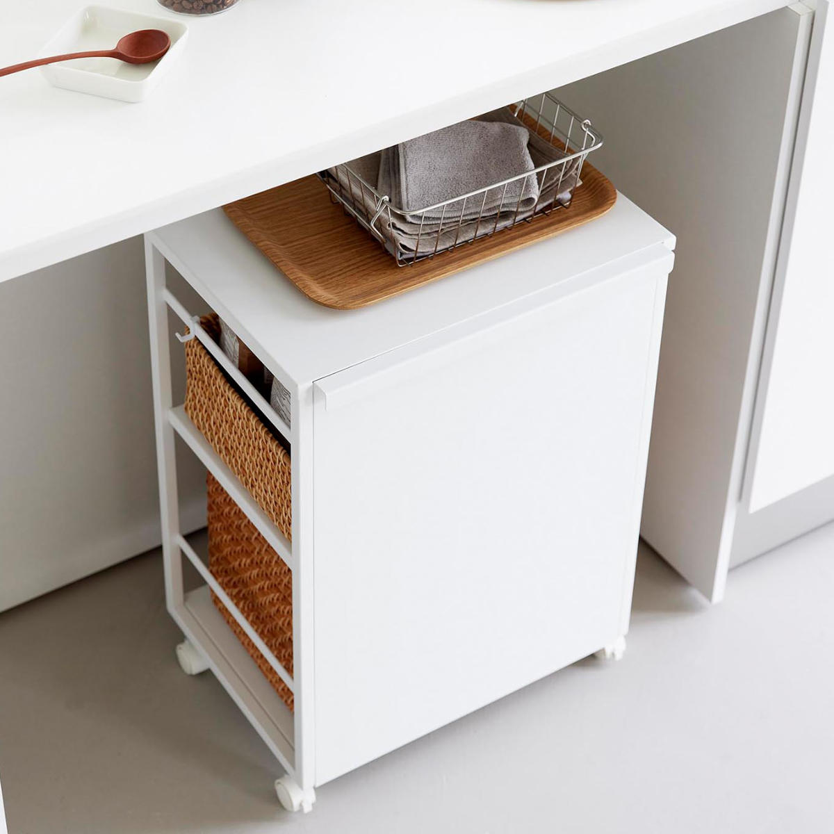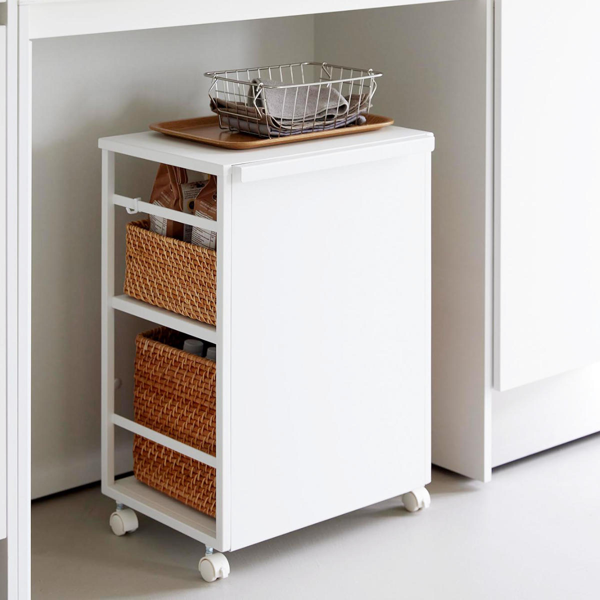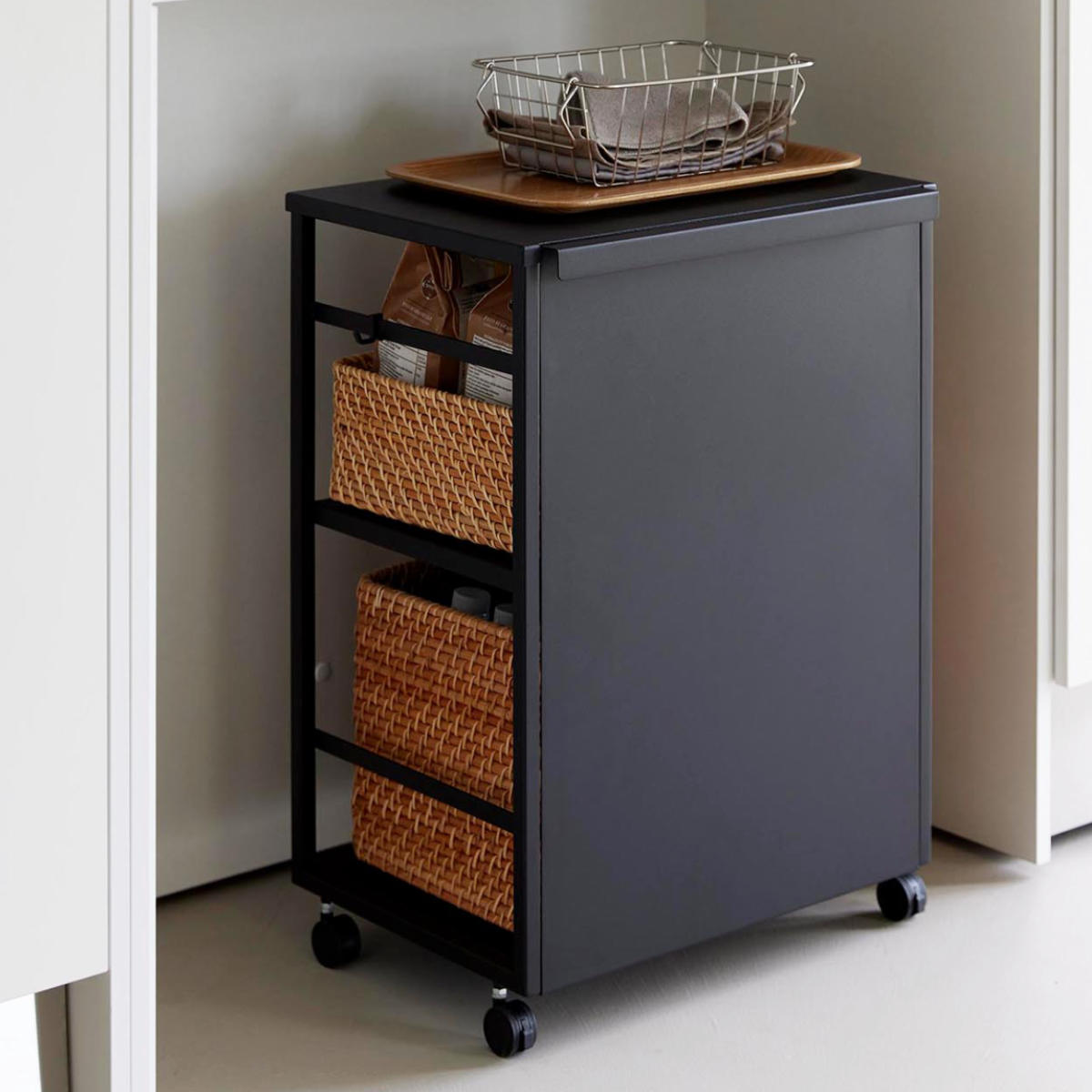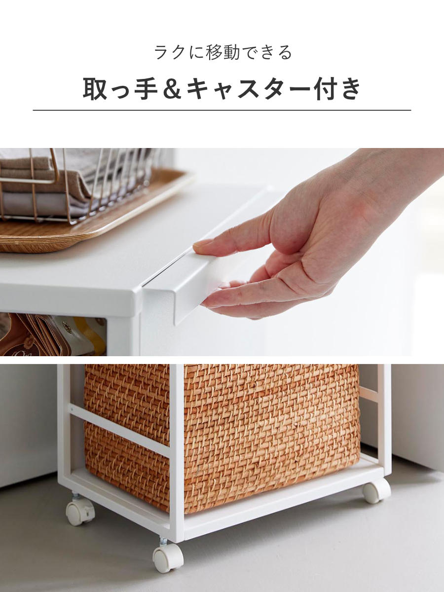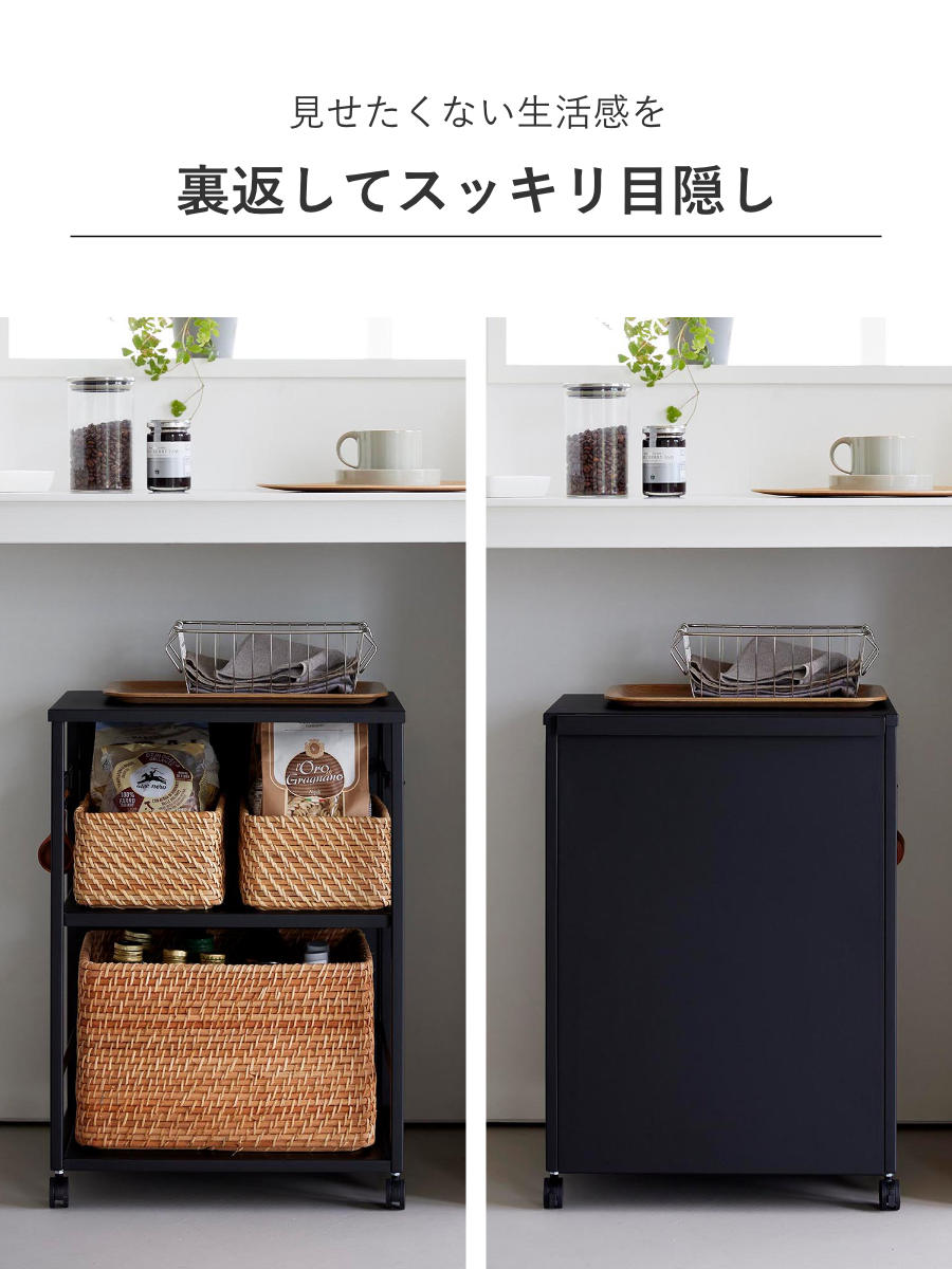 ごちゃつきがちな中身も、使わないときはワゴンを裏返すだけ。前面パネルがスマートに目隠ししてくれます。 よく使うけれど、普段は隠しておきたいアイテムの収納に便利です。