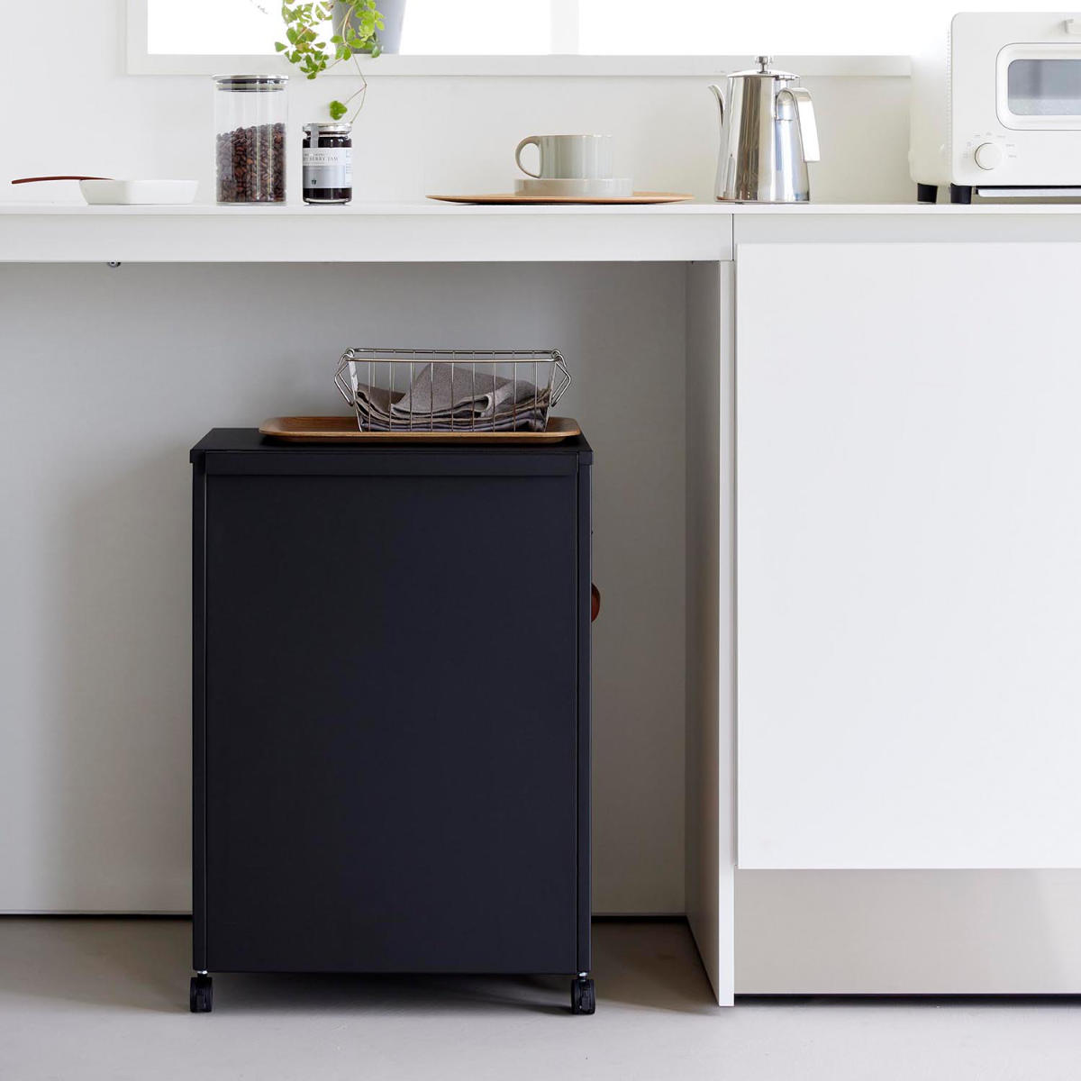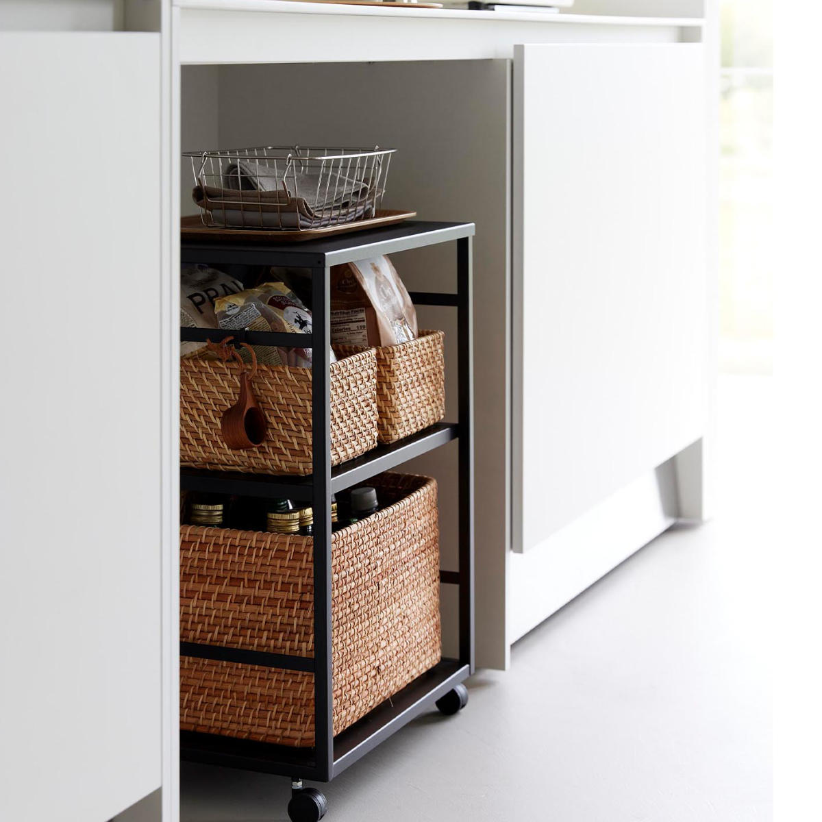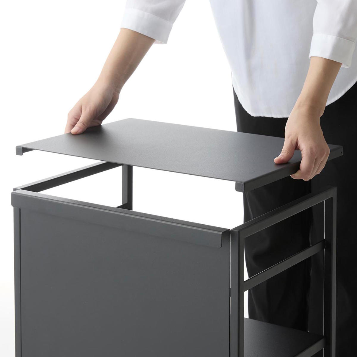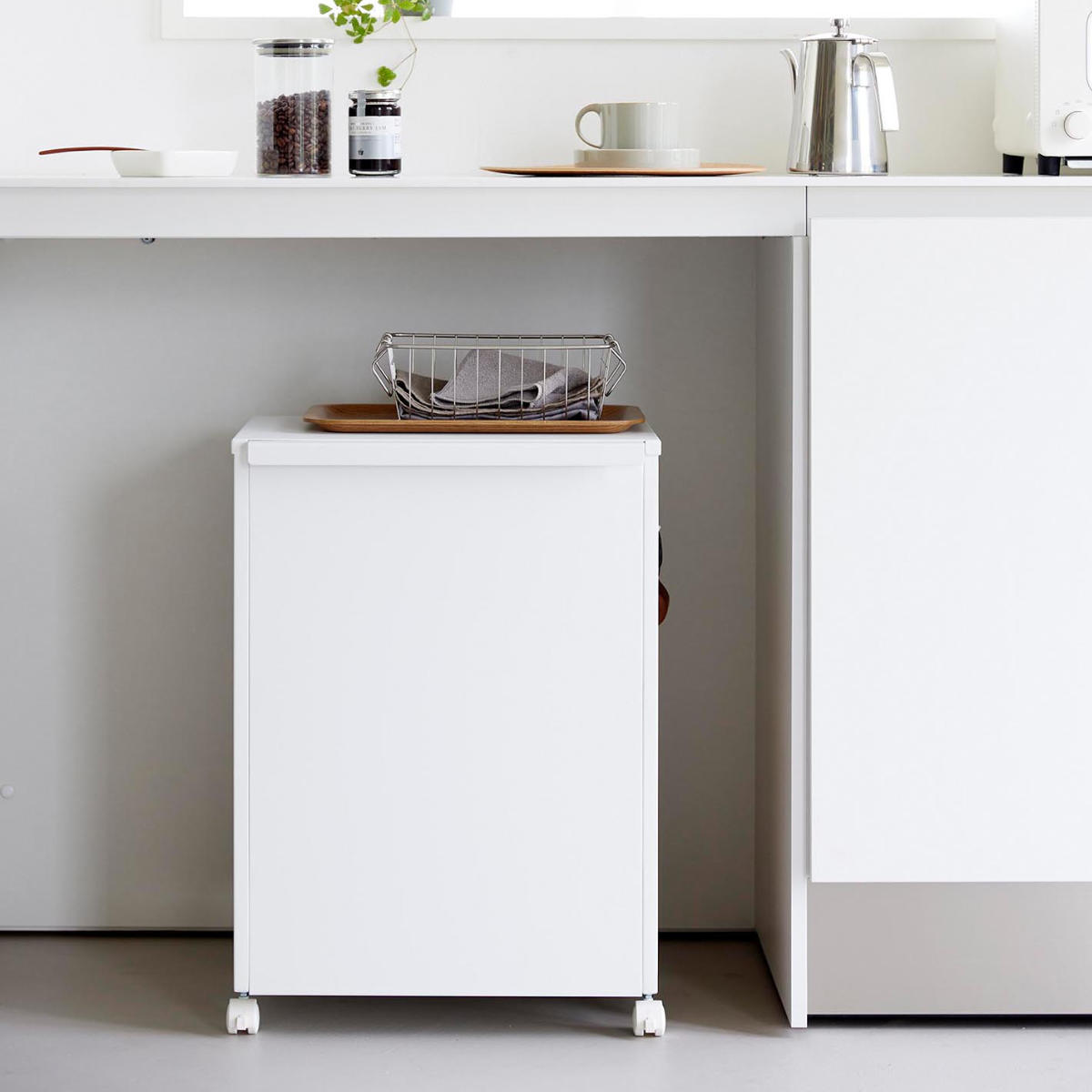ごちゃつきがちな中身も、使わないときはワゴンを裏返すだけ。前面パネルがスマートに目隠ししてくれます。 よく使うけれど、普段は隠しておきたいアイテムの収納に便利です。
