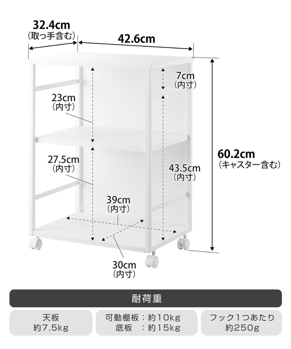 | 耐荷重 | 天板:7.5kg 可動棚板:10kg 底板:15kg フック1つあたり:250g |