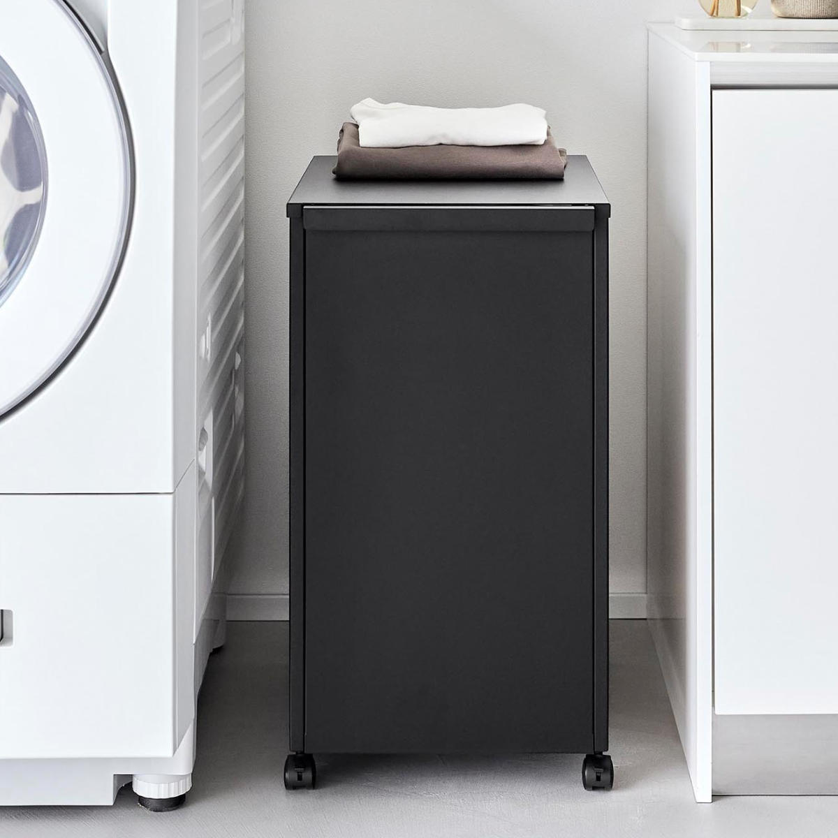 ごちゃつきがちな中身も、使わないときはワゴンを裏返すだけ。前面パネルがスマートに目隠ししてくれます。 よく使うけれど、普段は隠しておきたいアイテムの収納に便利です。