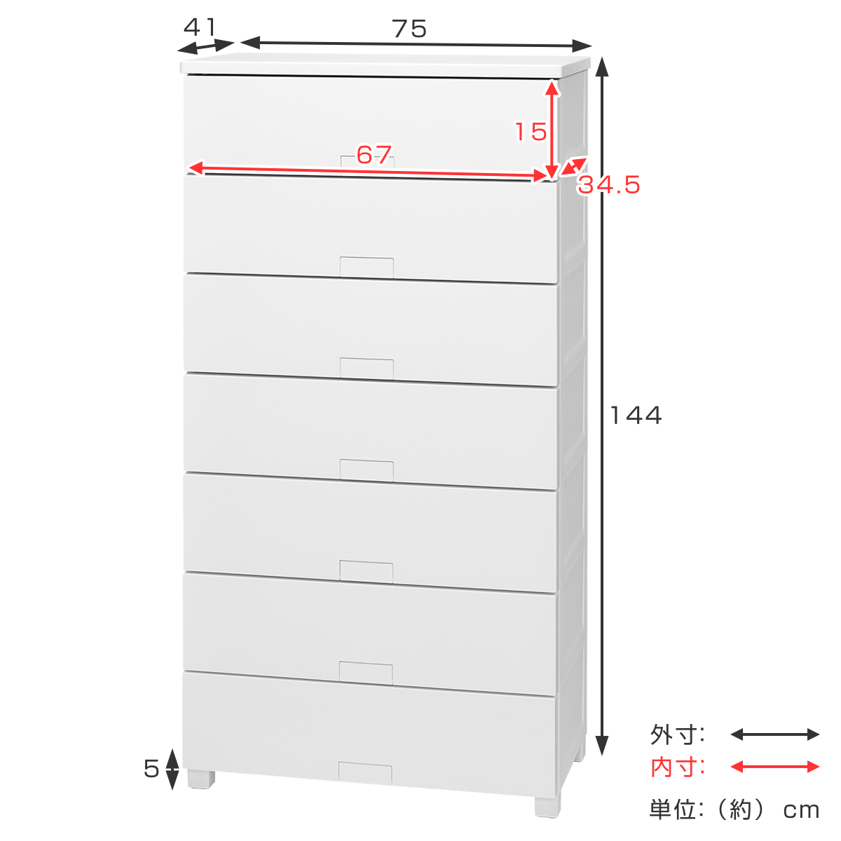 チェスト フィッツチェスト フルフラット 7507 7段 幅75×奥行41×高さ144cm ( タンス 引き出し 収納 衣類収納 完成品 プラスチック 引き出しロック フィッツ 衣装ケース リビング収納 収納ケース 洋タンス ストッパー付き ) 【ホワイト】